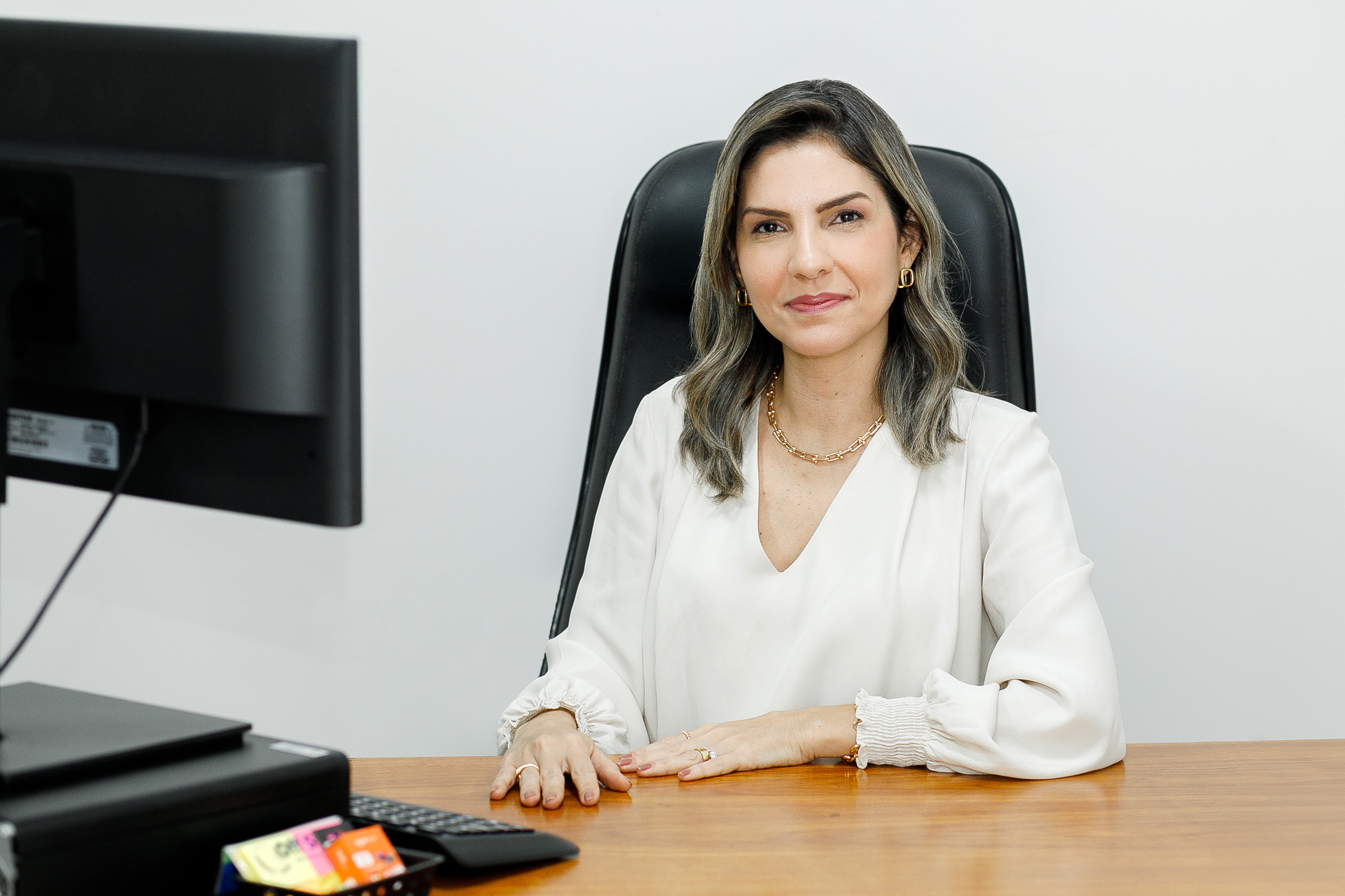 Na imagem, aparece uma mulher vestida de forma elegante, com roupas em tons claros. Ela está sentada à sua mesa de trabalho, onde também é possível ver o seu computador.