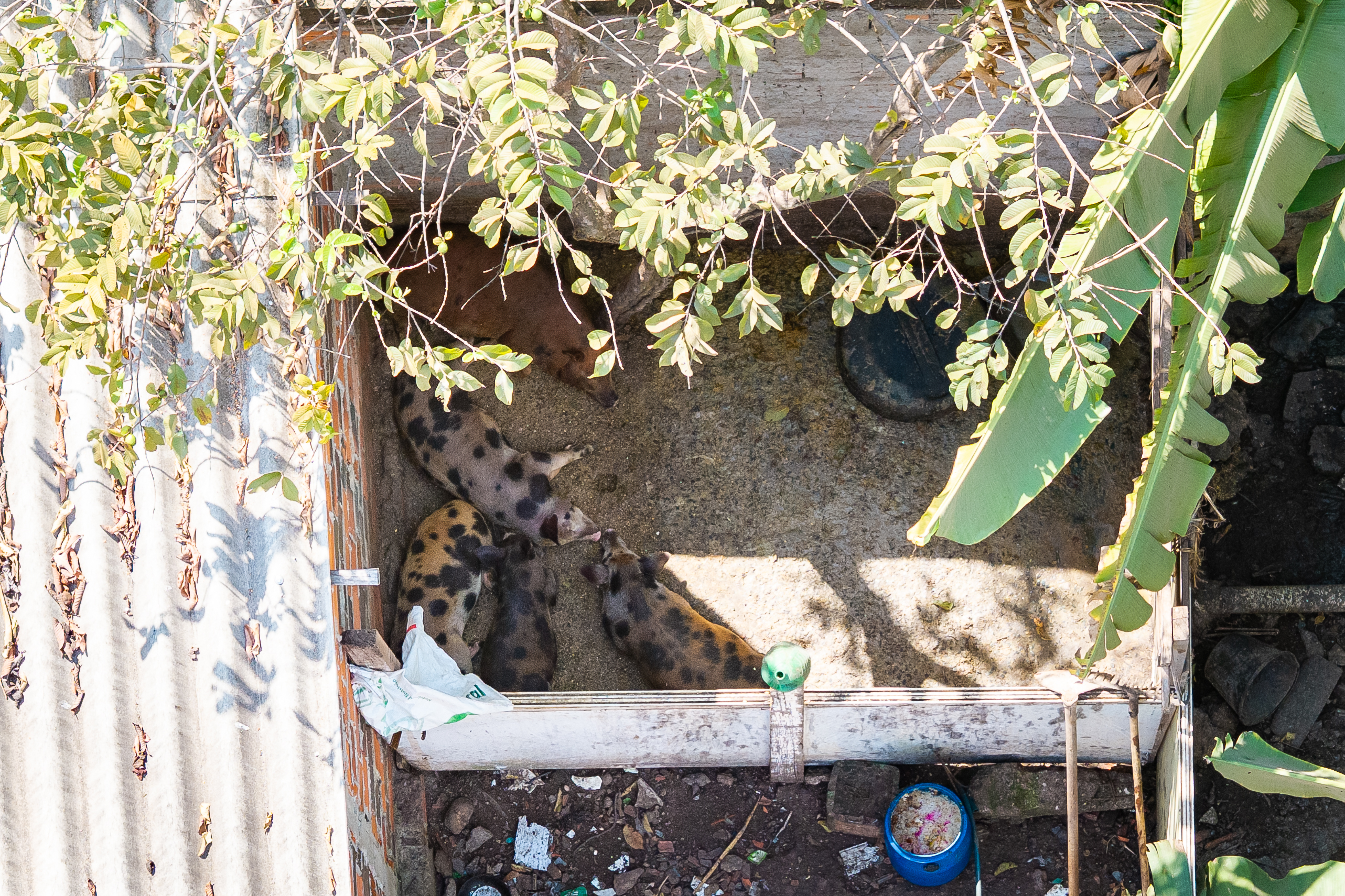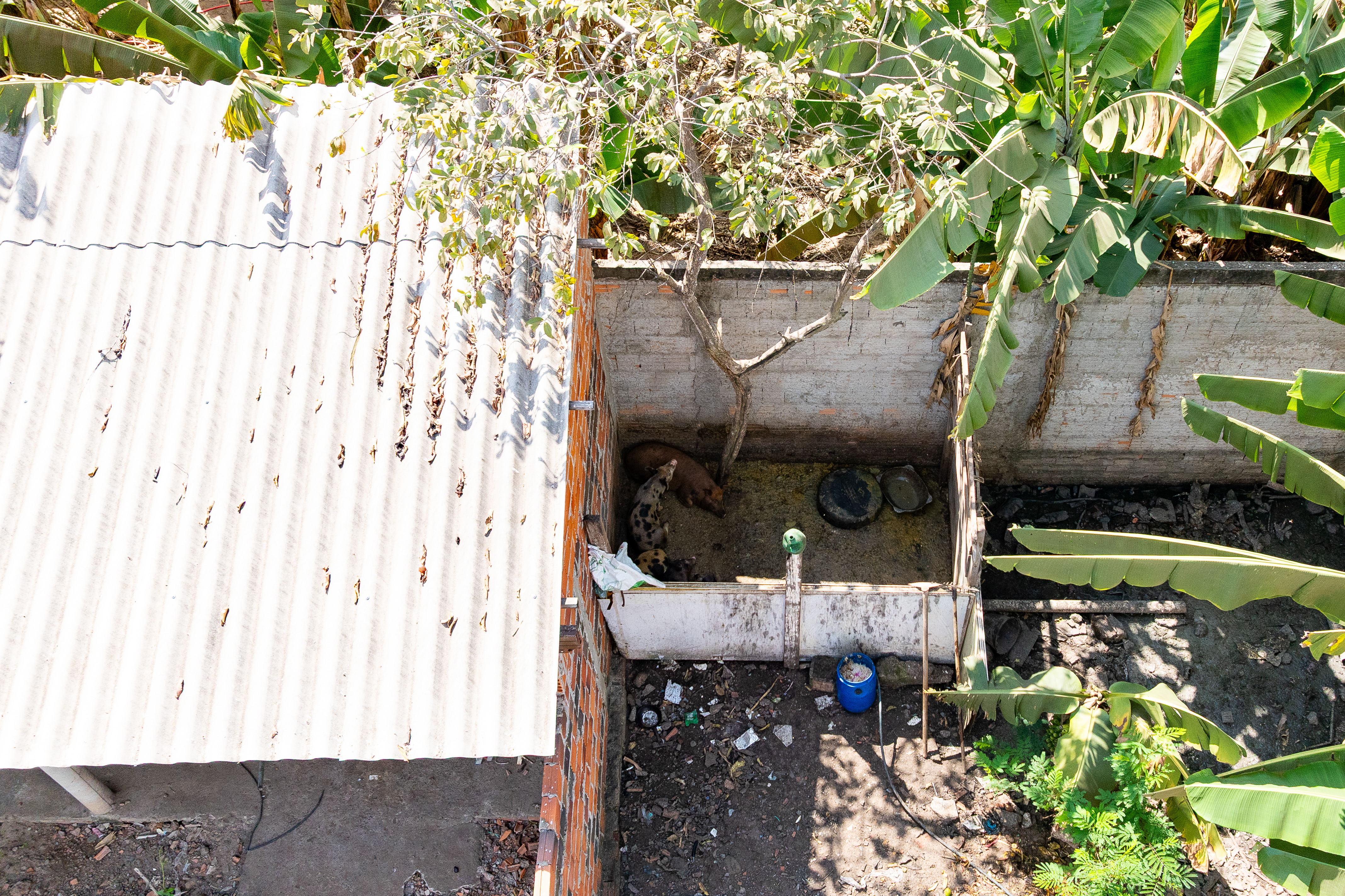 A foto aérea mostra cinco porcos sendo criados em um terreno localizado em área urbana de Cuiabá