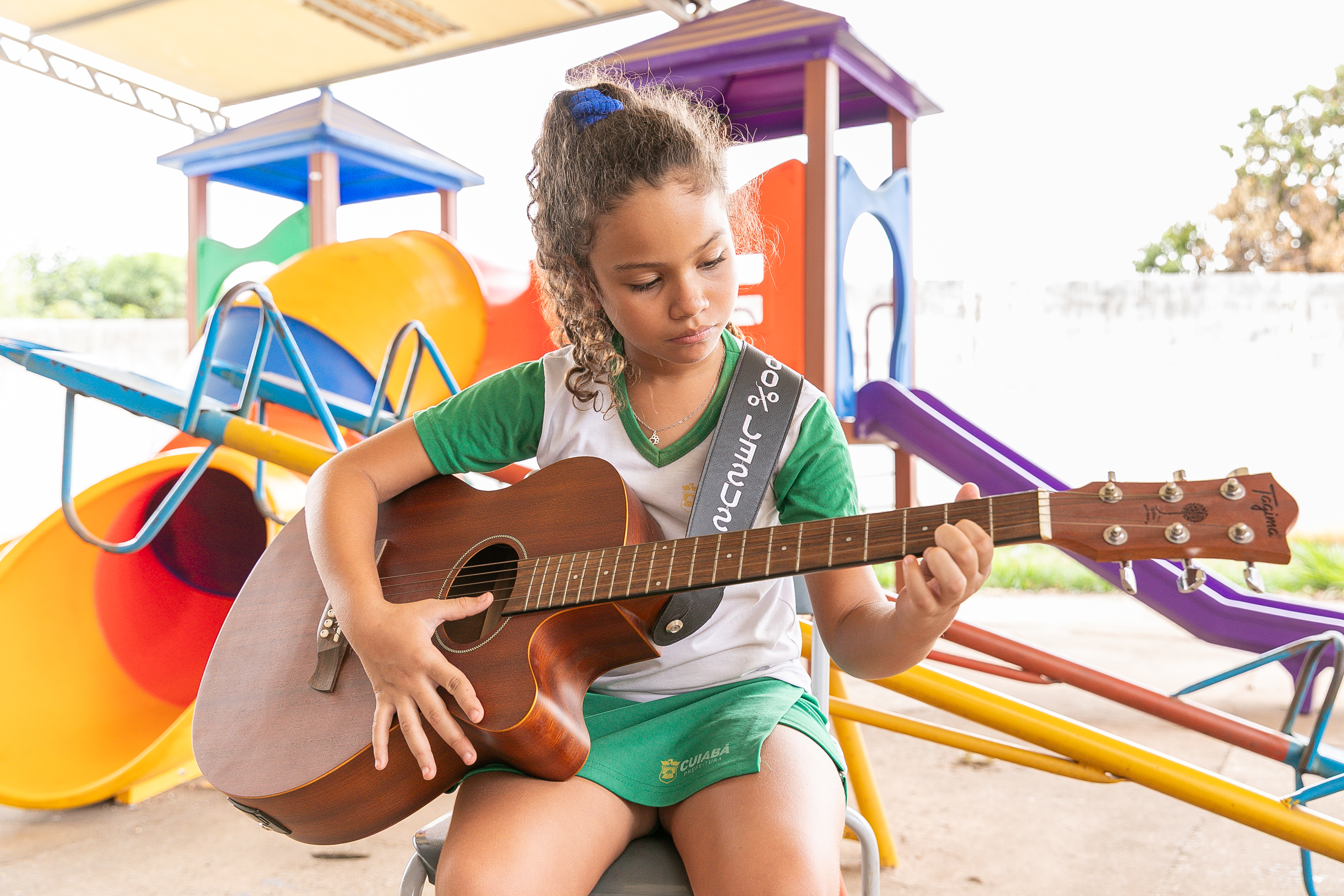 A foto ilustra a estudante Rafaela Ribeiro Marqies, sentada em um ambiente de parque infantil escolar. Ela veste o uniforme oficial da Prefeitura de Cuiabá e está numa pose para começar a tocar violão.