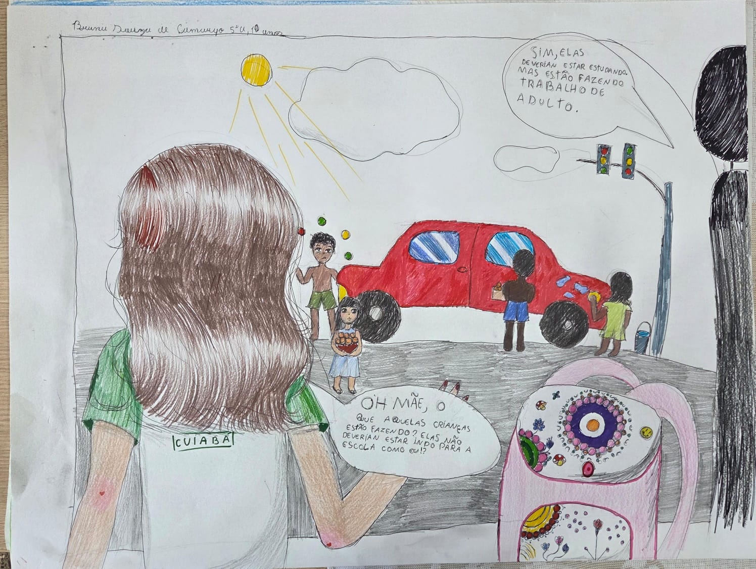 Em uma simples folha de papel A4, a aluna de Cuiabá exibiu todo seu talento. A arte exibe uma criança de costas, vestida com uniforme escolar da Prefeitura de Cuiabá, que se surpreende ao ver outra criança fazendo malabarismo no trânsito, acompanhada de outras três colegas. "Oh mãe, o que aquelas crianças estão fazendo? Elas não deveriam estar indo para a escola como eu", questiona a personagem. Ao lado, o desenho exibe uma mulher que dá a seguinte resposta: "sim, elas deveriam estar estudando, mas, estão fazendo trabalho de adulto".