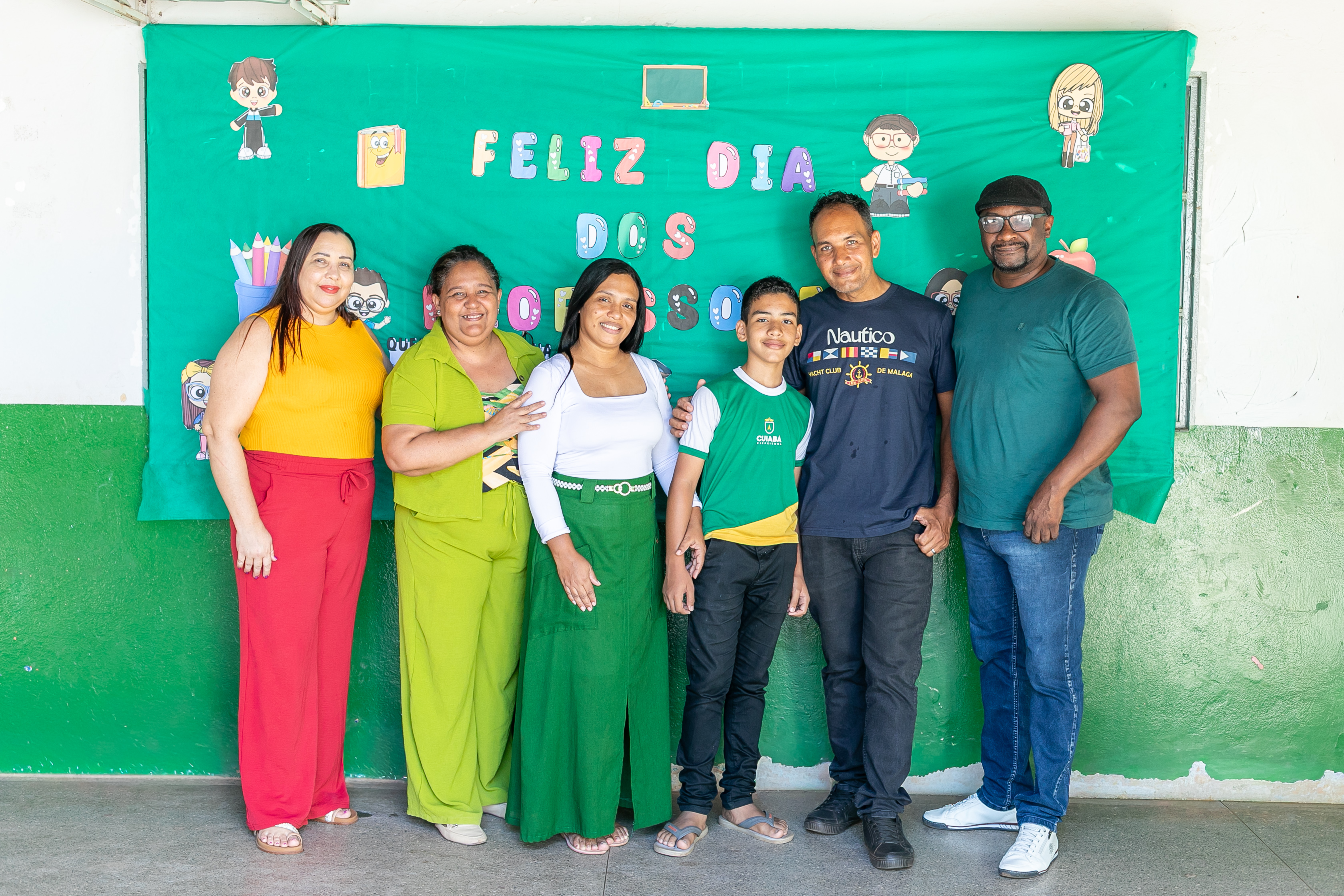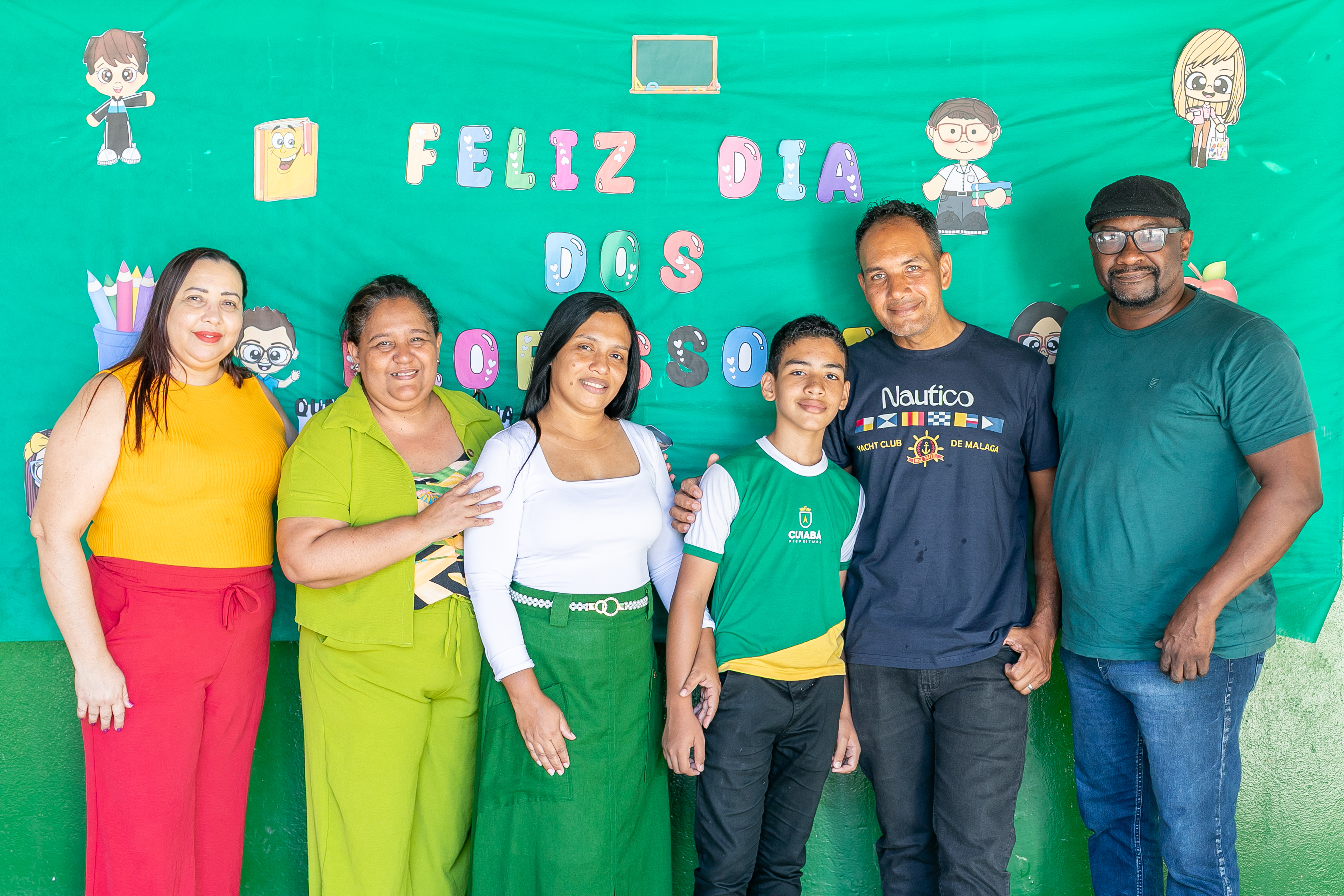 A foto ilustra um garoto de 13 anos, de cor parda, usando uniforme oficial da Prefeitura de Cuiabá, exibindo nas mãos o trecho do conto literário que o levou a ser reconhecido pelo Ministério Público do Trabalho. Ao fundo, há um quadro verde com a mensagem Feliz Dia dos Professores, reforçando o ambiente escolar.