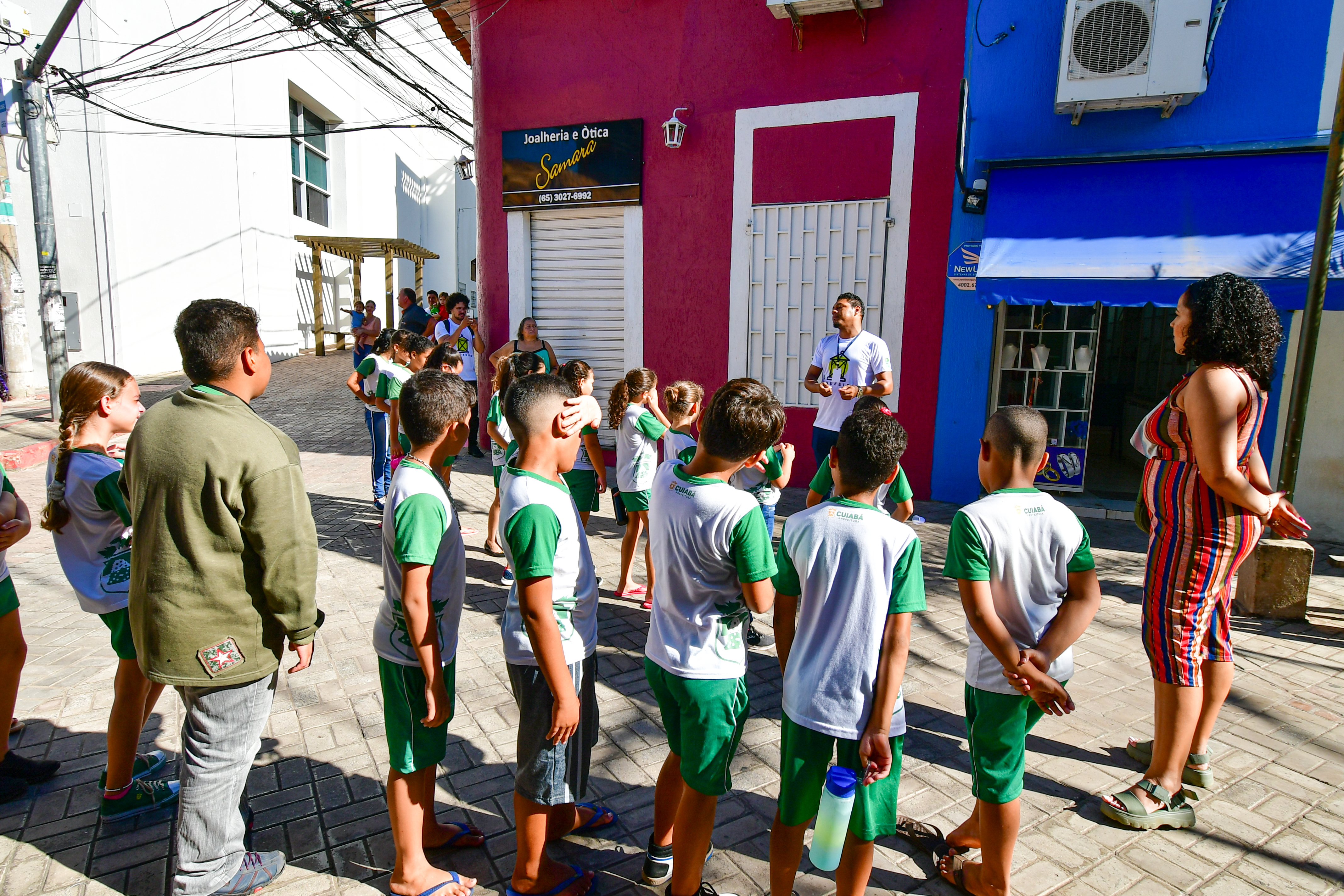 Os estudantes percorreram os principais pontos do Centro Histórico, como a rua de cima, denominada como Pedro Celestino, a rua do meio, que é o calçadão da Ricardo Franco, e a rua de baixo, o calçadão da Galdino Pimentel. “Esse é um dos objetivos dos projetos. Queremos mostrar para as nossas crianças que o calçadão e seus casarões contam boa parte da nossa história. Queremos fazer esse resgate e trazer a população mais perto do nosso Centro Histórico, reintroduzindo programações no Beco do Candeeiro, que foi restaurado e reformado pela gestão do prefeito Emanuel Pinheiro em maio de 2021”, disse o secretário interino de Cultura, Esporte e Lazer, Justino.