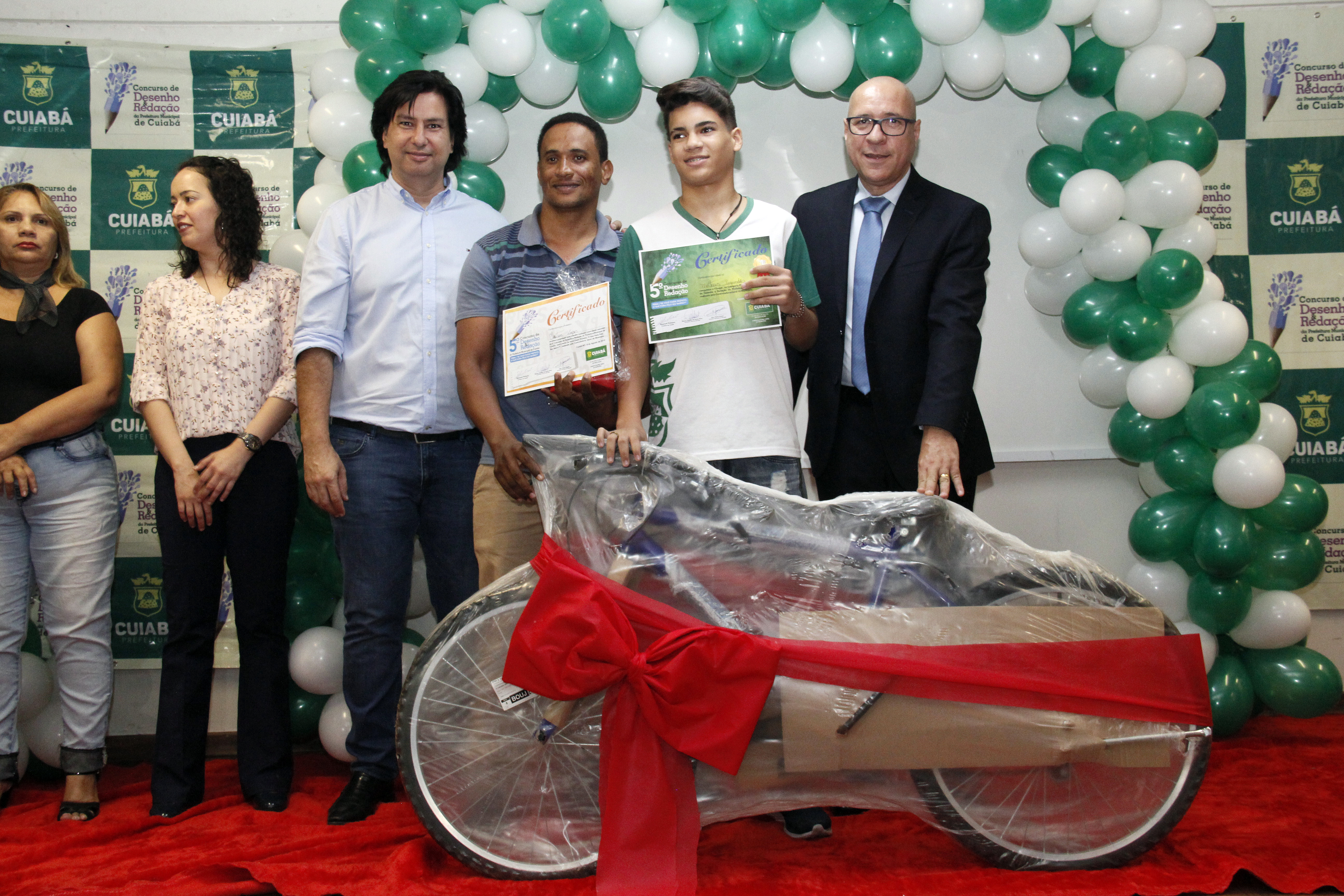 Os 22 alunos da rede municipal de ensino que tiveram seus desenhos e redação escolhidos para representar as unidades educacionais, participaram nesta quinta-feira (08), da solenidade de premiação do 5º Concurso de Desenho e Redação. Os três primeiros colocados de todas as categorias receberam bicicletas, tablets e mine games portáteis.