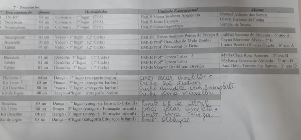 A final foi formada por oito unidades escolares, do ciclo um e dois de ensino, entre escolas, Creches e Centros Municipais de Educação Infantil (CMEI), onde foram premiadas, em 1º, 2º, 3º e 4º lugar cada modalidade, com bicicletas, kits de livros, desenhos e jogos. Desses, quem se sagrou campeã na modalidade Jardim foi o CMEI Oscar Amélito, que dançou e encantou com a cor amarela prenominando, em um jardim de coloridas flores, ao som do lindo cântico de Siriri. ‘Olha a moringa, olha a moringa, quem vai levar’.