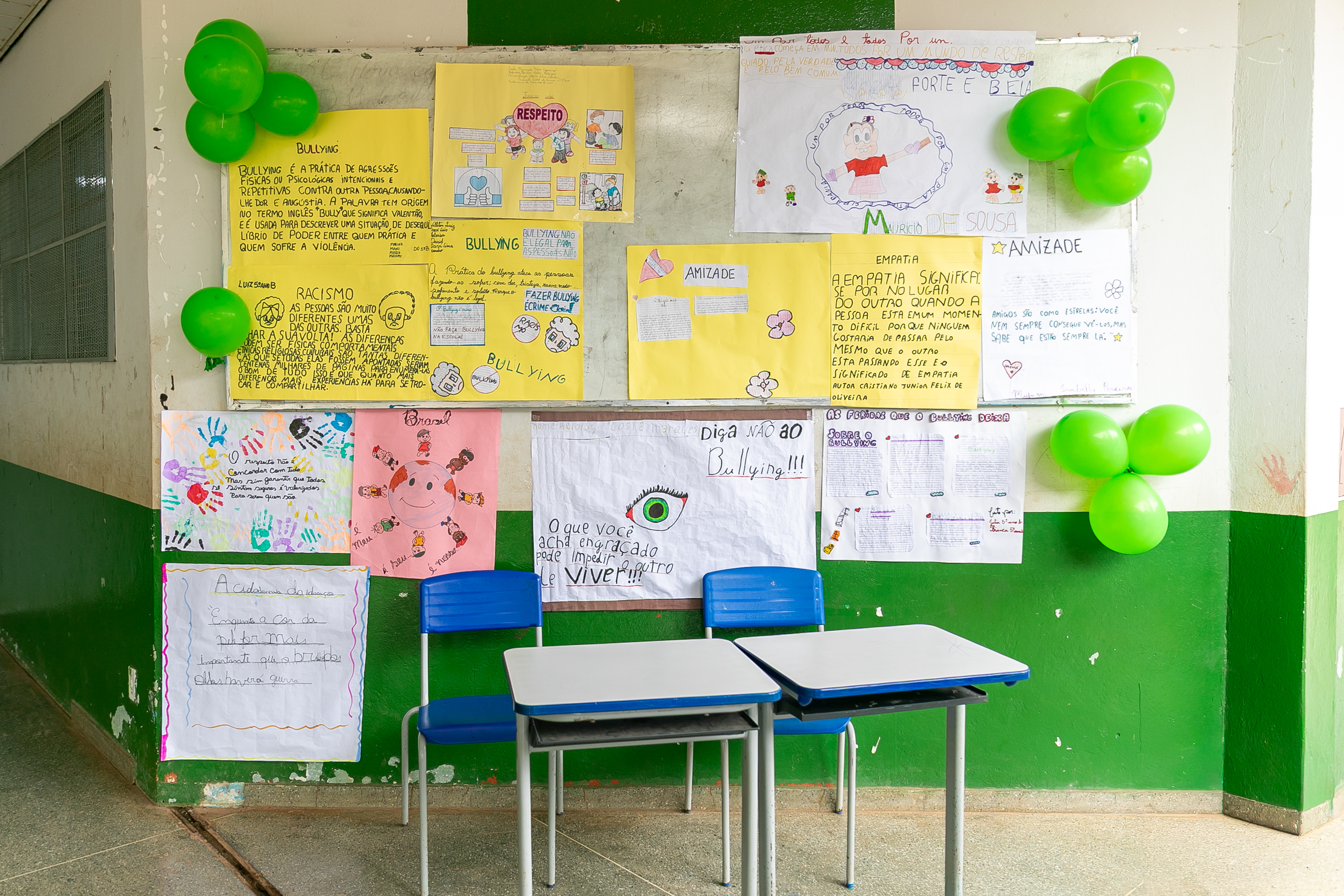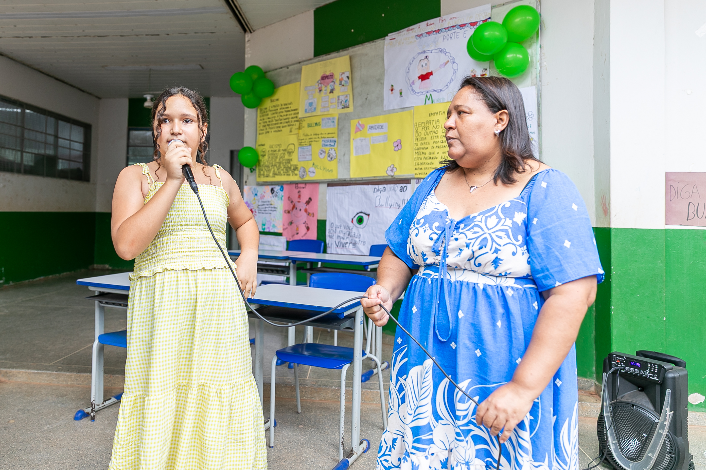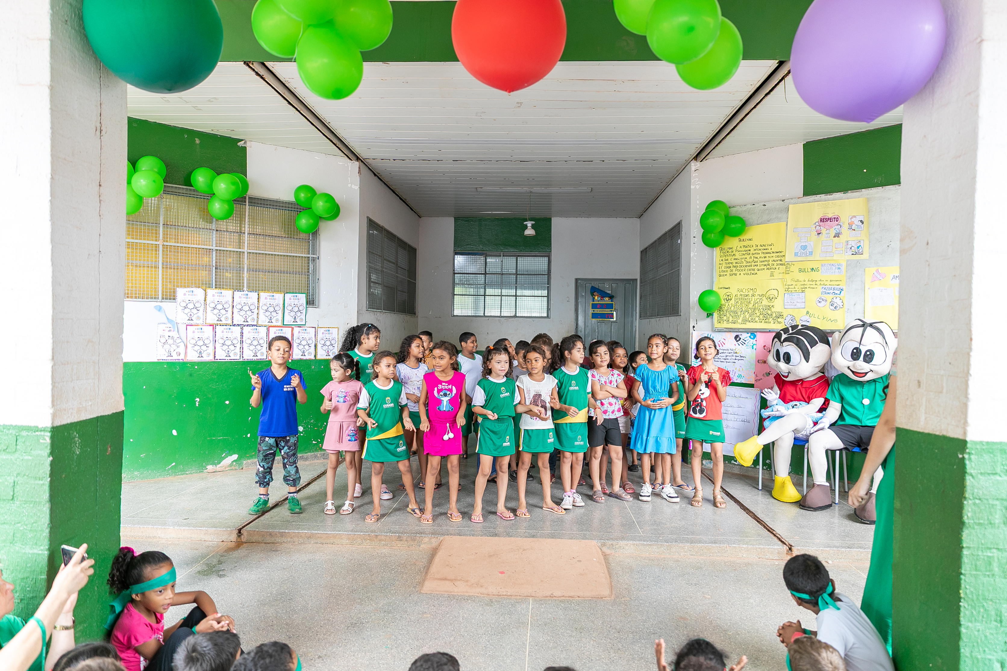 Os estudantes também fizeram apresentações de músicas e peças teatrais abordando o respeito e amor ao próximo. Nas paredes do pátio escolar, havia decoração com cartolinas exibindo desenhos produzidos pelos estudantes de combate ao bullyng.