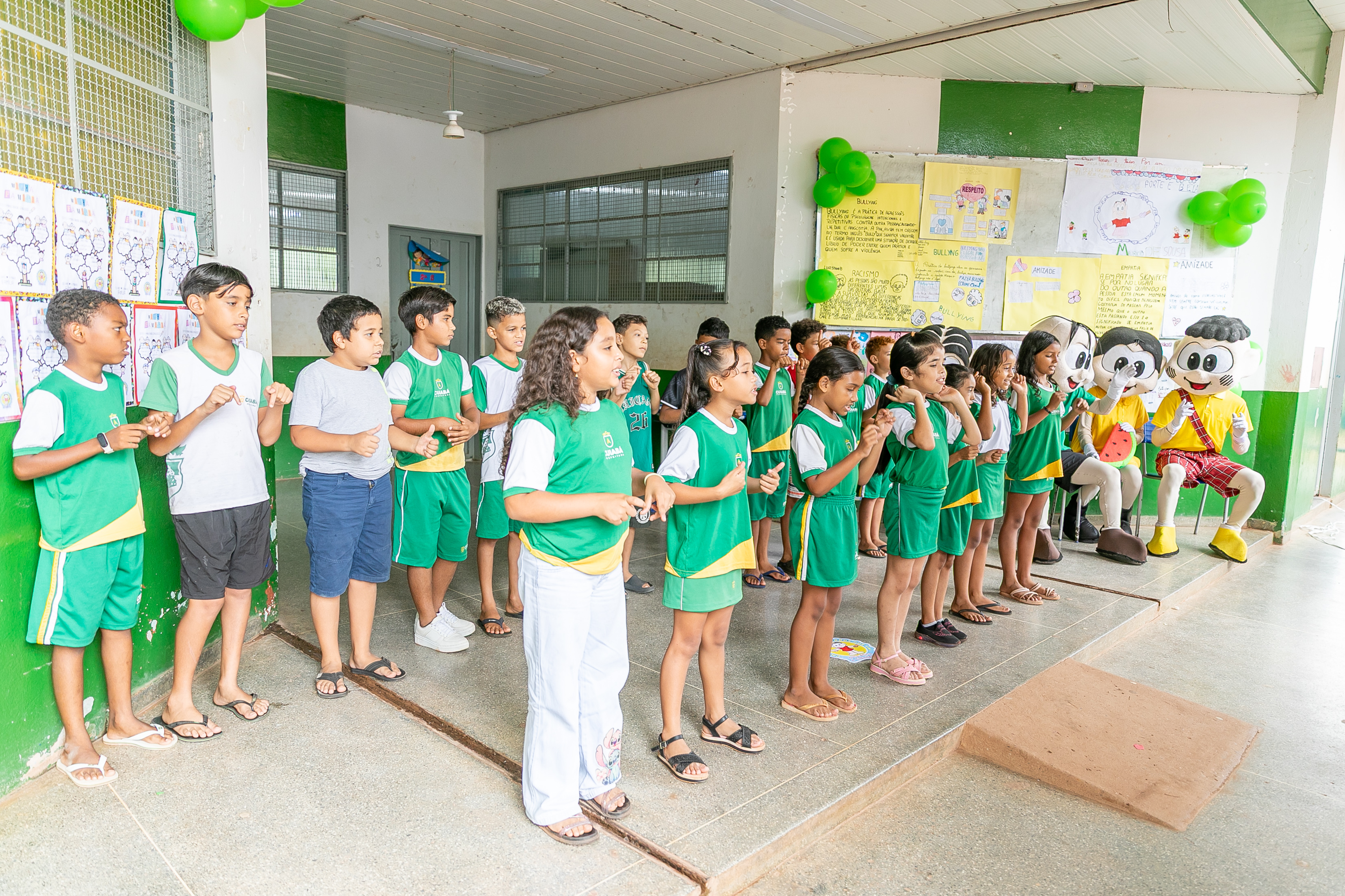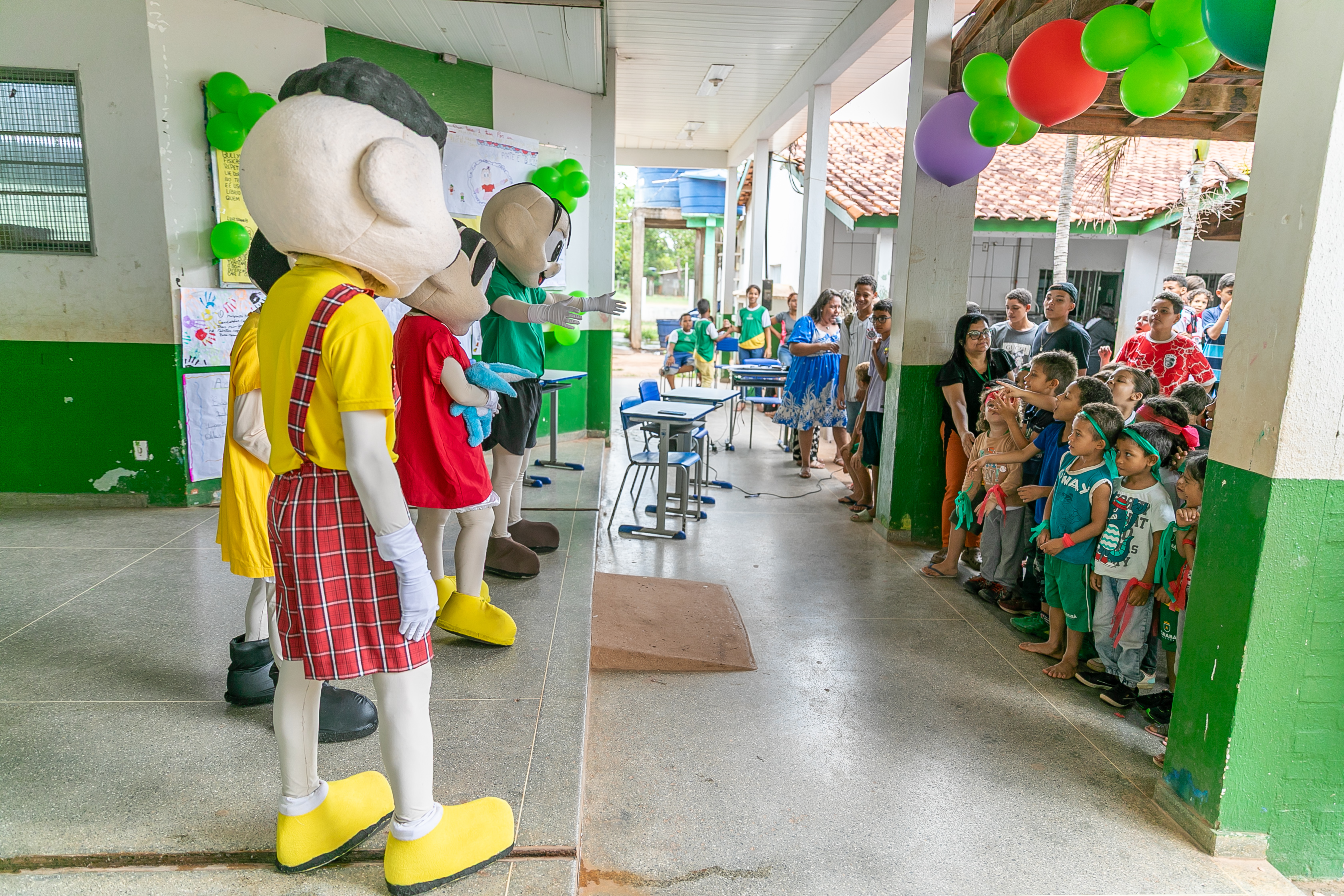 A foto ilustra estudantes com uniforme oficial da Prefeitura de Cuiabá e personagens vestidos de bonecos da Turma da Mônica em um pátio de uma escola.