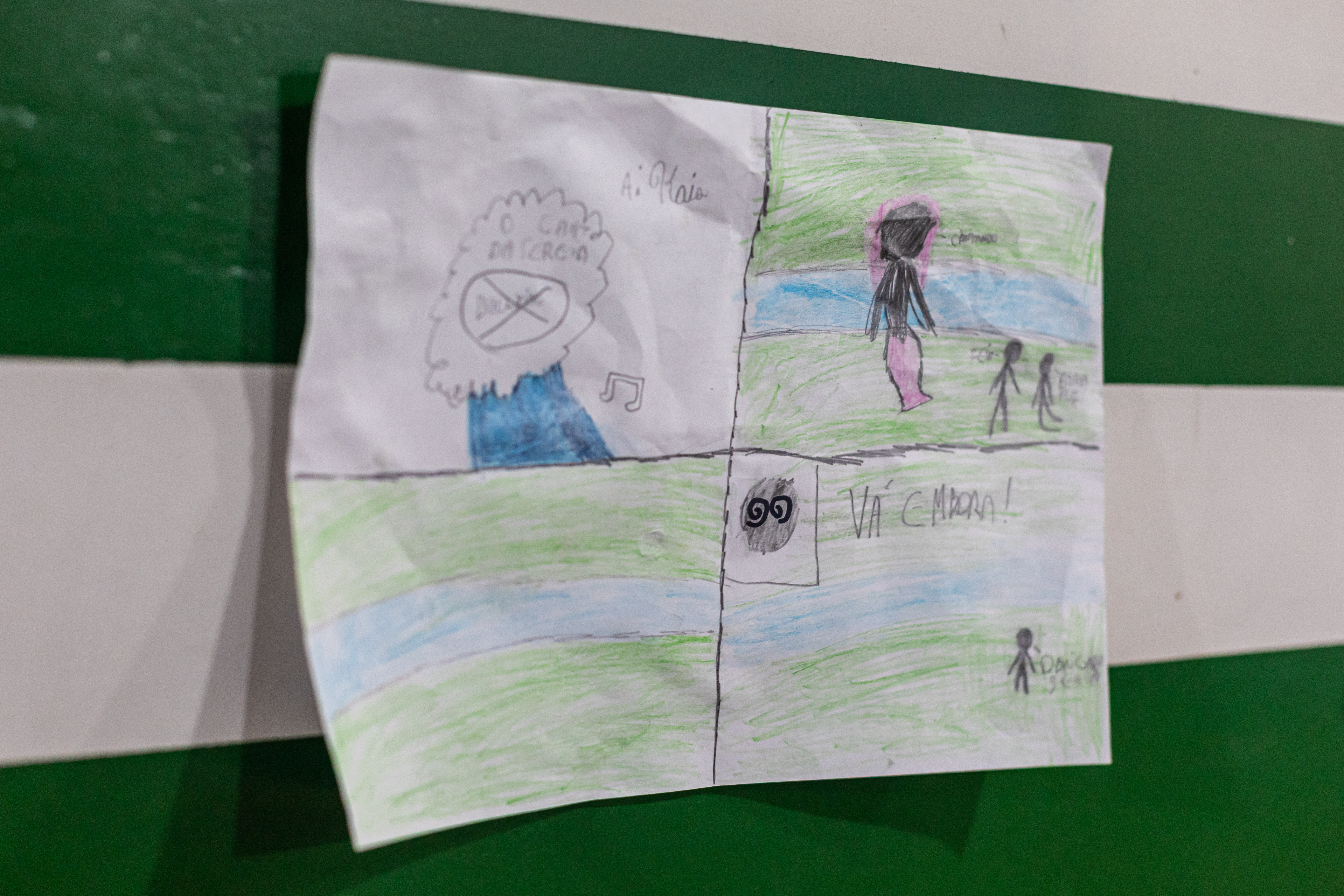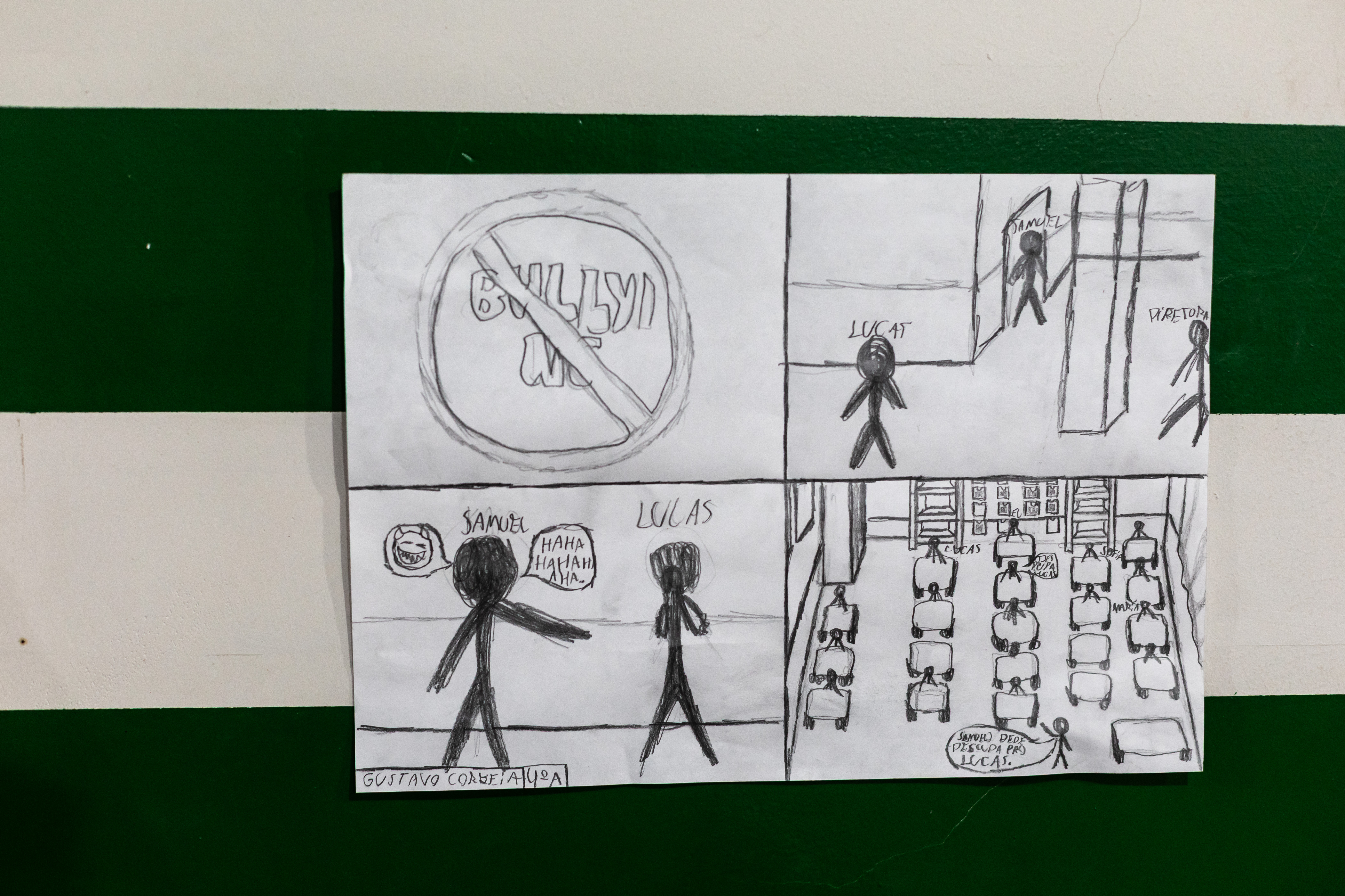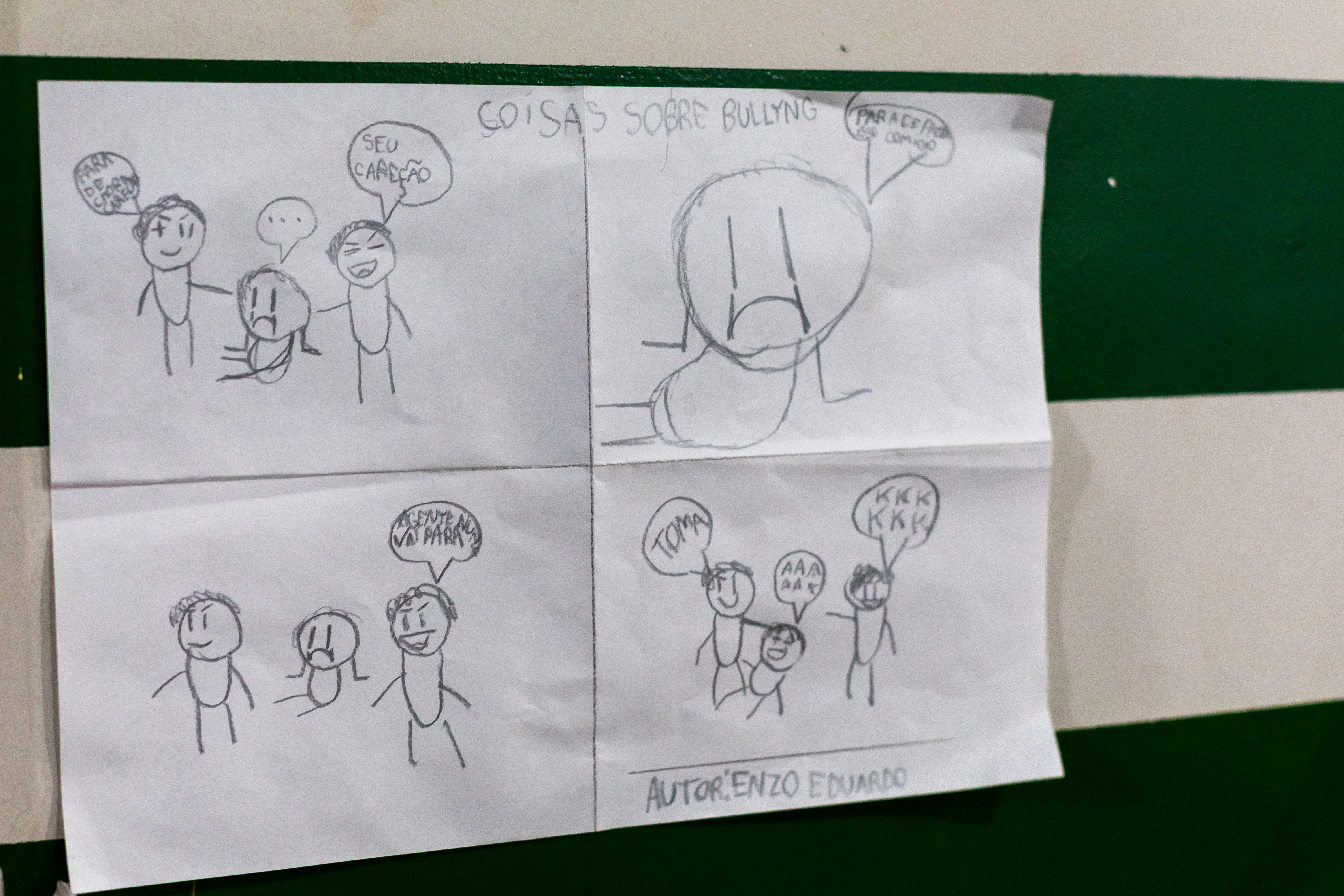 Trinta crianças matriculadas no 4º ano da EMEB (Escola Municipal de Educação Básica) Agostinho Simplício, localizada no bairro Poção, em Cuiabá, todas com 9 anos de idade, criaram desenhos durante as aulas de Educação Artística, expondo suas contrariedades às práticas de bullying e cyberbullying.