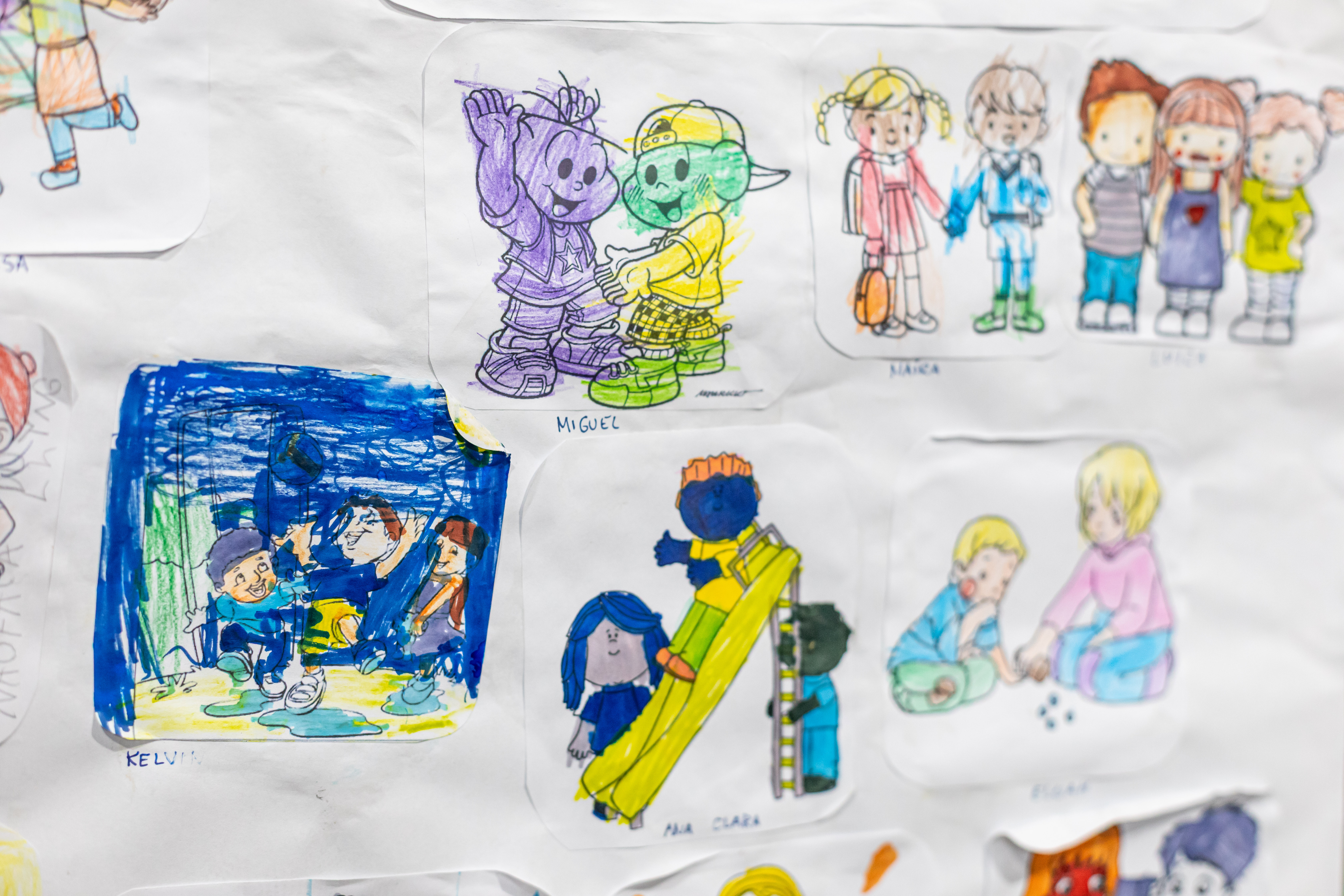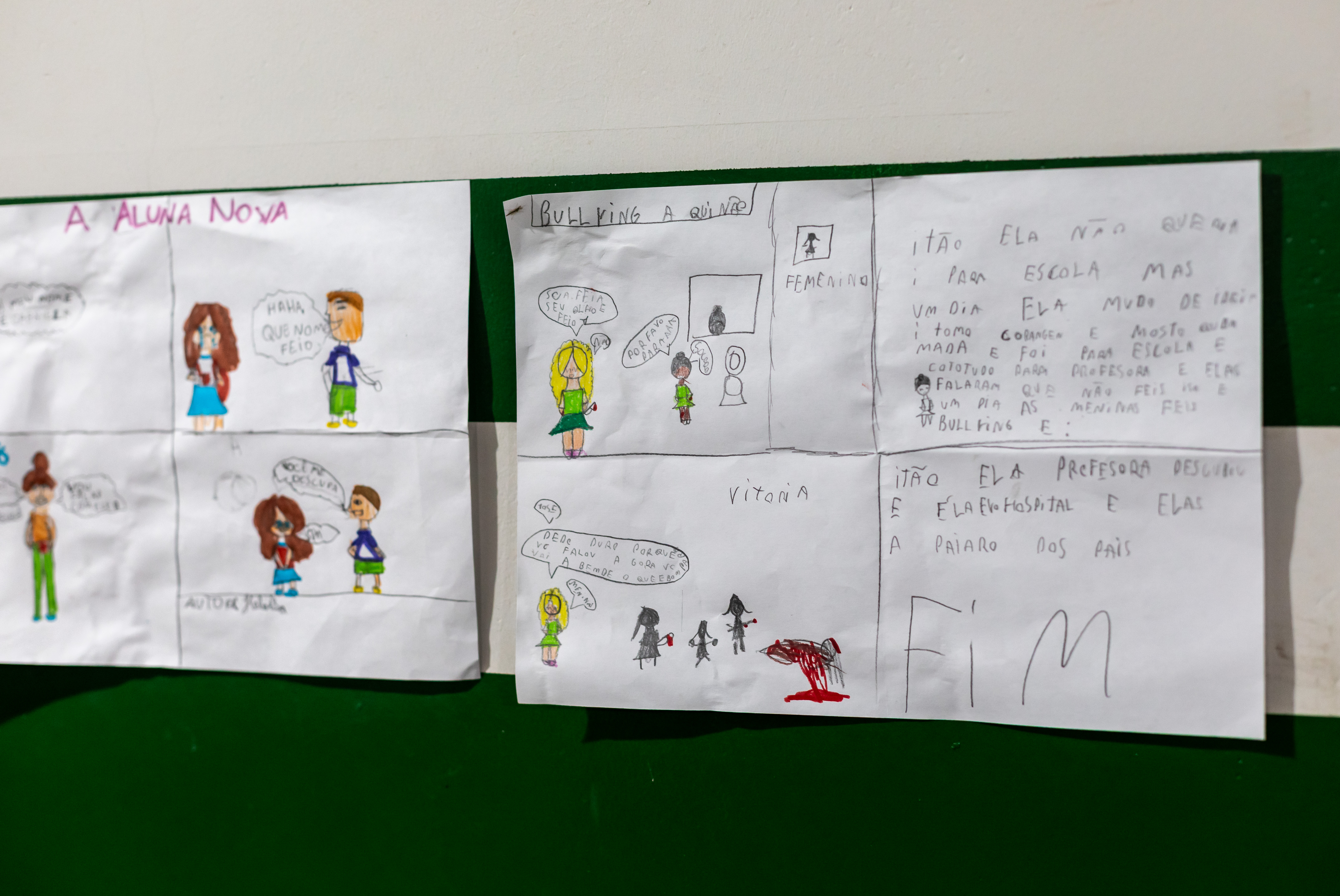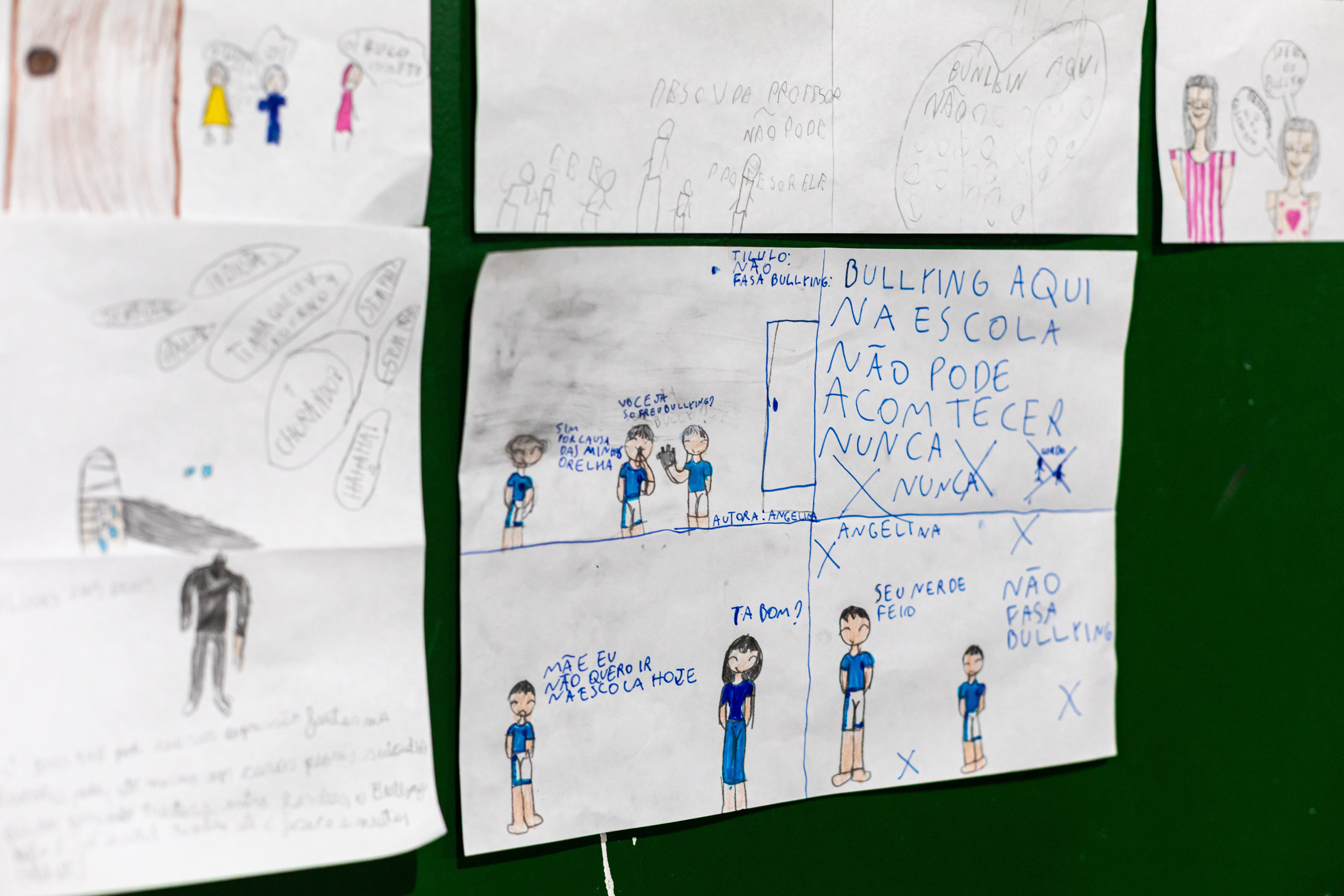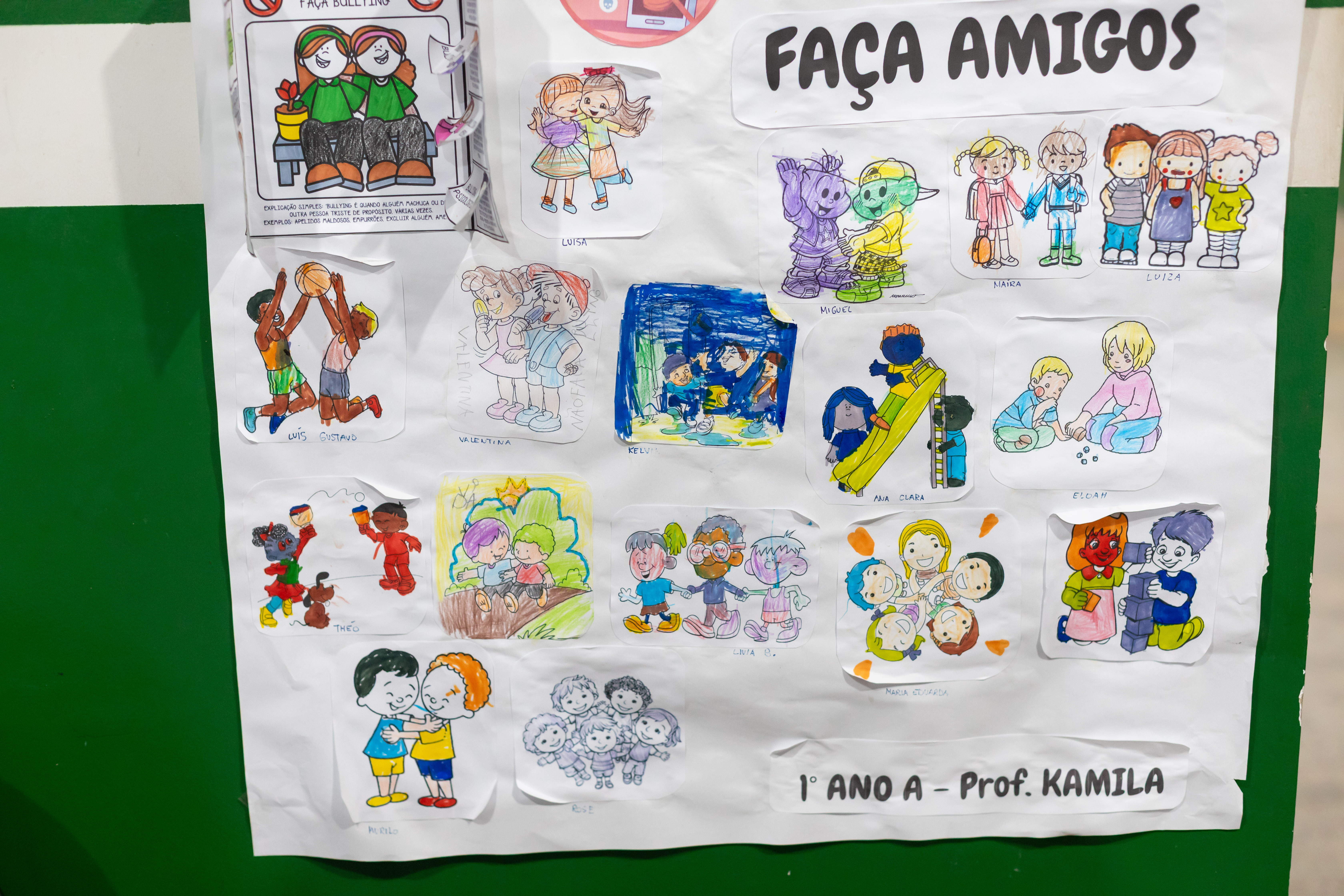 Há também cartolinas exibindo desenhos com ideias de combate ao bullying e cyberbullying feitos pelos estudantes da 1ª série, que têm seis anos.