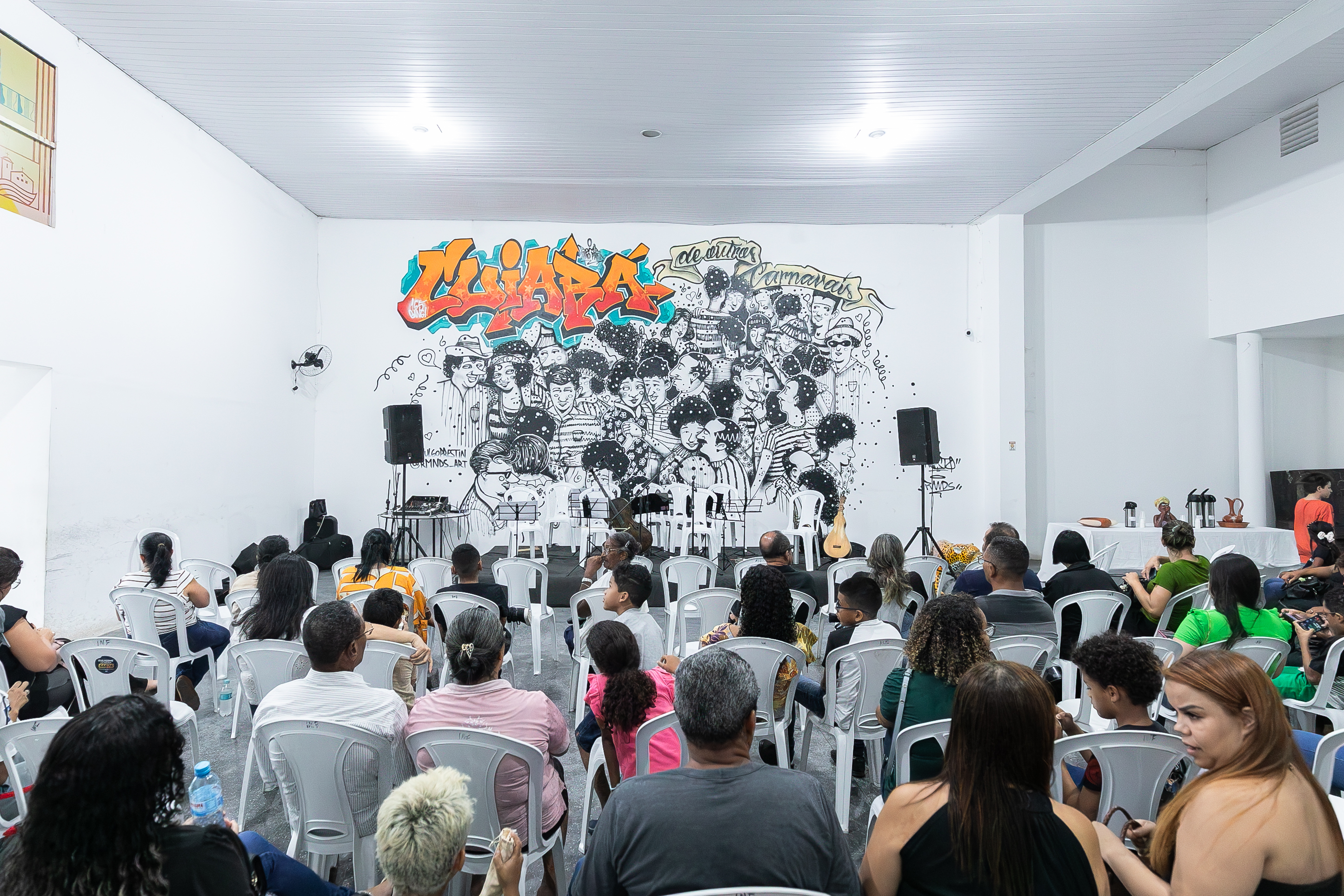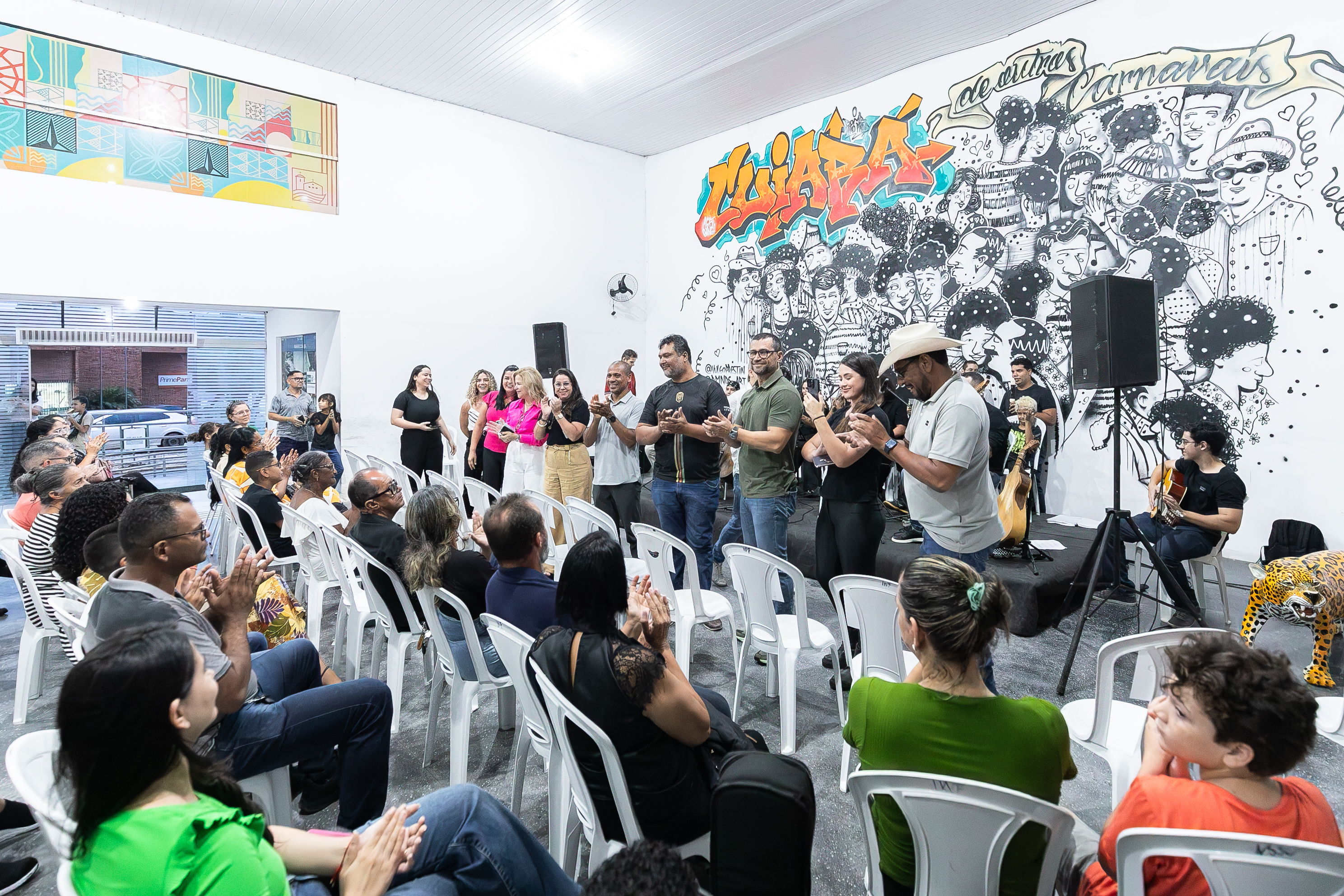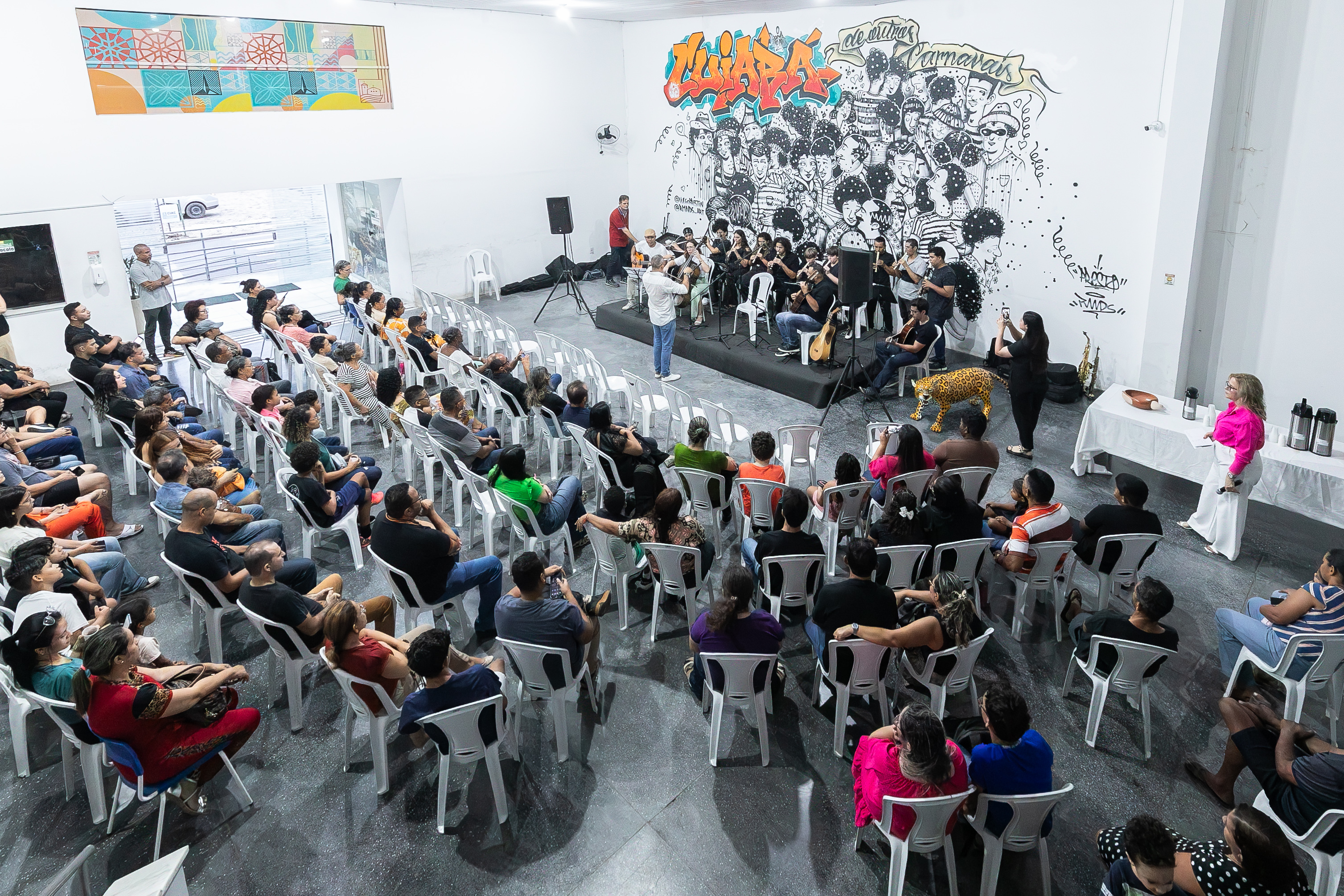 A imagem mostra a aula inaugural da Escola de Música de Cuiabá, realizada no salão de eventos da Secretaria Municipal de Cultura. Os alunos estão sentados, apreciando a apresentação da banda.