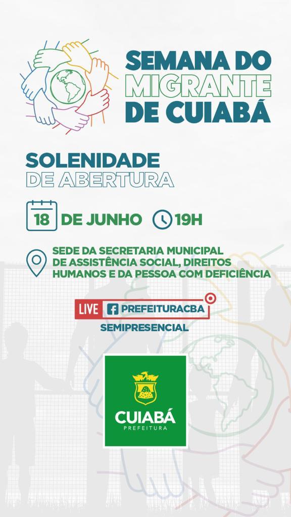 A Prefeitura de Cuiabá por meio da Secretaria de Assistência Social, Direitos Humanos e da Pessoa com Deficiência realiza nesta sexta-feira (18), a partir das 19 horas, a solenidade de abertura da Semana do Migrante da Capital. O evento acontecerá no auditório da Secretaria, sendo dividido em 50% presencial e 50% on line evitando a aglomeração de pessoas, sendo essa uma das principais formas de prevenção ao coronavírus.