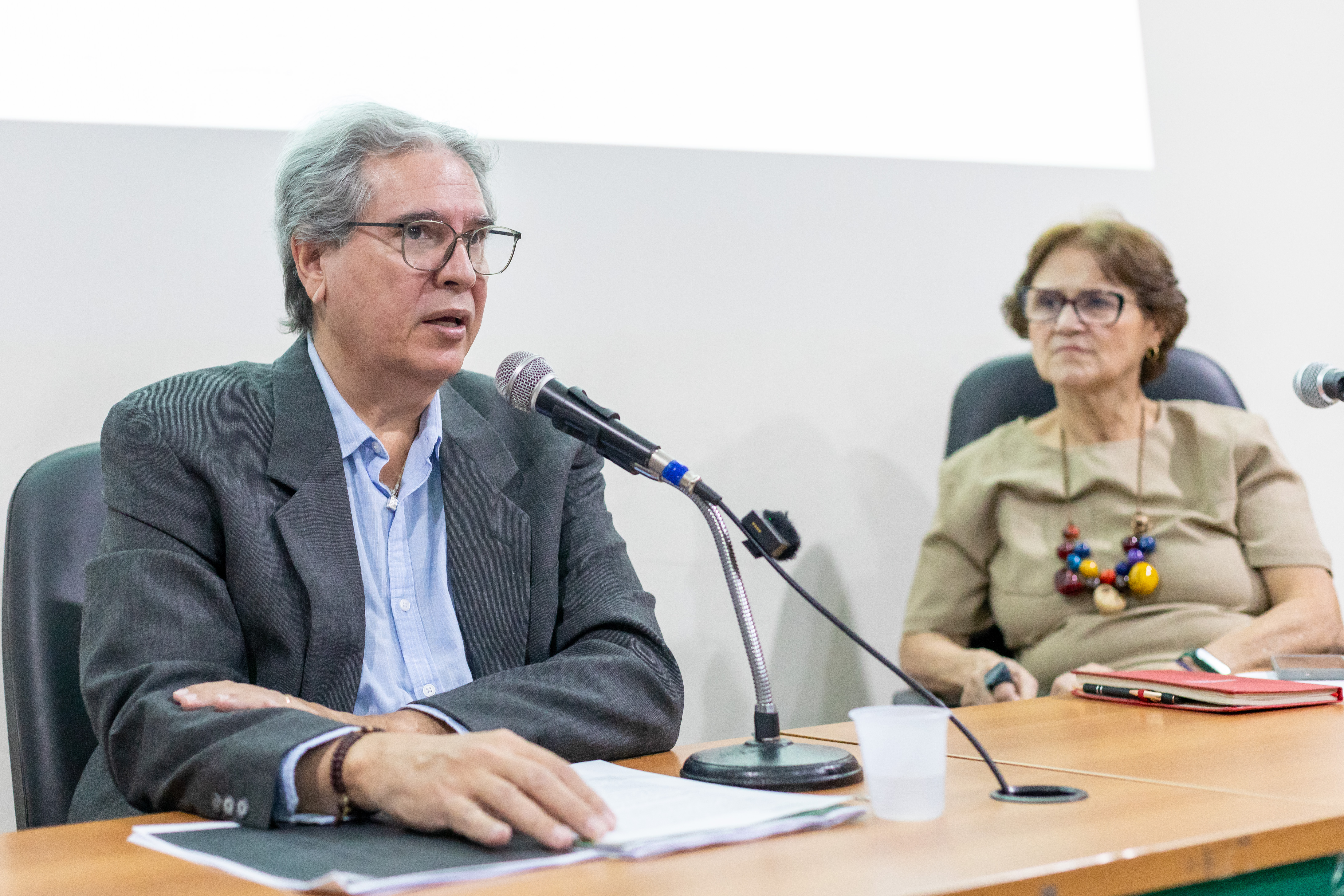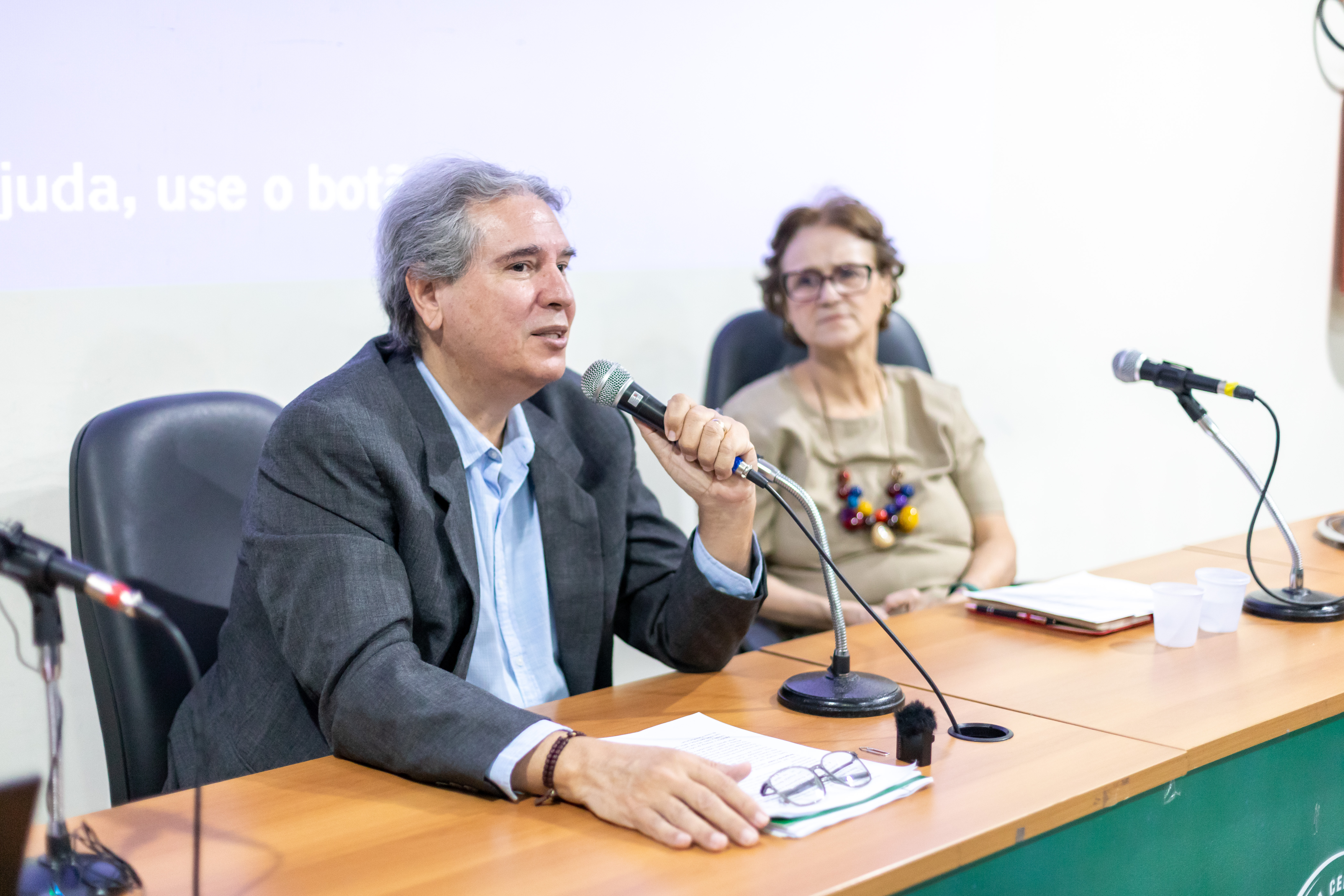 Imagem mostra o secretário Nivaldo Carvalho durante audiência pública ao lado da diretora de planejamento, Silvina dos Anjos.