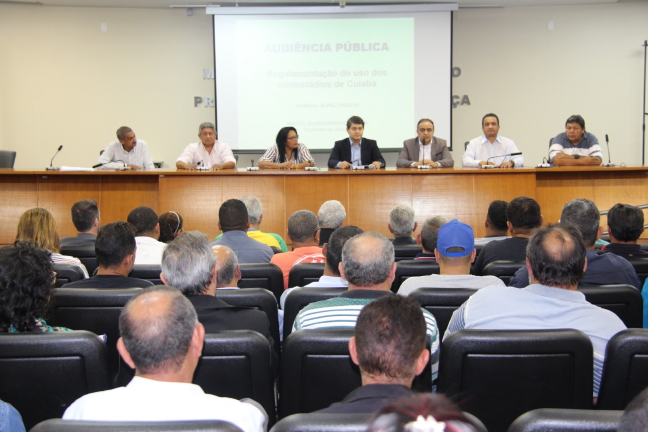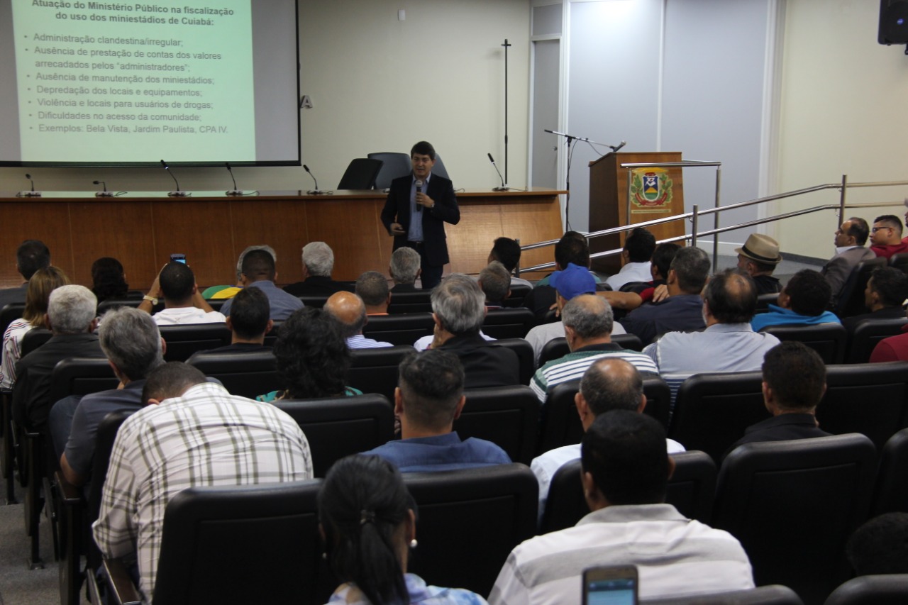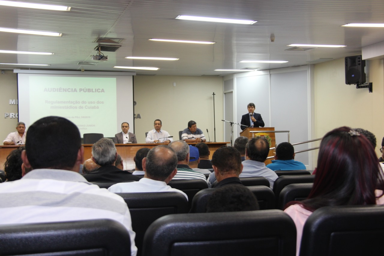 Representantes da sociedade civil lotaram o auditório da Procuradoria-geral de Justiça (PGJ) para discutir sobre a regulamentação do uso de mini-estádios em Cuiabá, no último dia 05 de agosto. A audiência pública presidida pela promotor de justiça Miguel Slhessarenko Junior contou com a participação do secretário Municipal de Esporte, Francisco Vuolo.
