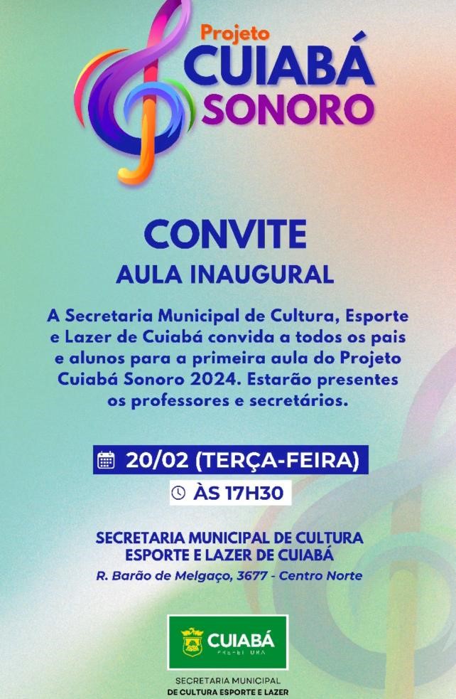 A Prefeitura de Cuiabá, por meio da Secretaria Municipal de Cultura, Esporte e Lazer, convida pais e alunos para a Aula Inaugural do projeto Cuiabá Sonoro, que será realizada nesta terça-feira (20), às 17h30, na sede da Secretaria.