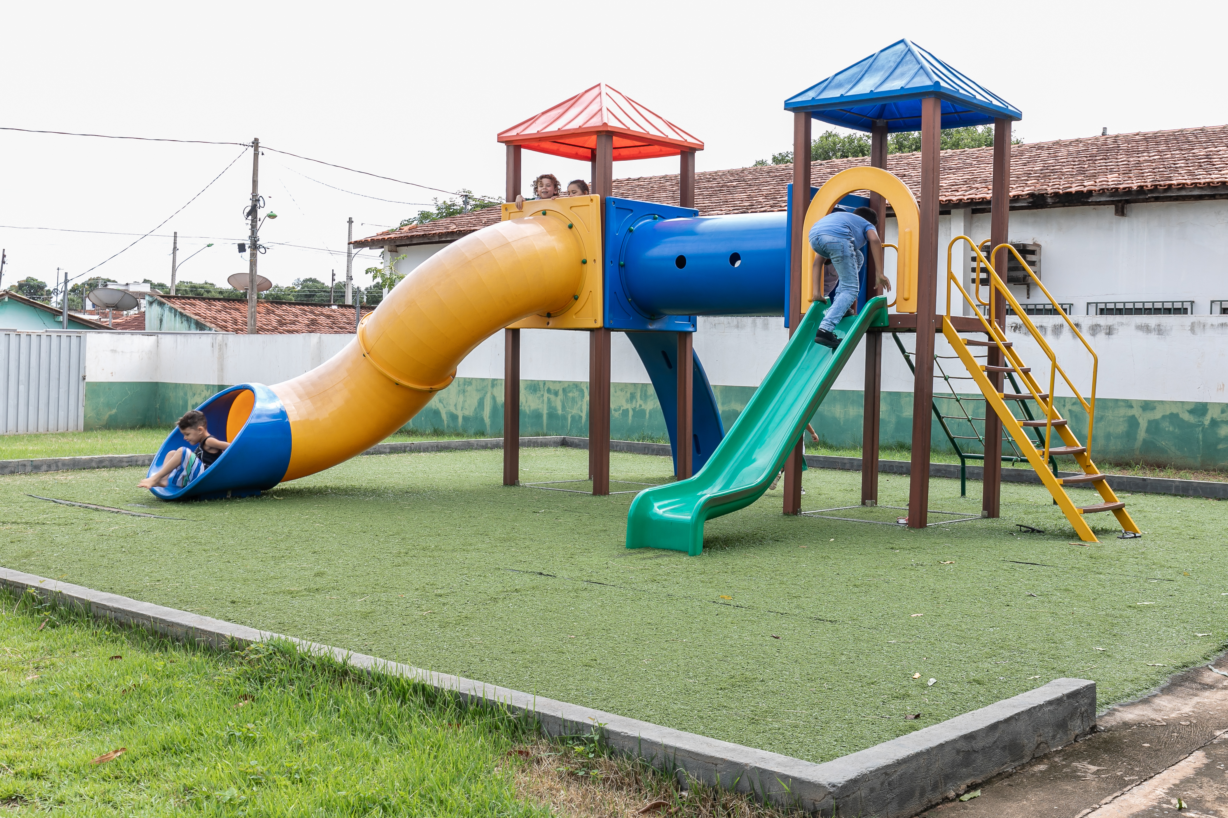 A imagem mostra crianças da rede básica de educação brincando em um playground colorido, instalado no pátio de recreação da EMEB Floriano Bocheneki, no bairro Parque Atalaia. O solo é revestido com grama sintética. As crianças estão uniformizadas.