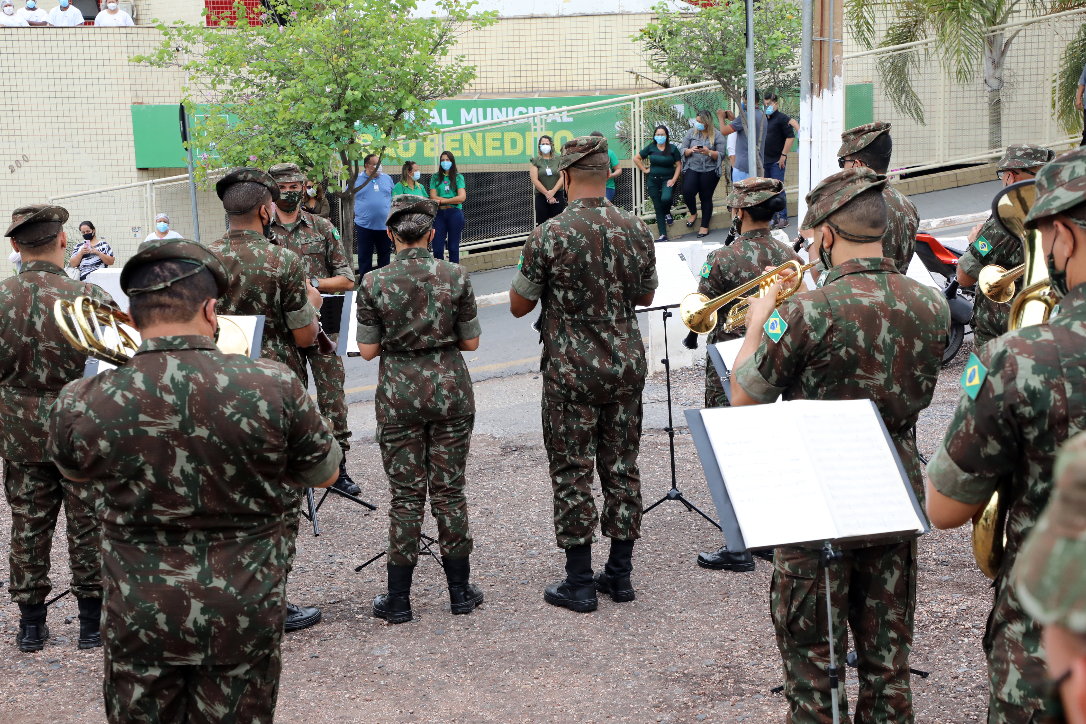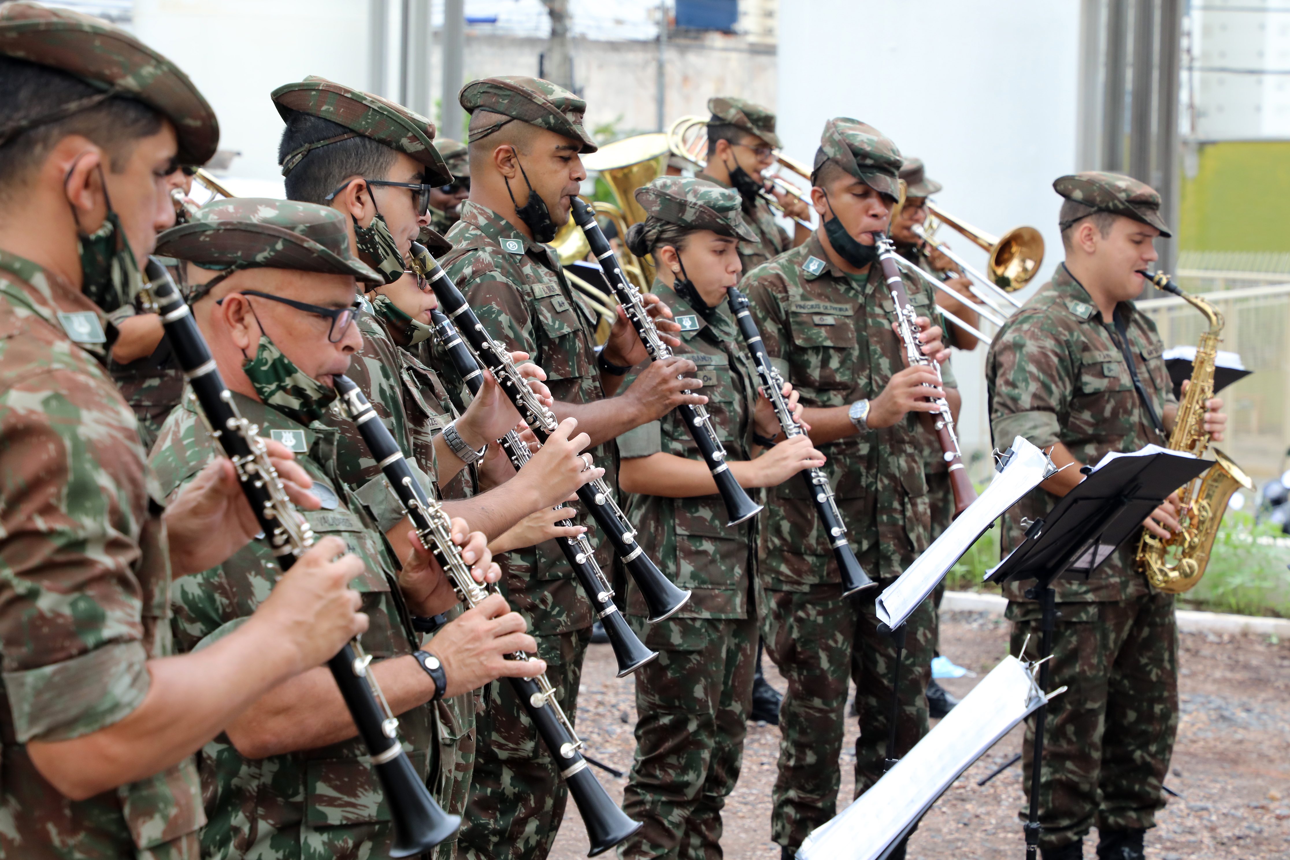 A banda da 13ª Brigada de Infantaria Motorizada adida ao Quadragésimo Quarto Batalhão de Infantaria Motorizada, se apresentou na manhã de terça-feira (6), no estacionamento do Hospital Municipal São Benedito, em Cuiabá, e emocionou pacientes que estão internados na unidade com a Covid-19 e os profissionais que atuam na linha de frente no combate contra o vírus.