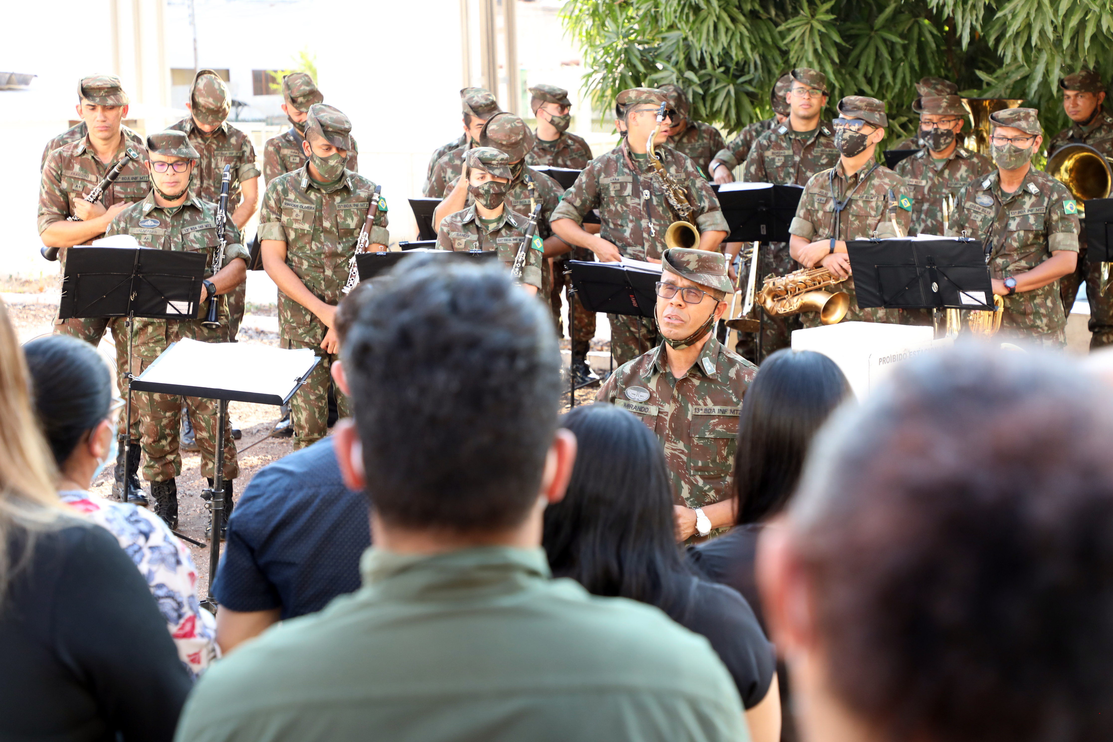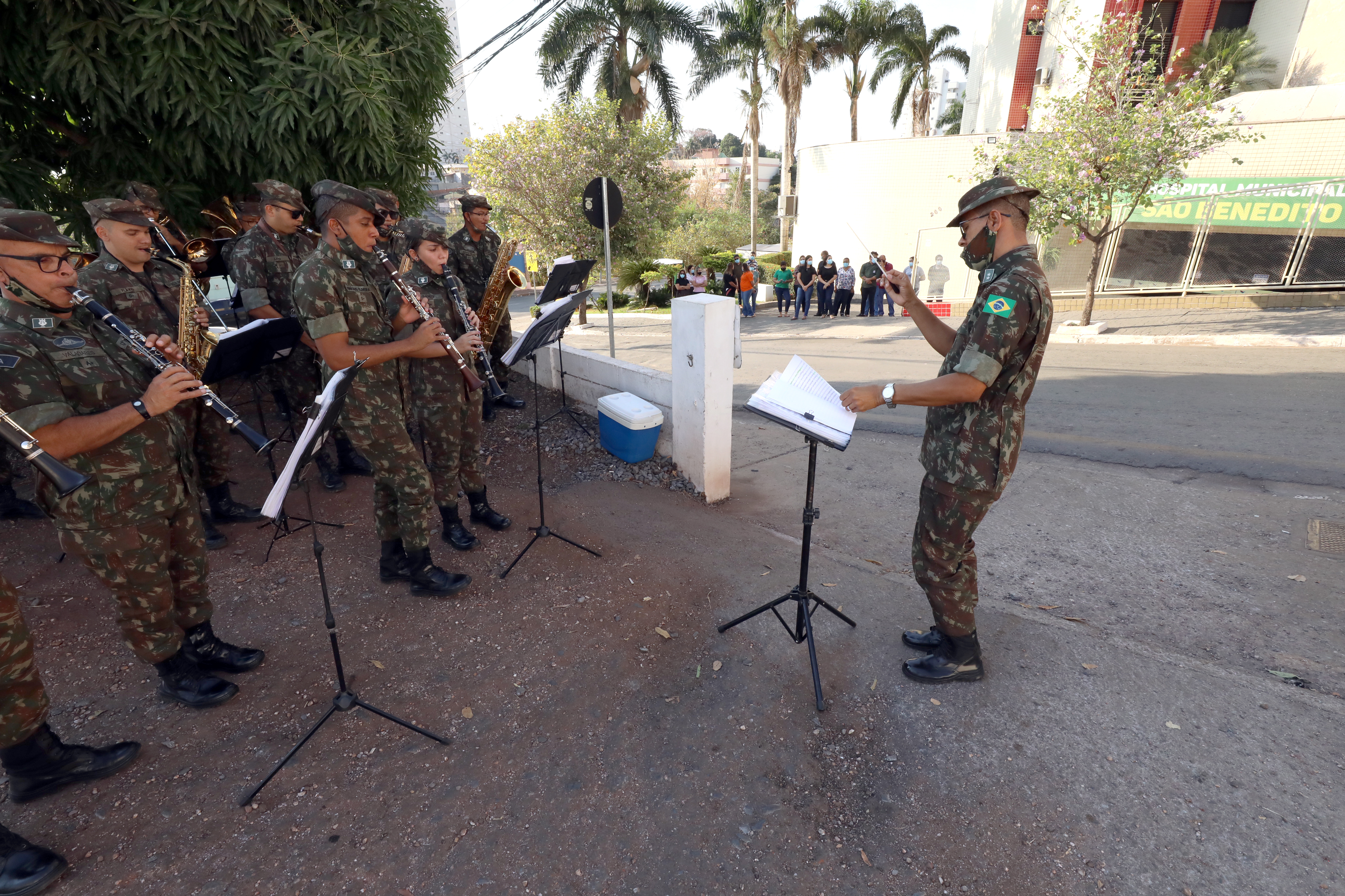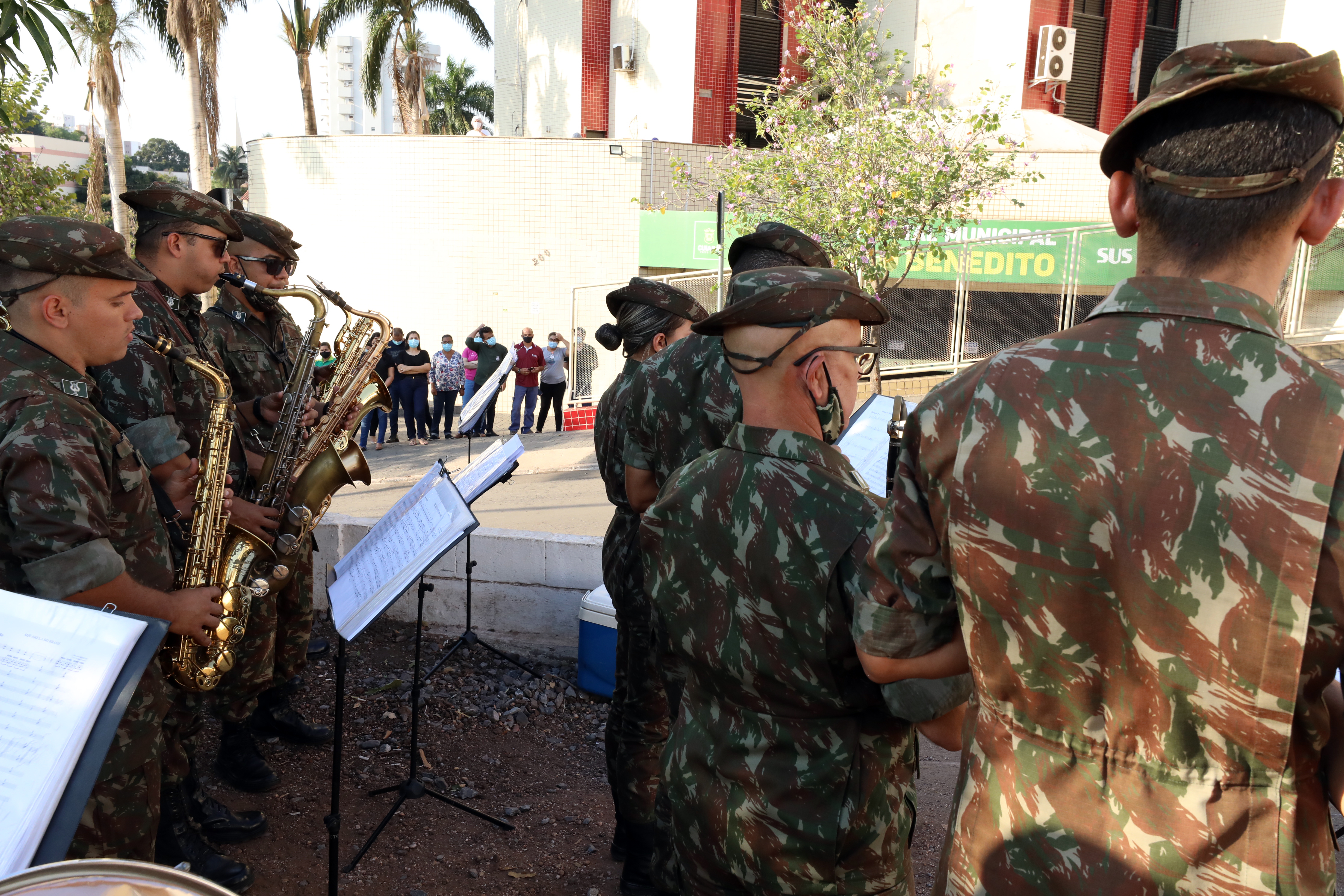 A banda da 13ª Brigada de Infantaria Motorizada adida ao Quadragésimo Quarto Batalhão de Infantaria Motorizada se apresentou na tarde de terça-feira (24), no estacionamento do Hospital Municipal São Benedito, em Cuiabá, levando emoção e descontração aos profissionais de saúde e aos pacientes que estão internados naquela unidade, que funciona exclusivamente para tratamento da covid-19.