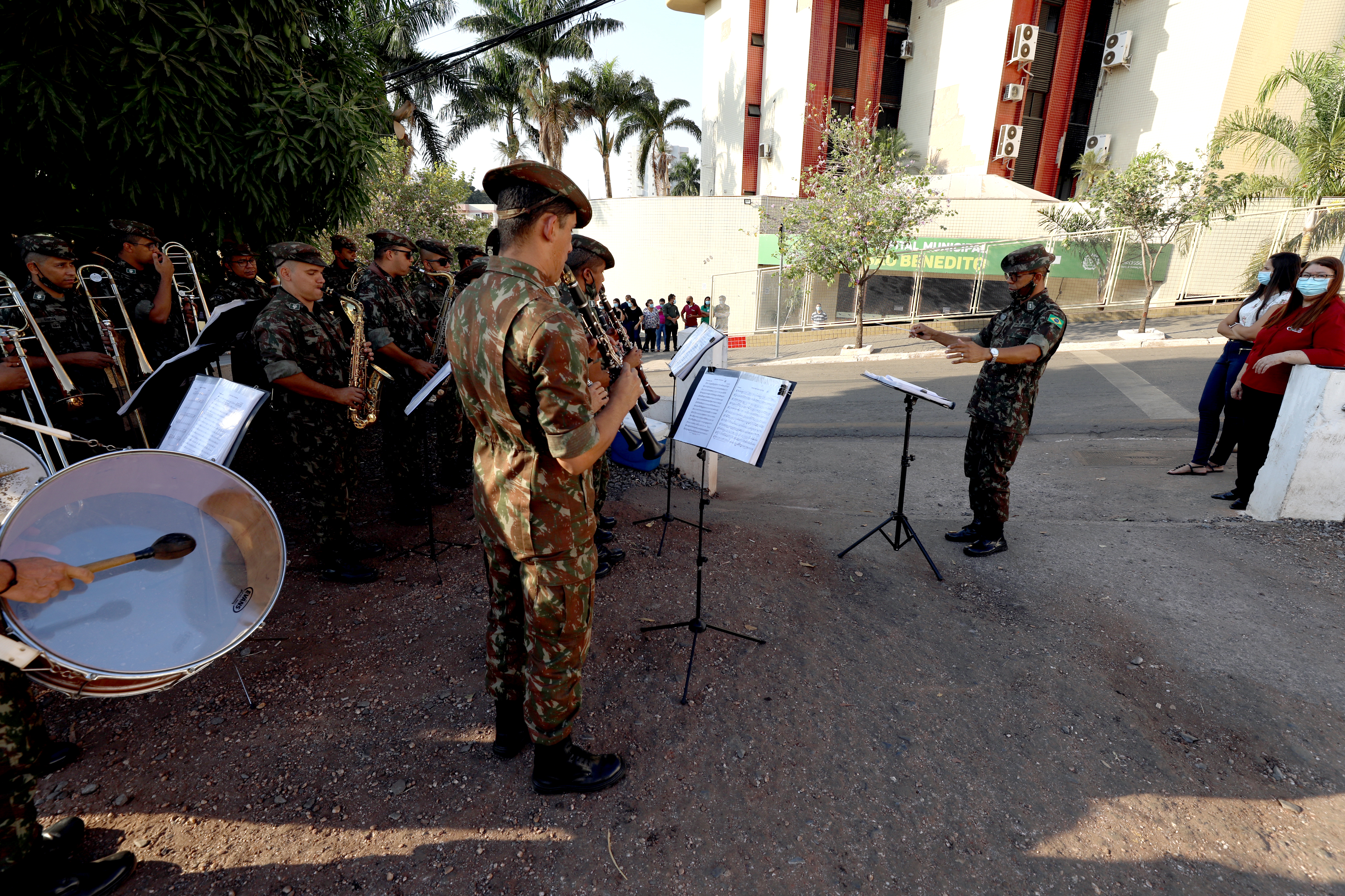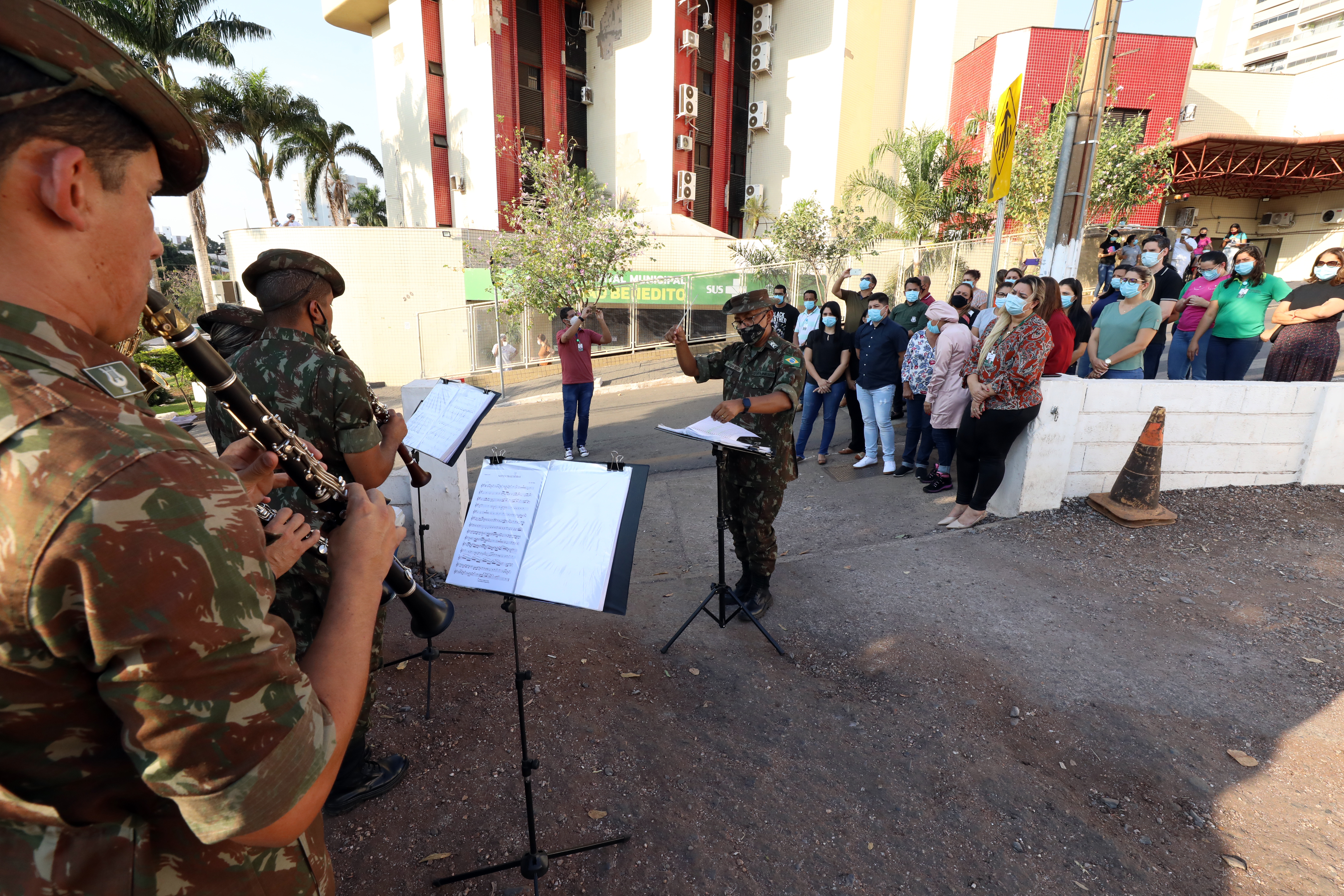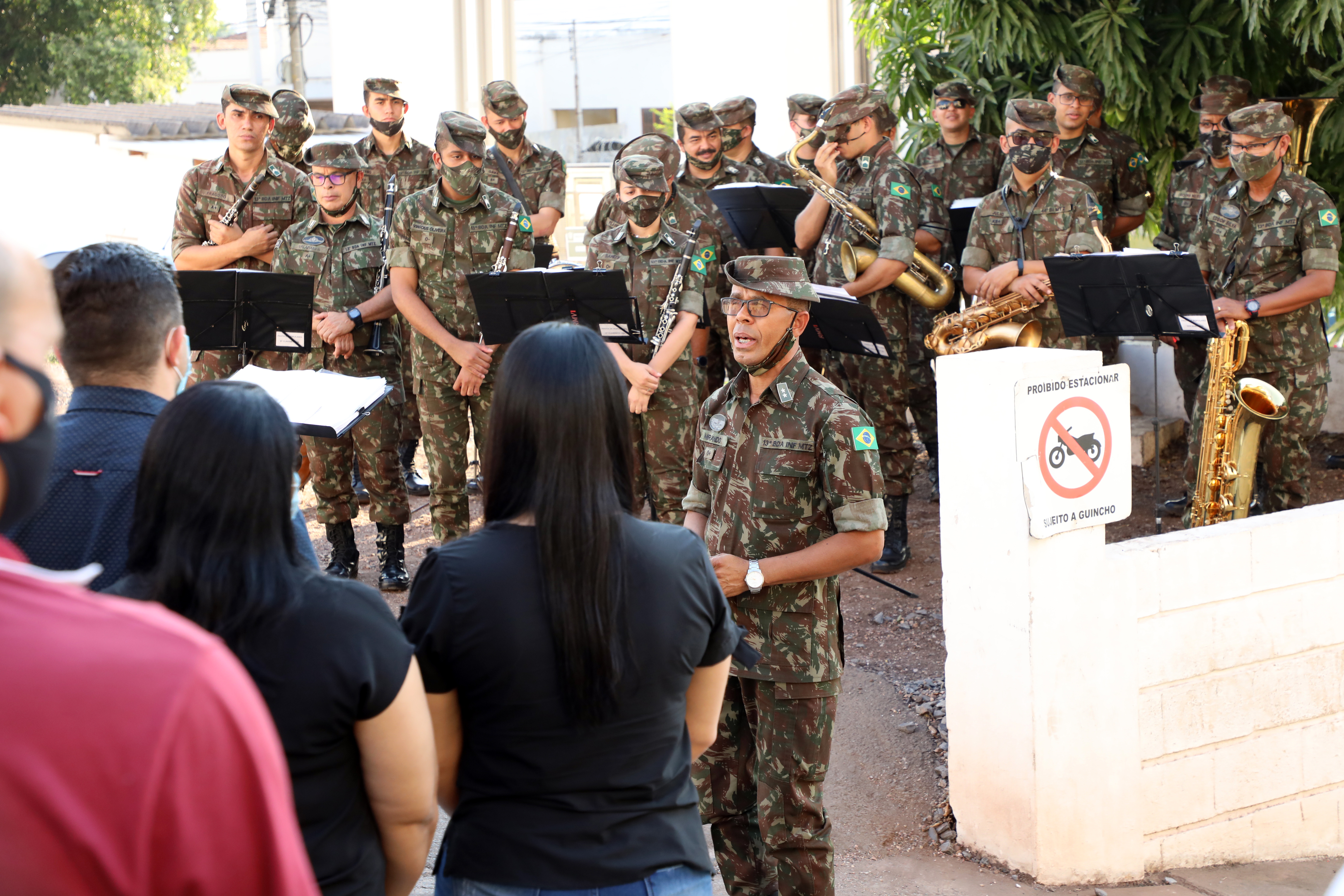 A banda da 13ª Brigada de Infantaria Motorizada adida ao Quadragésimo Quarto Batalhão de Infantaria Motorizada se apresentou na tarde de terça-feira (24), no estacionamento do Hospital Municipal São Benedito, em Cuiabá, levando emoção e descontração aos profissionais de saúde e aos pacientes que estão internados naquela unidade, que funciona exclusivamente para tratamento da covid-19.