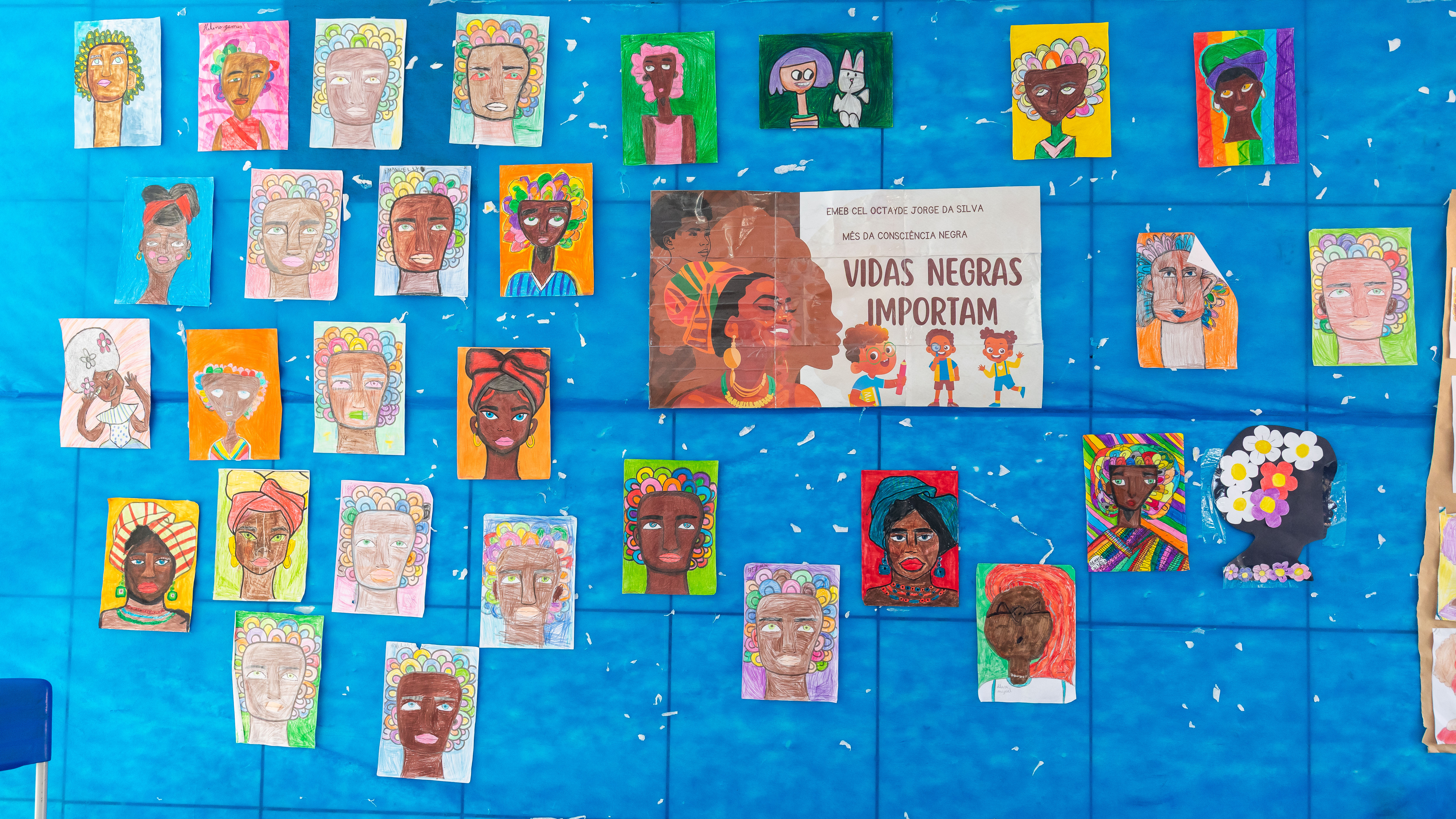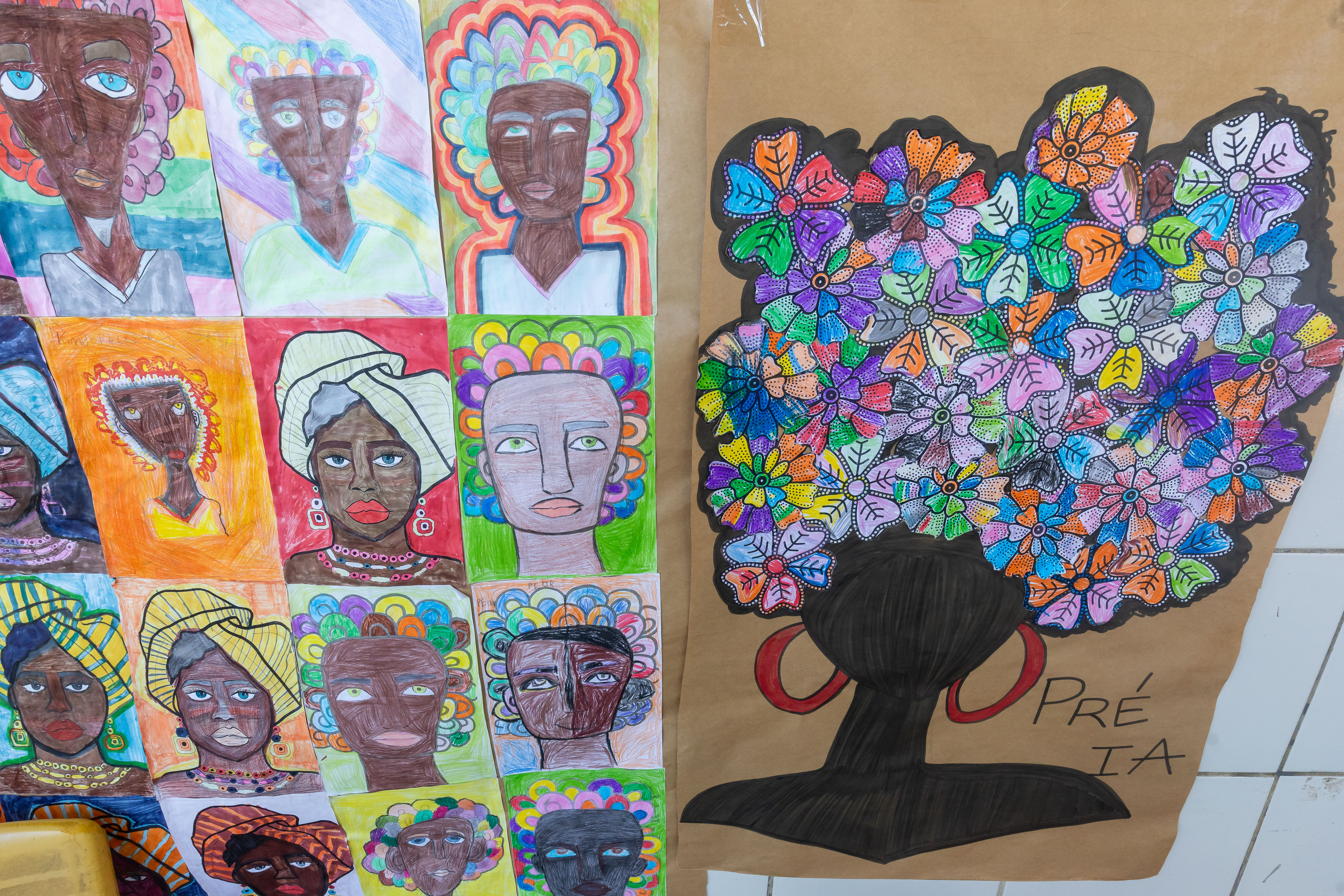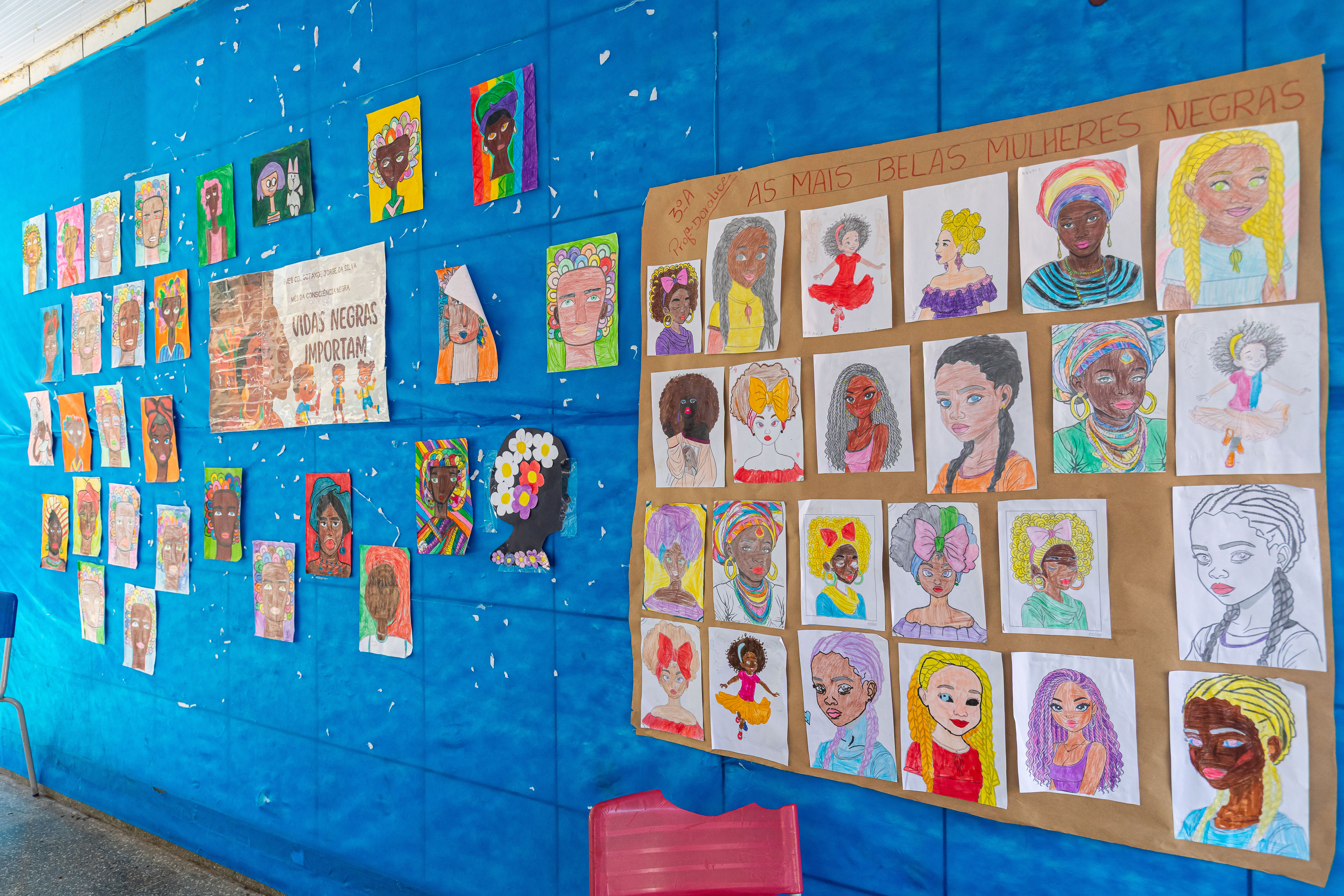 Um trabalho de valorização da beleza da mulher negra culminou numa exposição de arte produzida em cartolinas no pátio da Escola Municipal de Educação Básica (EMEB) Octayde Jorge da Silva, localizada no bairro Tancredo Neves.
