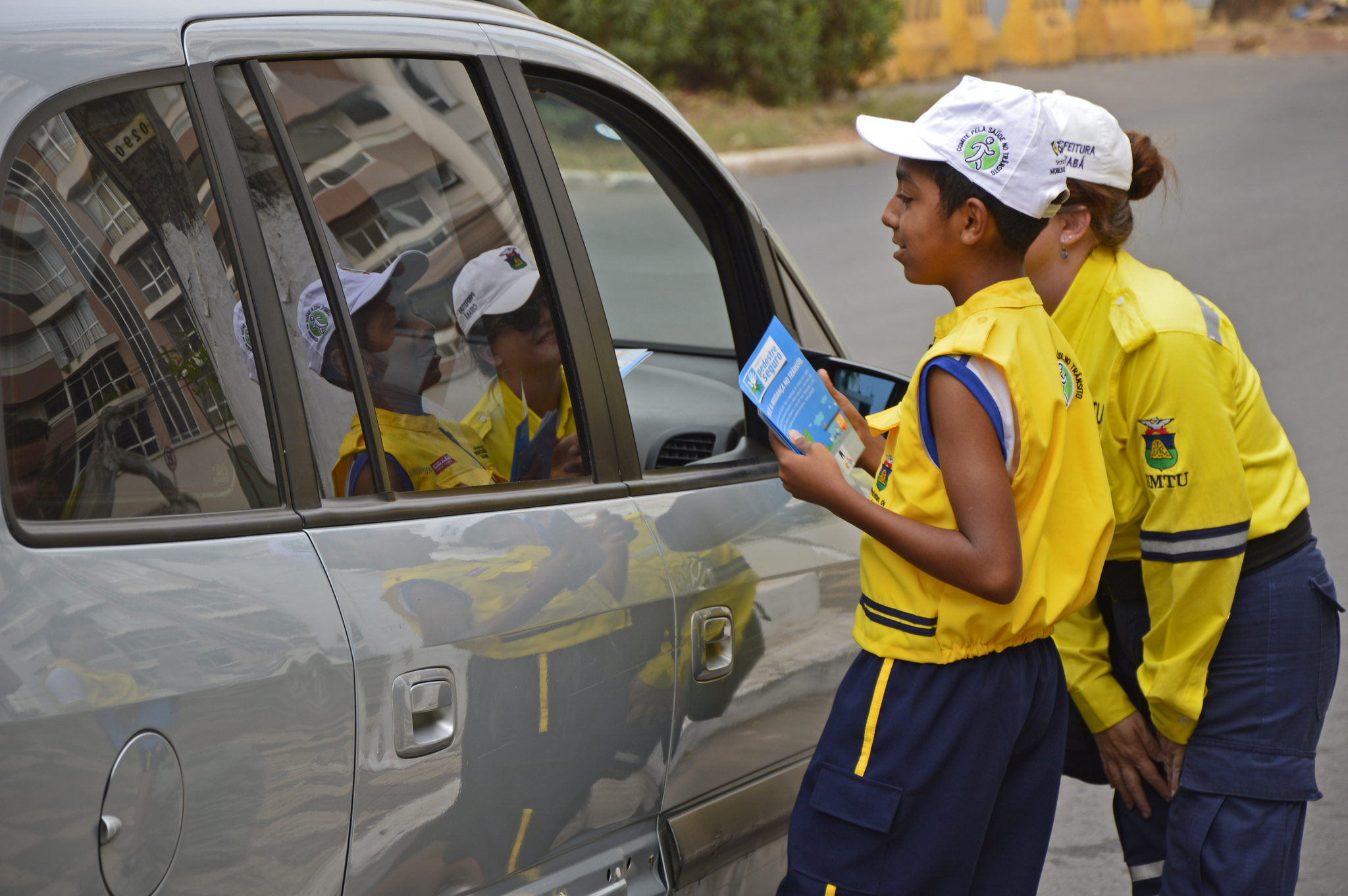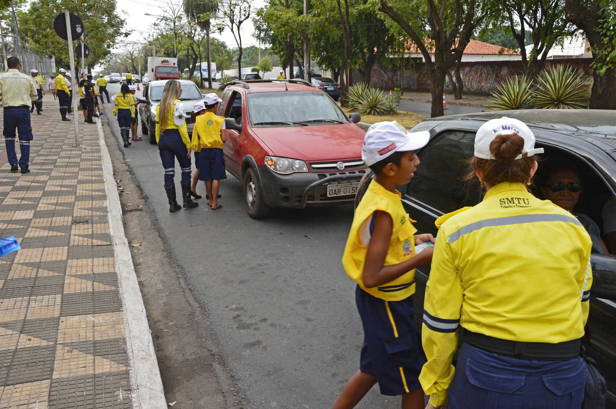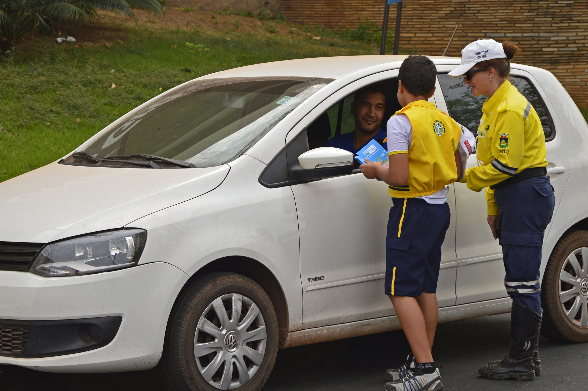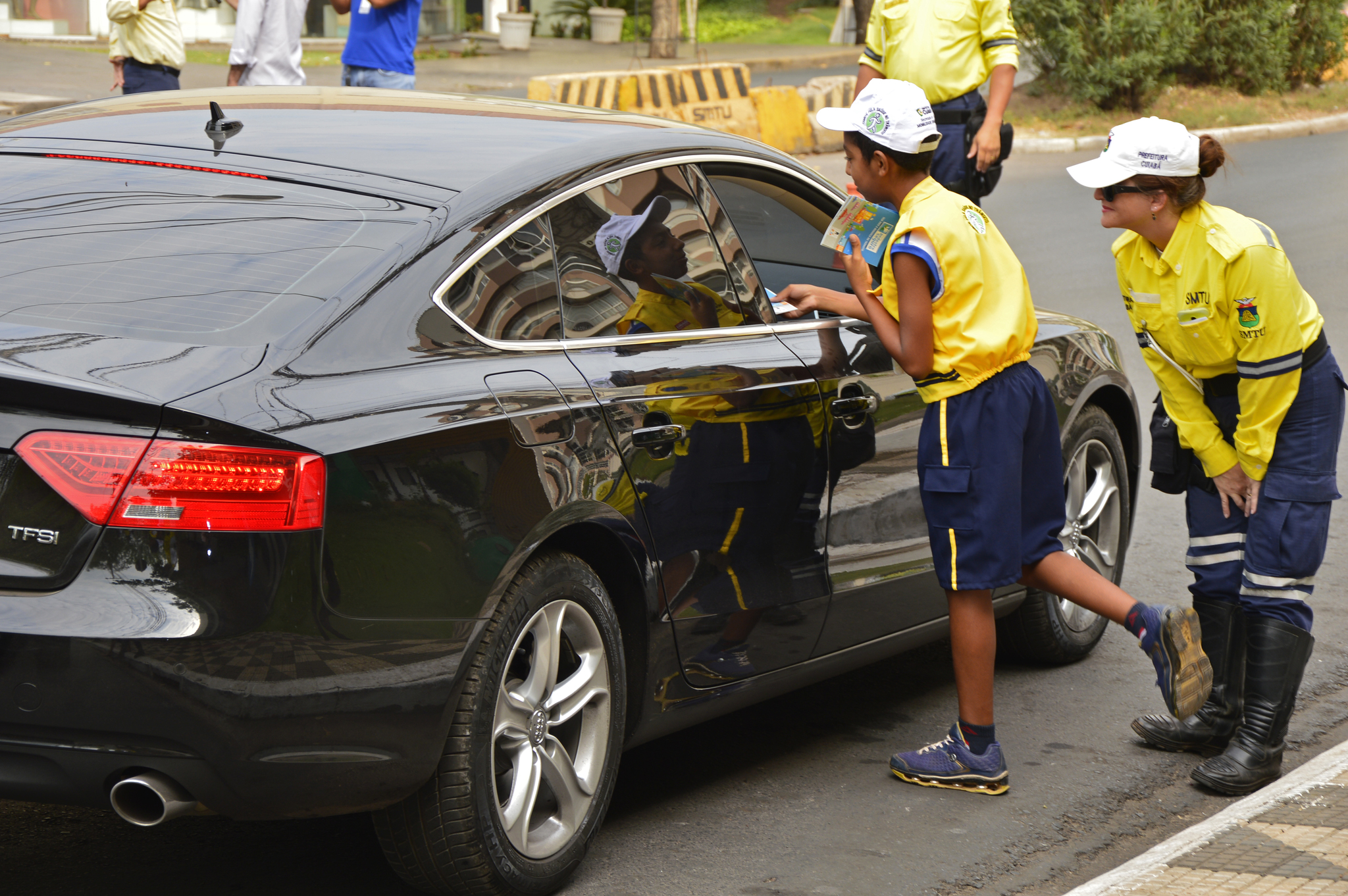 Dez agentes mirins de Trânsito, com idade entre 9 e 12 anos, participaram de uma blitz educativa na manhã desta sexta-feira (25) no encerramento da Semana Nacional de Trânsito 2015. Ao lado de agentes de Trânsito da Secretaria de Mobilidade Urbana (Semob) e do Detran-MT, eles distribuíram na Avenida Lava Pés (próximo ao shopping) folhetos e a cartilha “Pedestre Seguro”, orientando motoristas e pedestres da importância de se respeitar as faixas de pedestres.