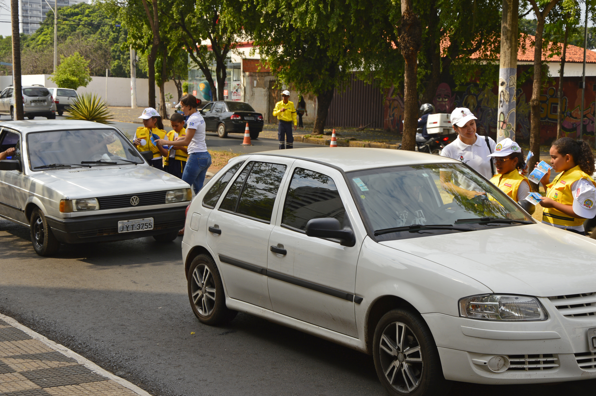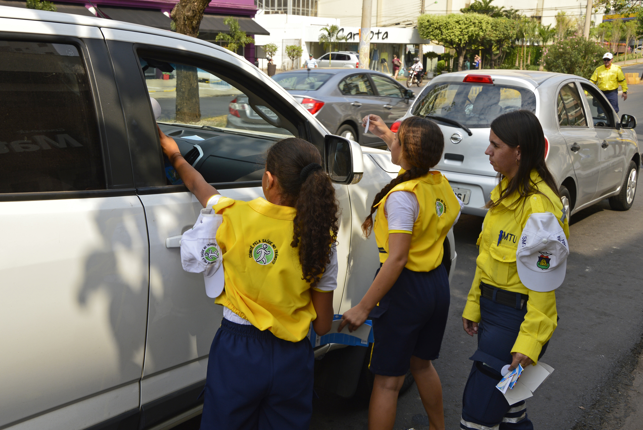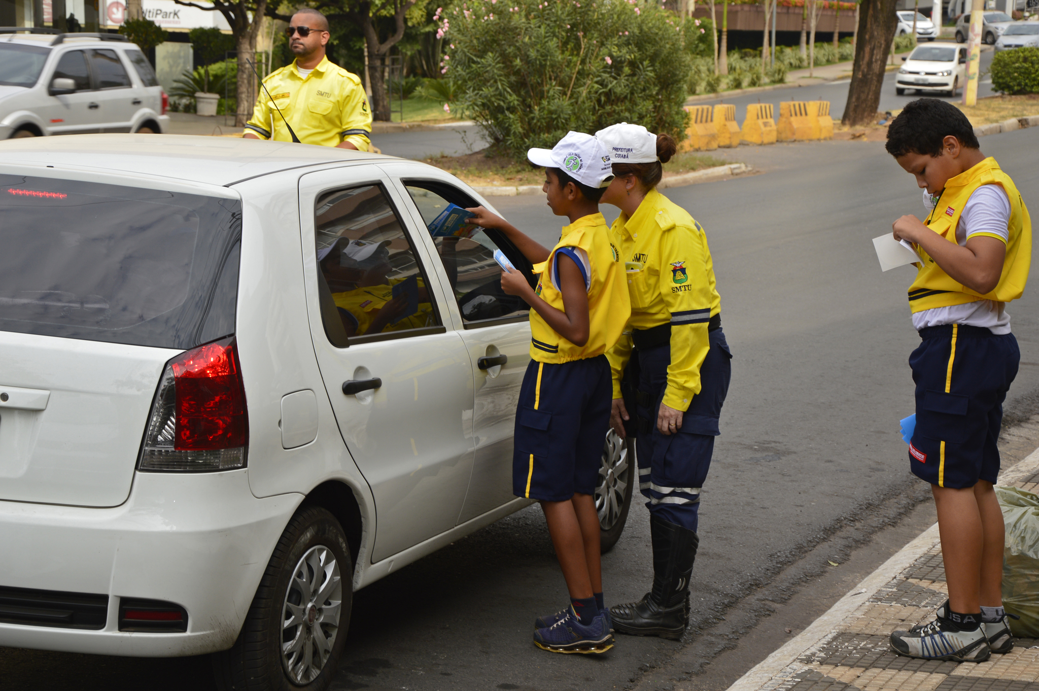 Dez agentes mirins de Trânsito, com idade entre 9 e 12 anos, participaram de uma blitz educativa na manhã desta sexta-feira (25) no encerramento da Semana Nacional de Trânsito 2015. Ao lado de agentes de Trânsito da Secretaria de Mobilidade Urbana (Semob) e do Detran-MT, eles distribuíram na Avenida Lava Pés (próximo ao shopping) folhetos e a cartilha “Pedestre Seguro”, orientando motoristas e pedestres da importância de se respeitar as faixas de pedestres.