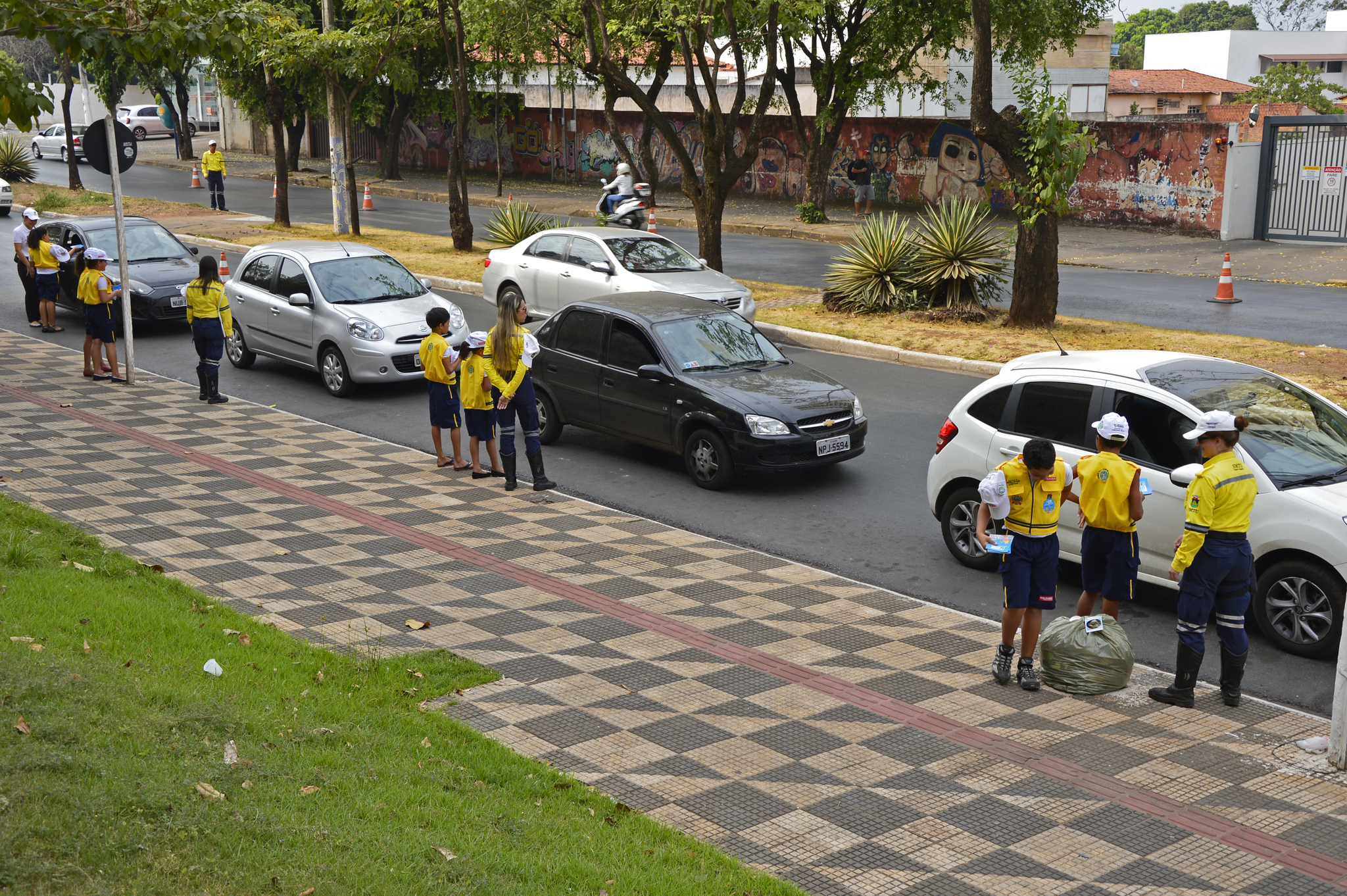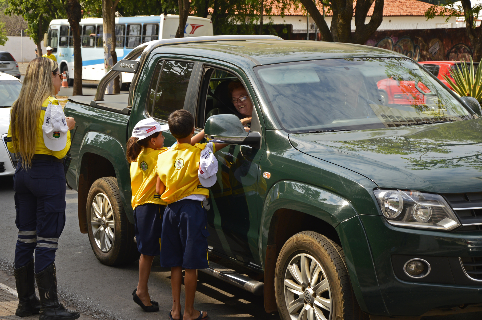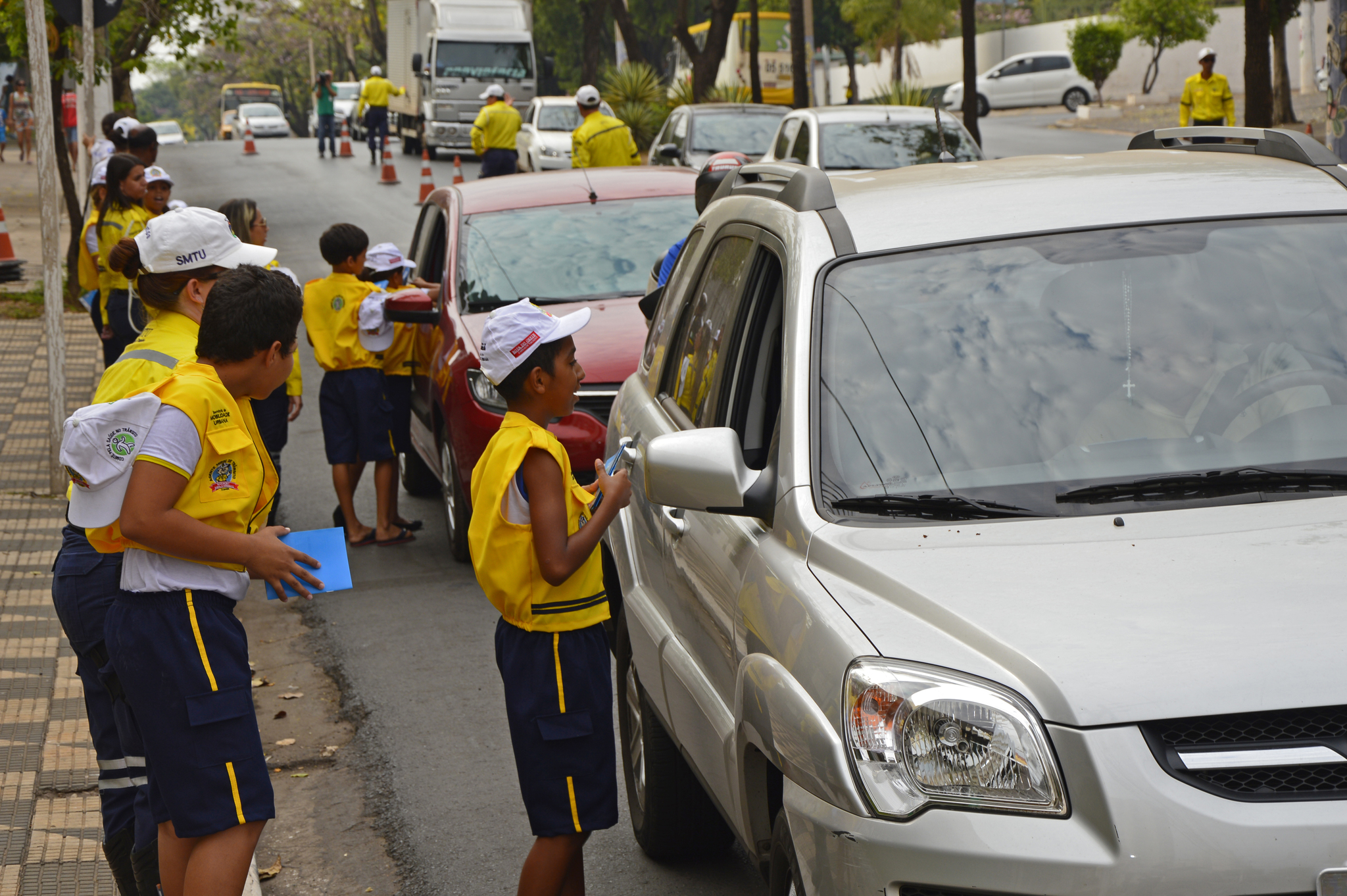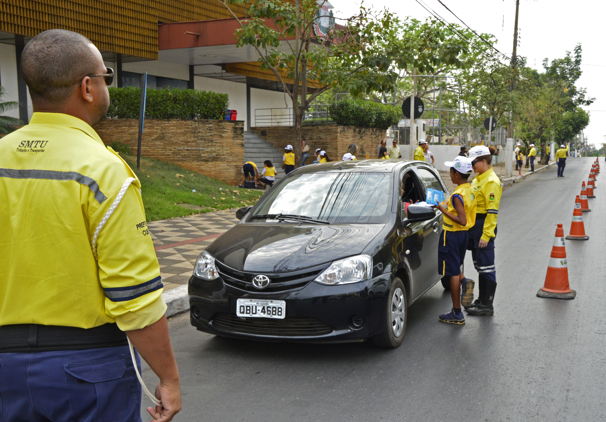 Dez agentes mirins de Trânsito, com idade entre 9 e 12 anos, participaram de uma blitz educativa na manhã desta sexta-feira (25) no encerramento da Semana Nacional de Trânsito 2015. Ao lado de agentes de Trânsito da Secretaria de Mobilidade Urbana (Semob) e do Detran-MT, eles distribuíram na Avenida Lava Pés (próximo ao shopping) folhetos e a cartilha “Pedestre Seguro”, orientando motoristas e pedestres da importância de se respeitar as faixas de pedestres.
