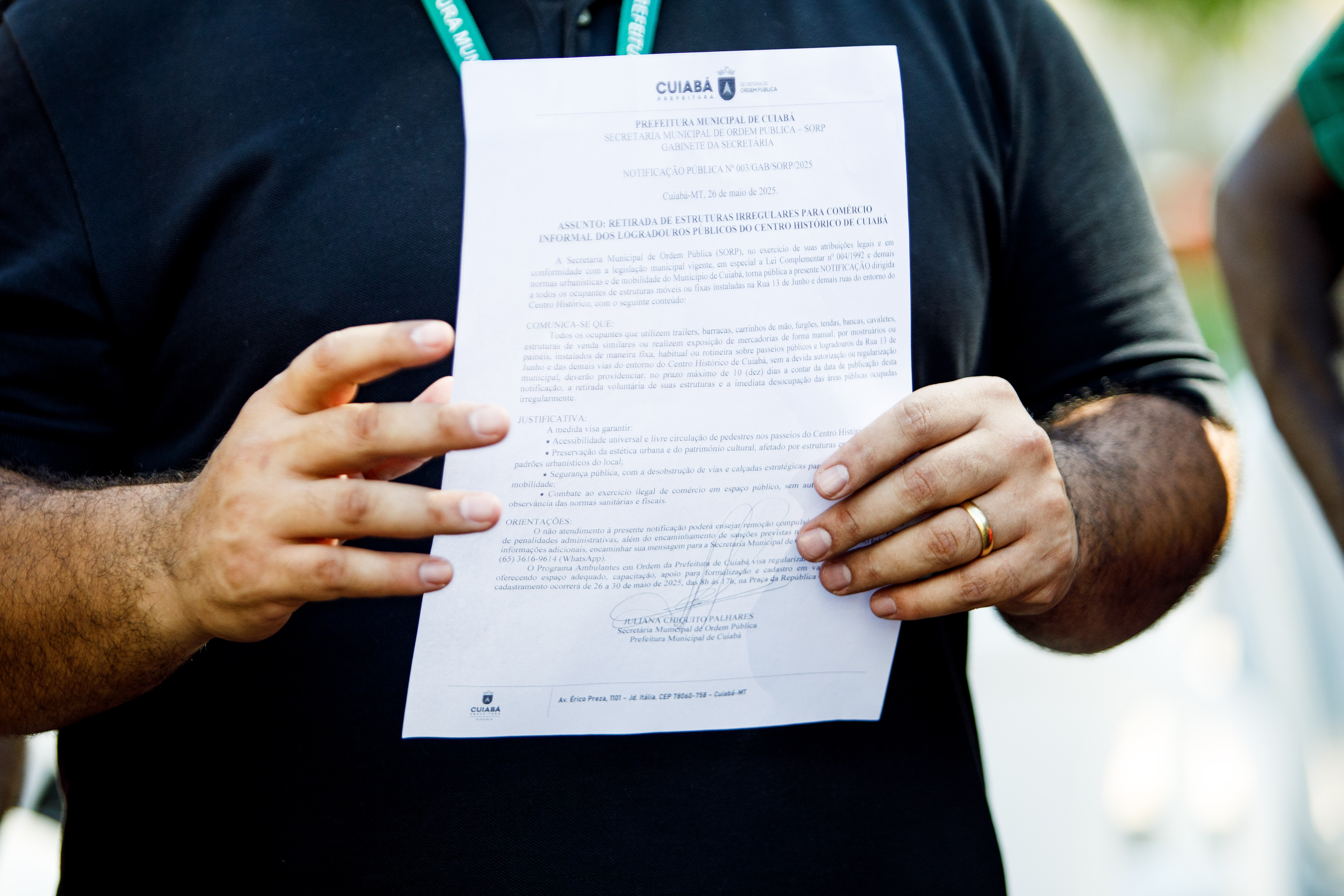 Também foi entregue a Notificação Pública nº 003/25, informando o prazo de 10 dias para retirada voluntária das estruturas móveis e desocupação imediata das áreas públicas ocupadas irregularmente. Após o vencimento do prazo, a fiscalização será intensificada.