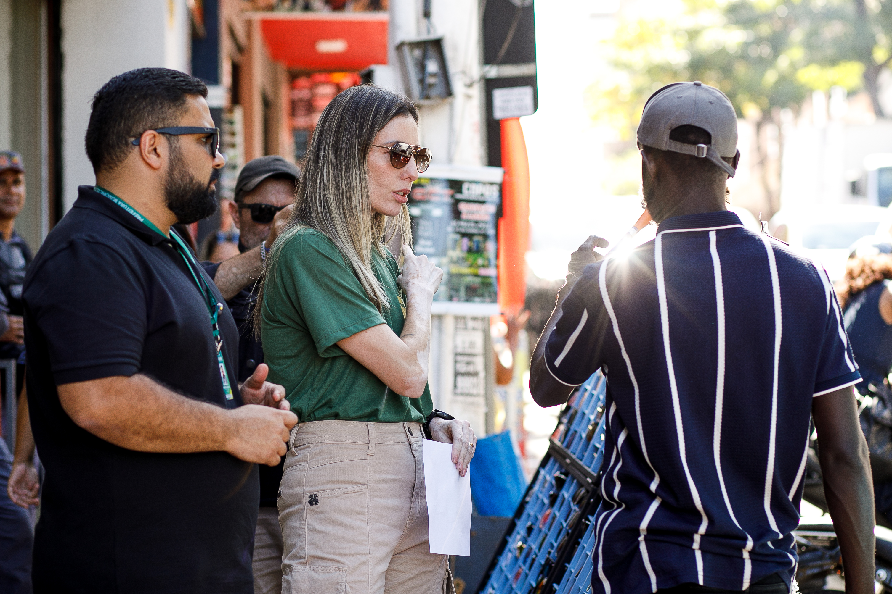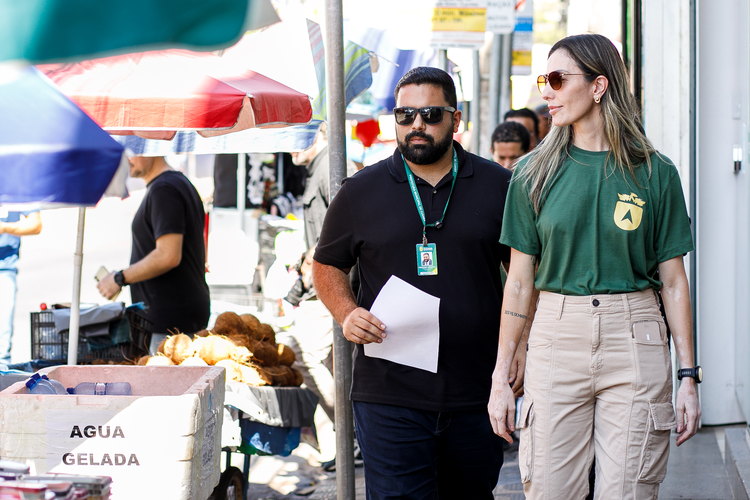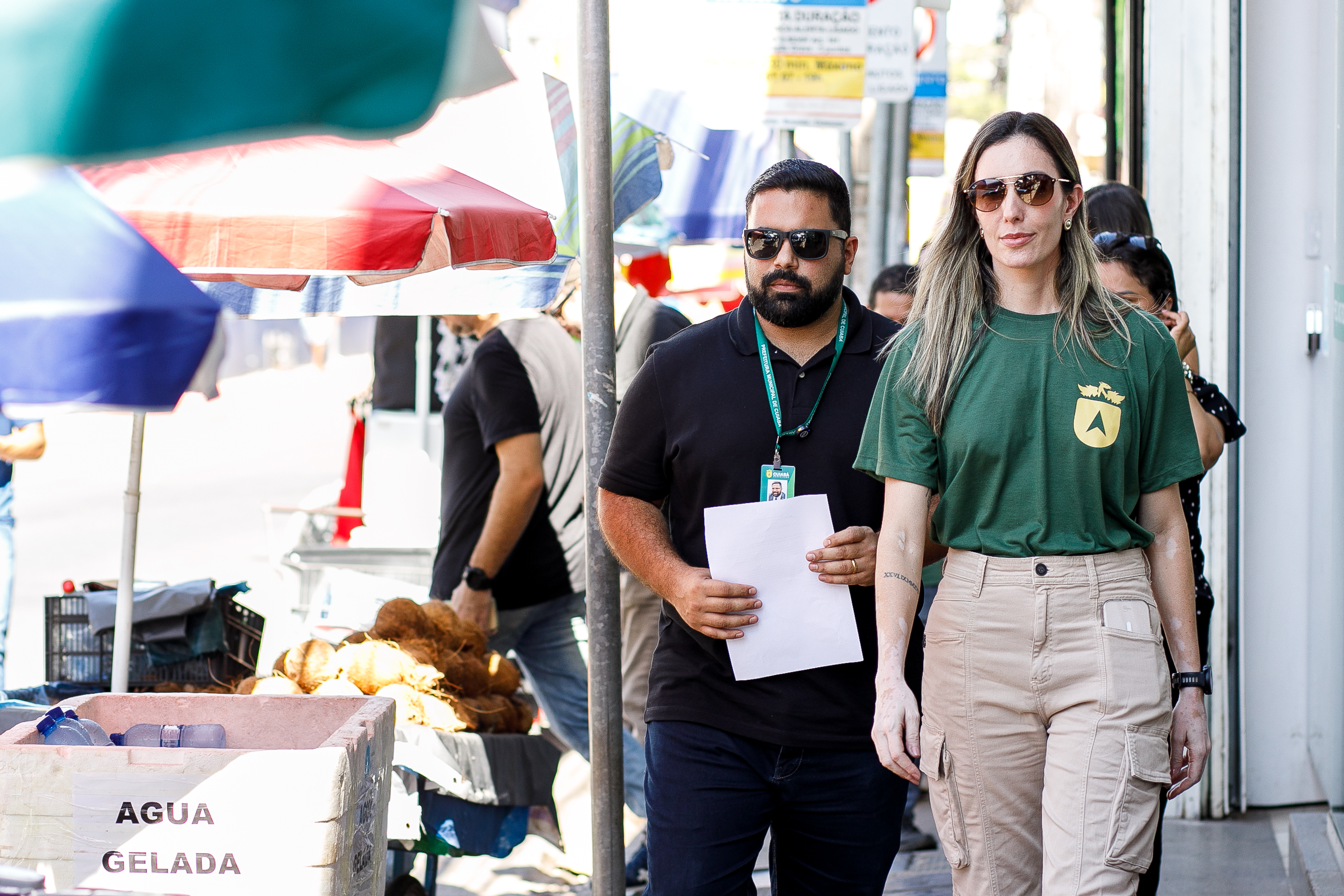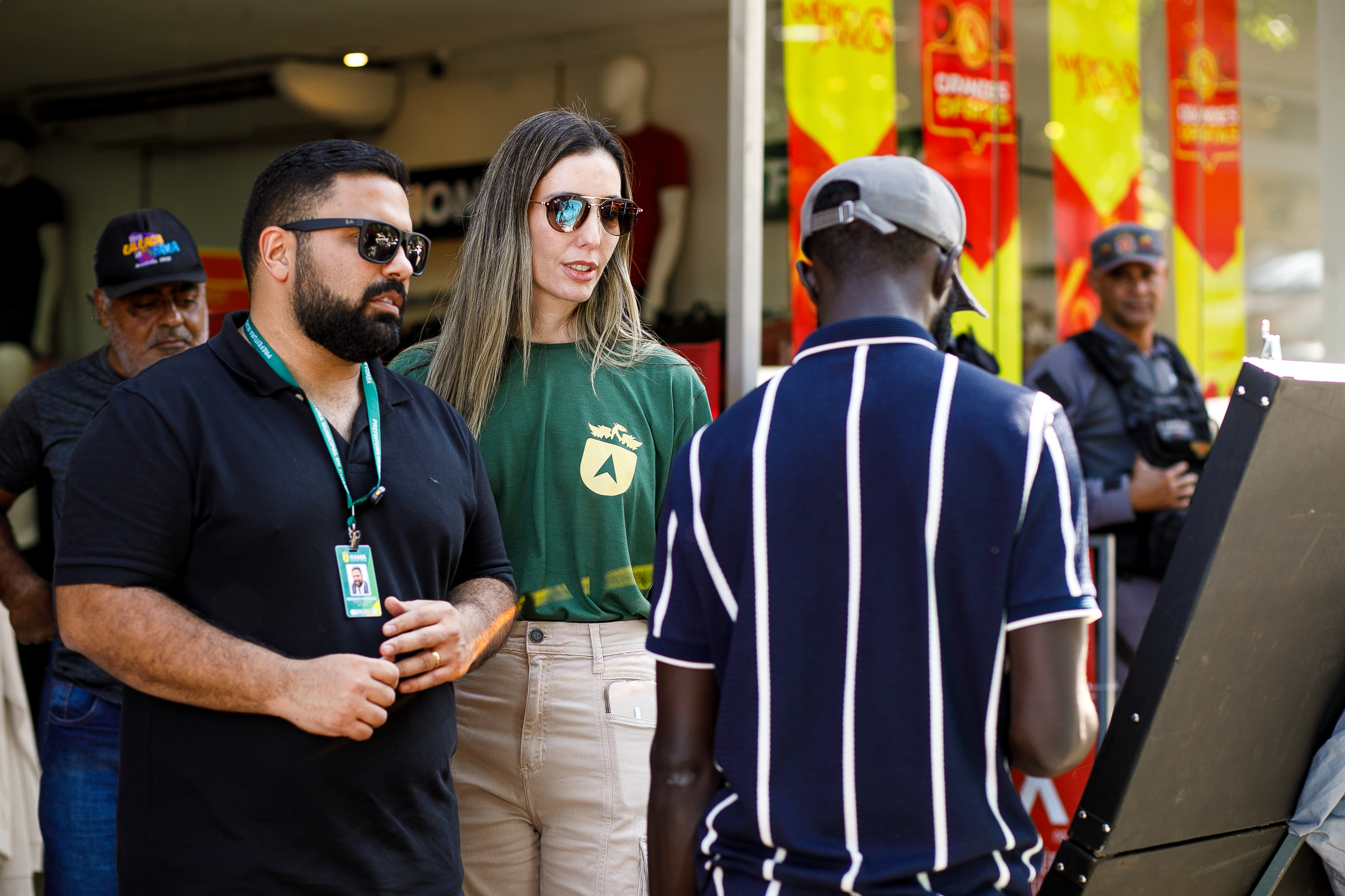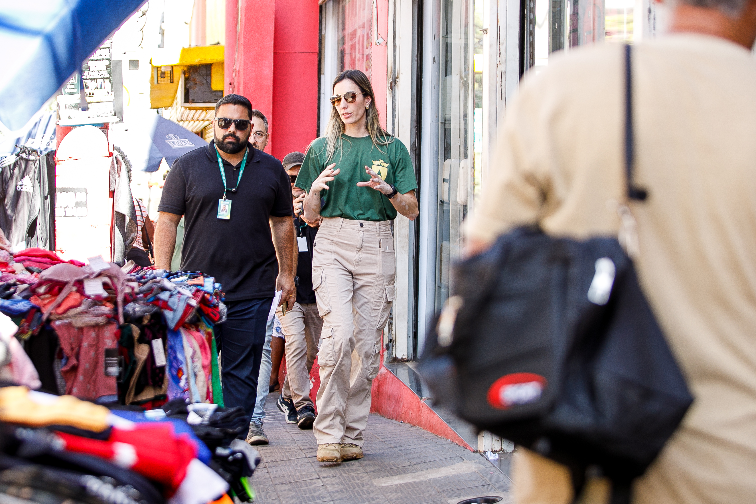 A foto mostra a secretária municipal de Ordem Pública, Juliana Palhares, e o secretário de Turismo e Desenvolvimento Econômico, Fernando Medeiros, durante ação para notificação dos comerciantes ambulantes da região central.