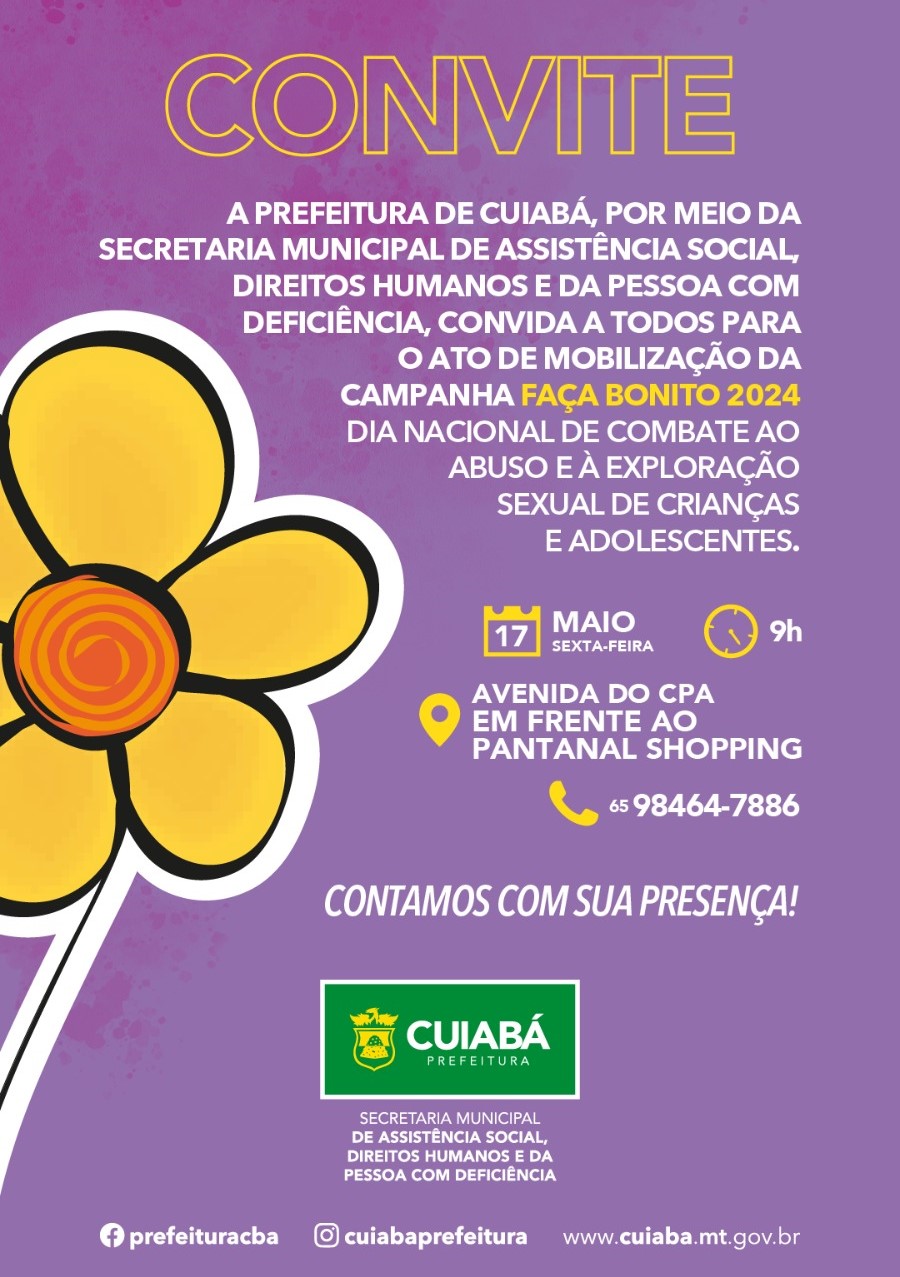 A Prefeitura de Cuiabá, por meio da Secretaria Municipal de Assistência Social, Direitos Humanos e da Pessoa com Deficiência, convida para o 'Ato de Mobilização da Campanha Faça Bonito 2024', que acontece nesta sexta-feira (17), a partir das 9h, na Avenida do CPA, bem em frente ao Shopping Pantanal. A ação é alusiva ao Dia Nacional de Combate ao Abuso e à Exploração Sexual contra Crianças e Adolescentes, celebrado nacionalmente em 18 de maio, tendo como principal objetivo chamar a atenção da população sobre esse assunto. Folders informativos serão distribuídos para os motoristas e pedestres que passarem pelo local.