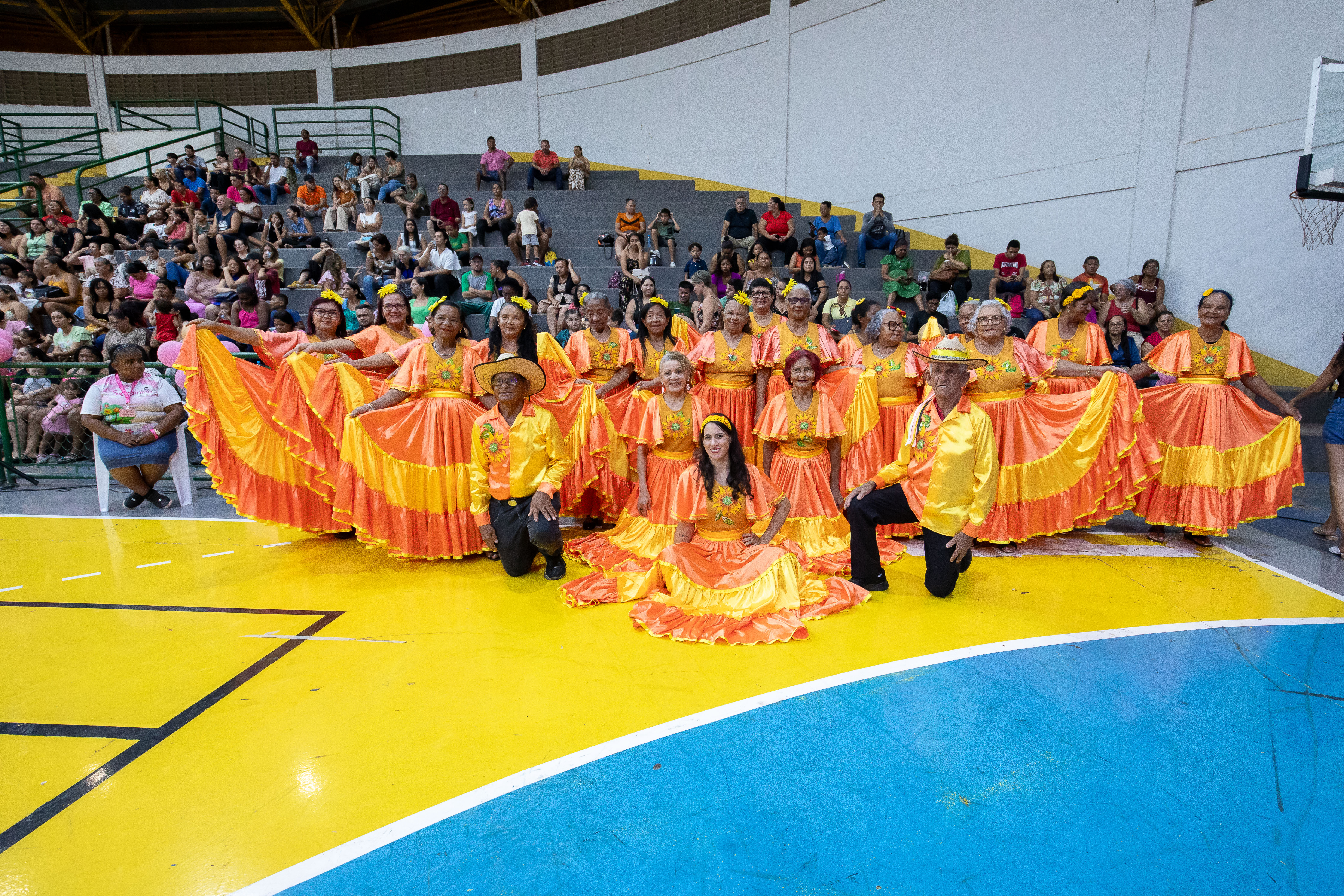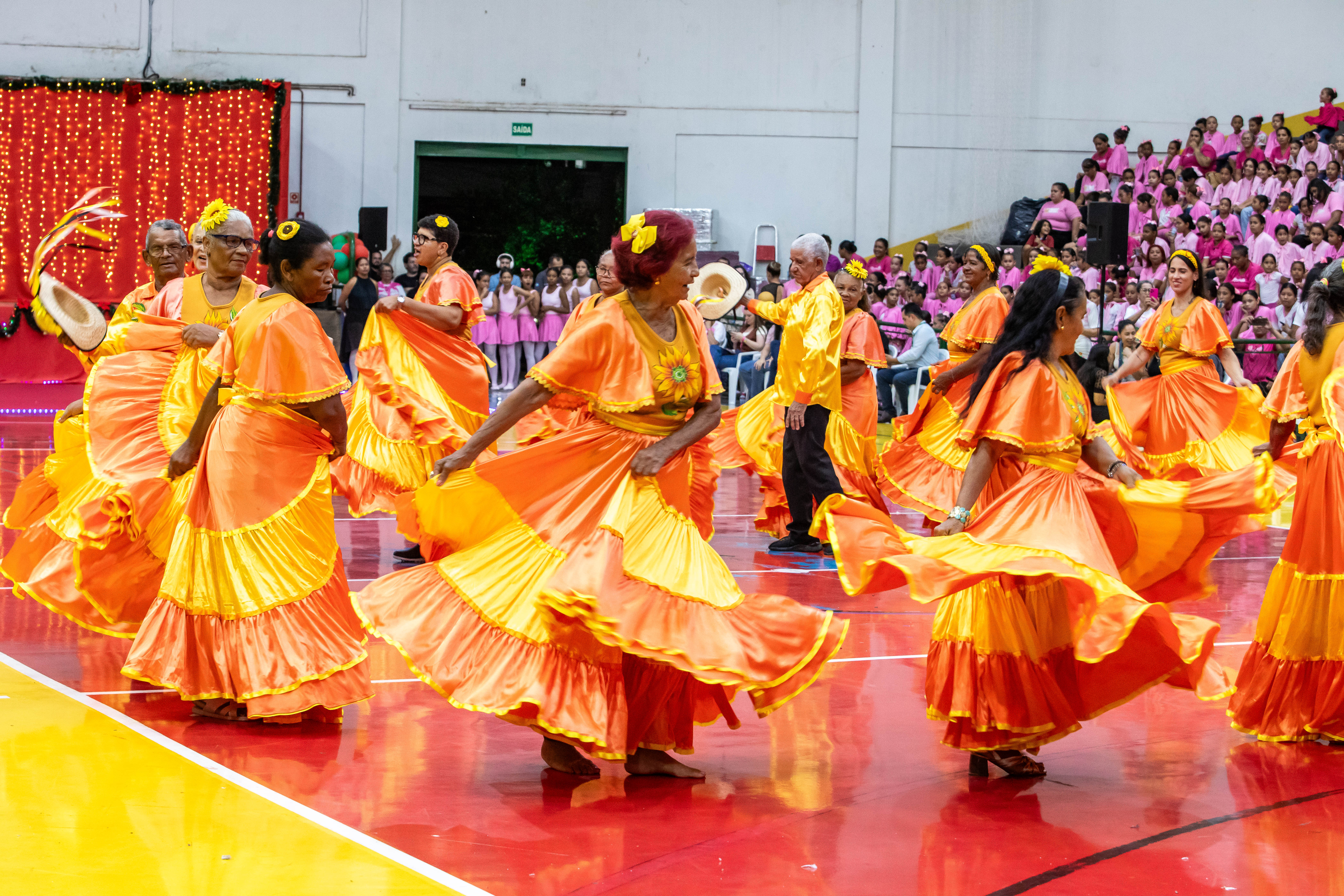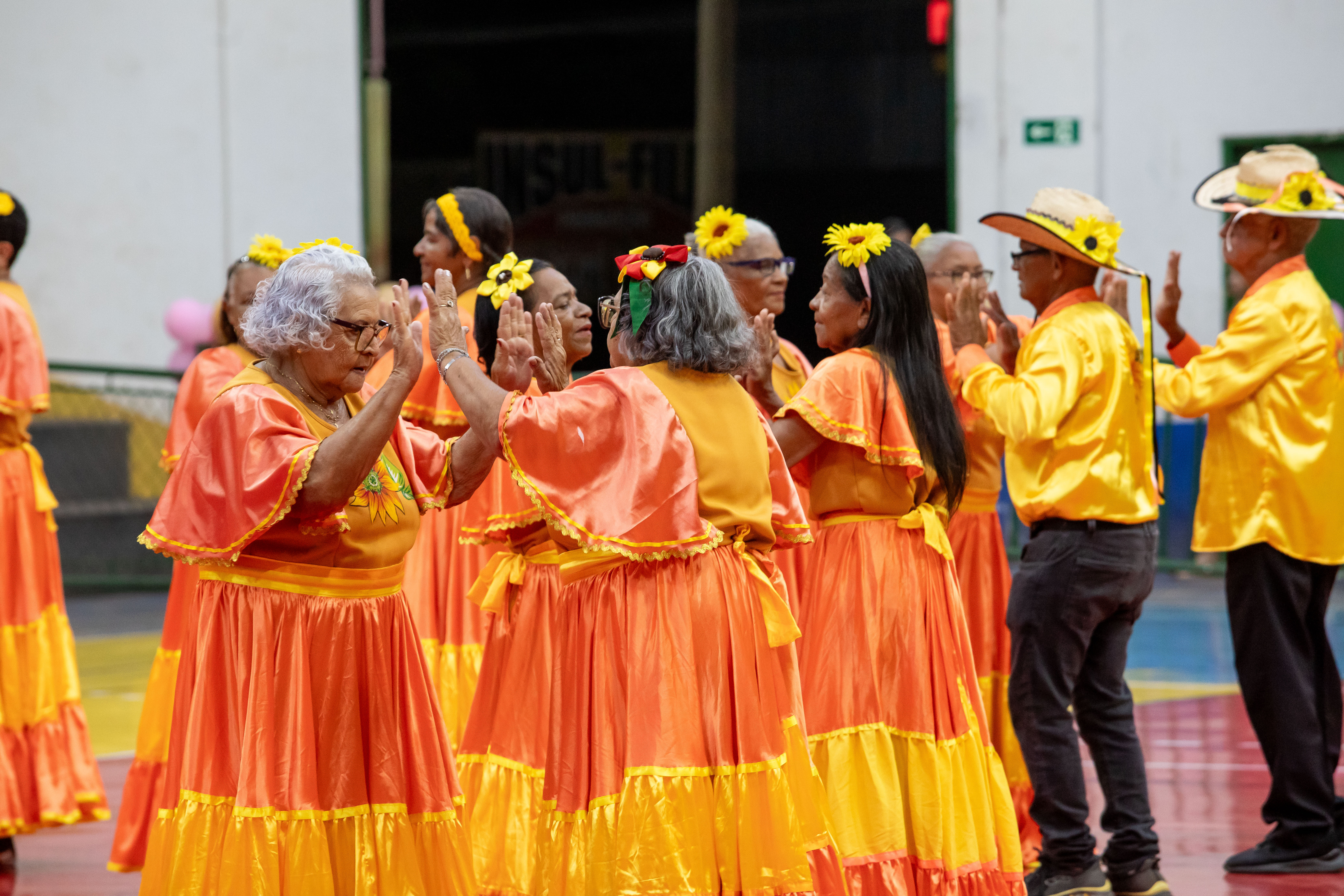 A segunda parte da noite ganhou contornos especiais. O Ginásio Verdinho se transformou em palco de encontros entre gerações, quando o grupo do CCI Padre Firmo entrou em cena com trajes típicos cuiabanos, coloridos e cheios de alegria. O siriri dos idosos arrancou aplausos demorados e sorrisos cúmplices, como quem reconhece na dança a memória viva da cidade.