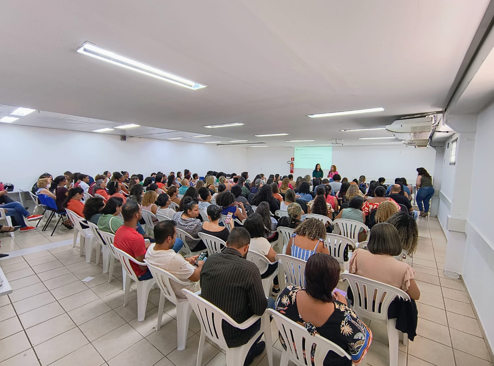 A imagem principal mostra um auditório lotado com servidores que receberam informações atentamente. Na galeria outros dois ângulos foram retratados do mesmo espaço.
