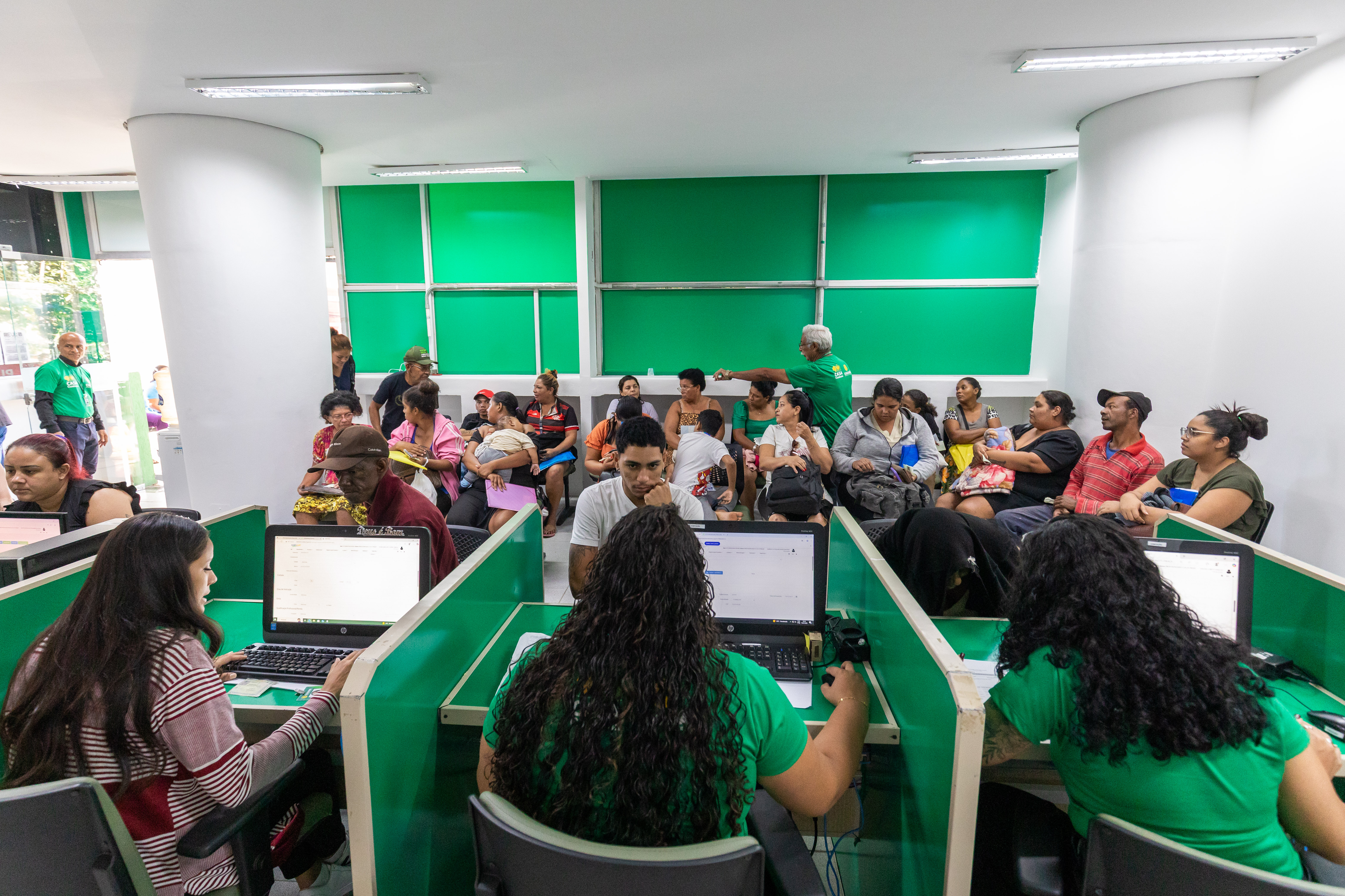 A imagem mostra servidores da Secretaria Municipal de Habitação e Regularização Fundiária em atendimento a munícipes durante cadastros do programa habitacional Casa Cuiabana.