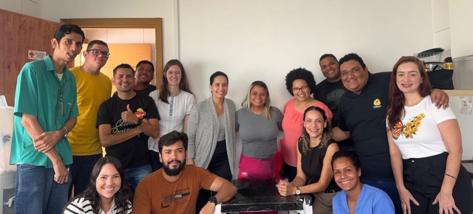 A imagem mostra um grupo de servidores que fazem parte do CEREST, tema abordado no texto. Na imagem, há uma mesa grande à frente do grupo, que está todo posicionado em pé para o retrato.