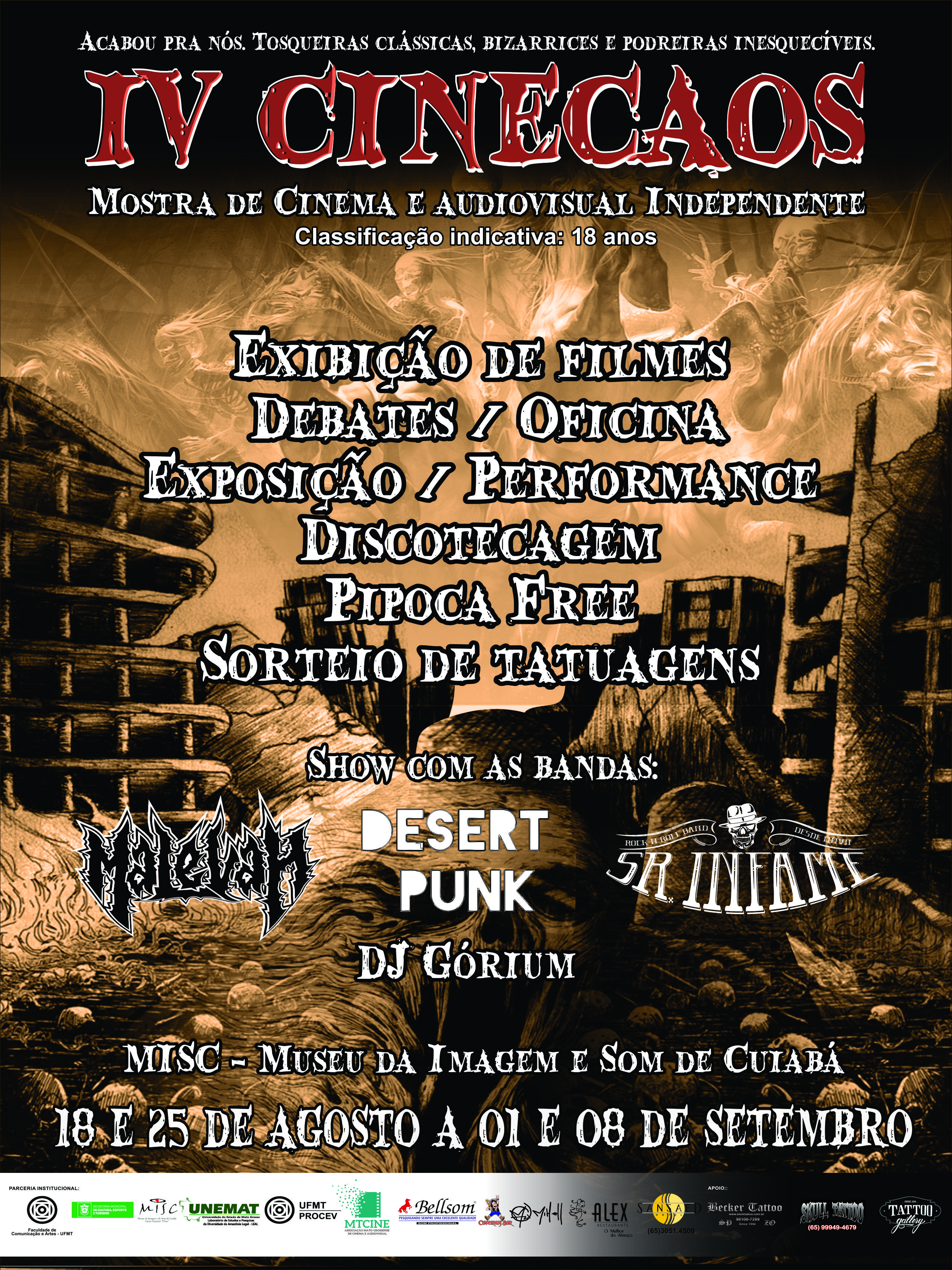 A IV CineCaos, mostra de cinema e audiovisual independente que acontece a partir de sábado (18), no Museu de Imagem e do Som de Cuiabá (Misc) é dedicada a produções de estilo “trash". A programação inclui, debates, performances, shows, oficinas, sorteio de tatuagens e discotecagem.