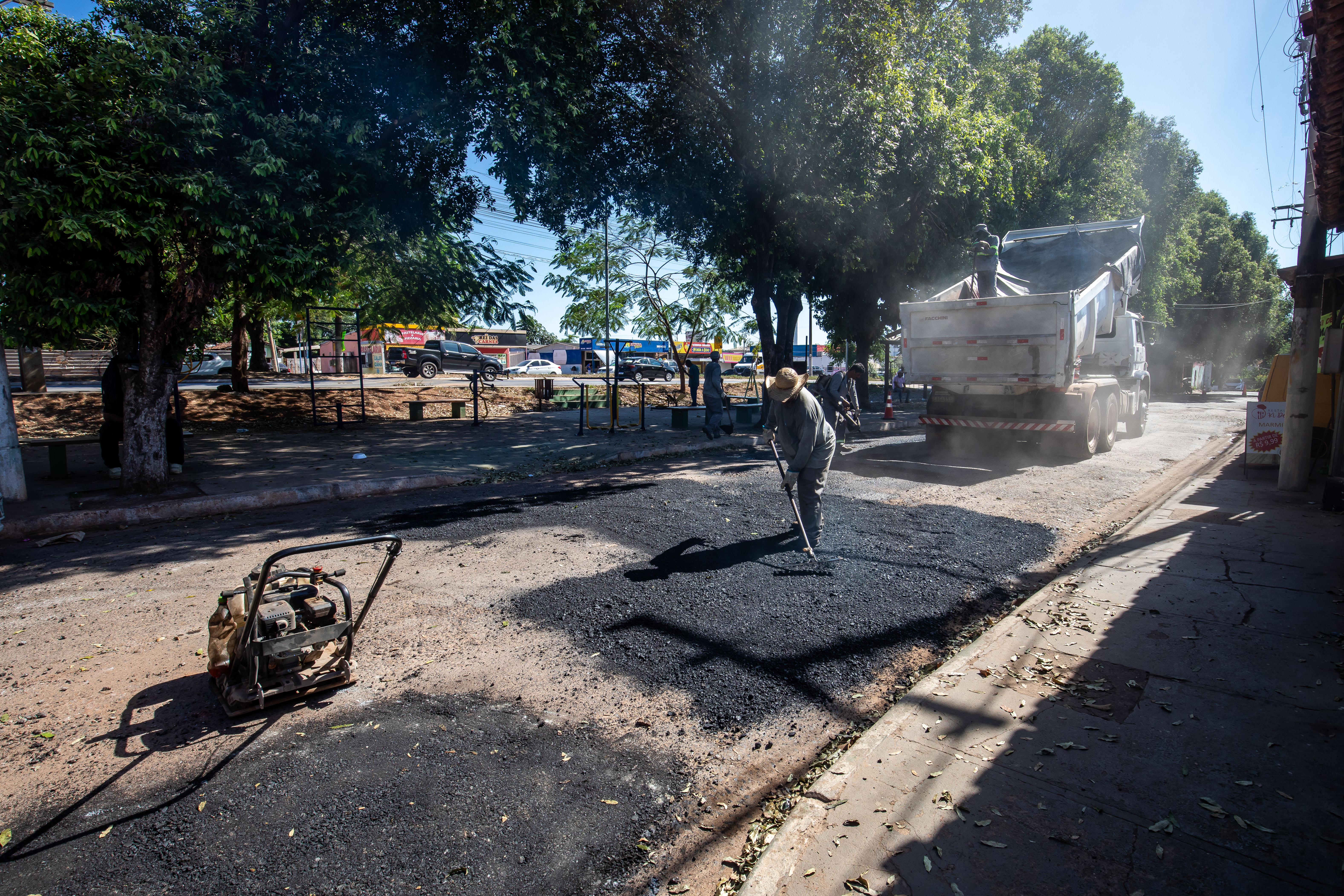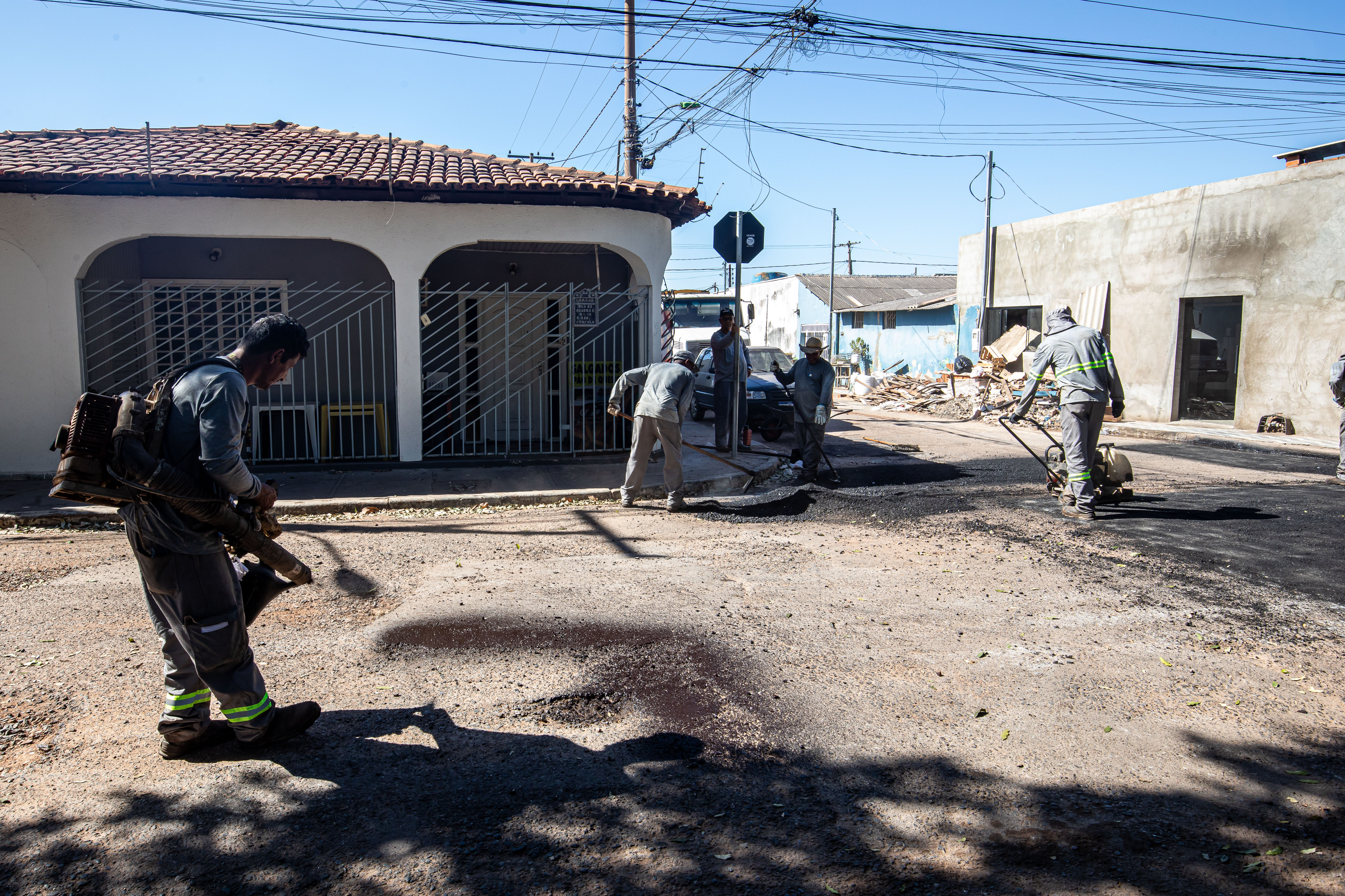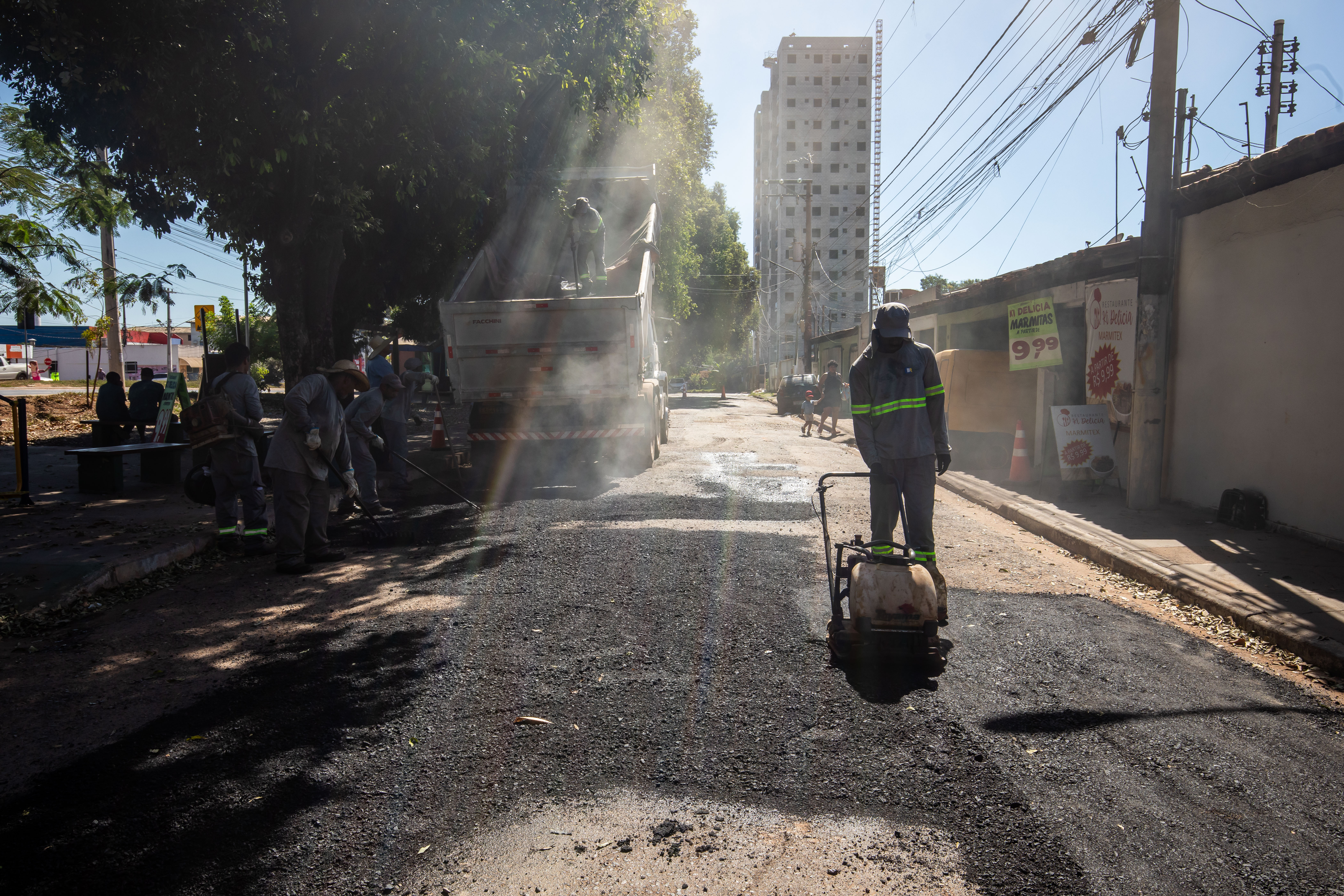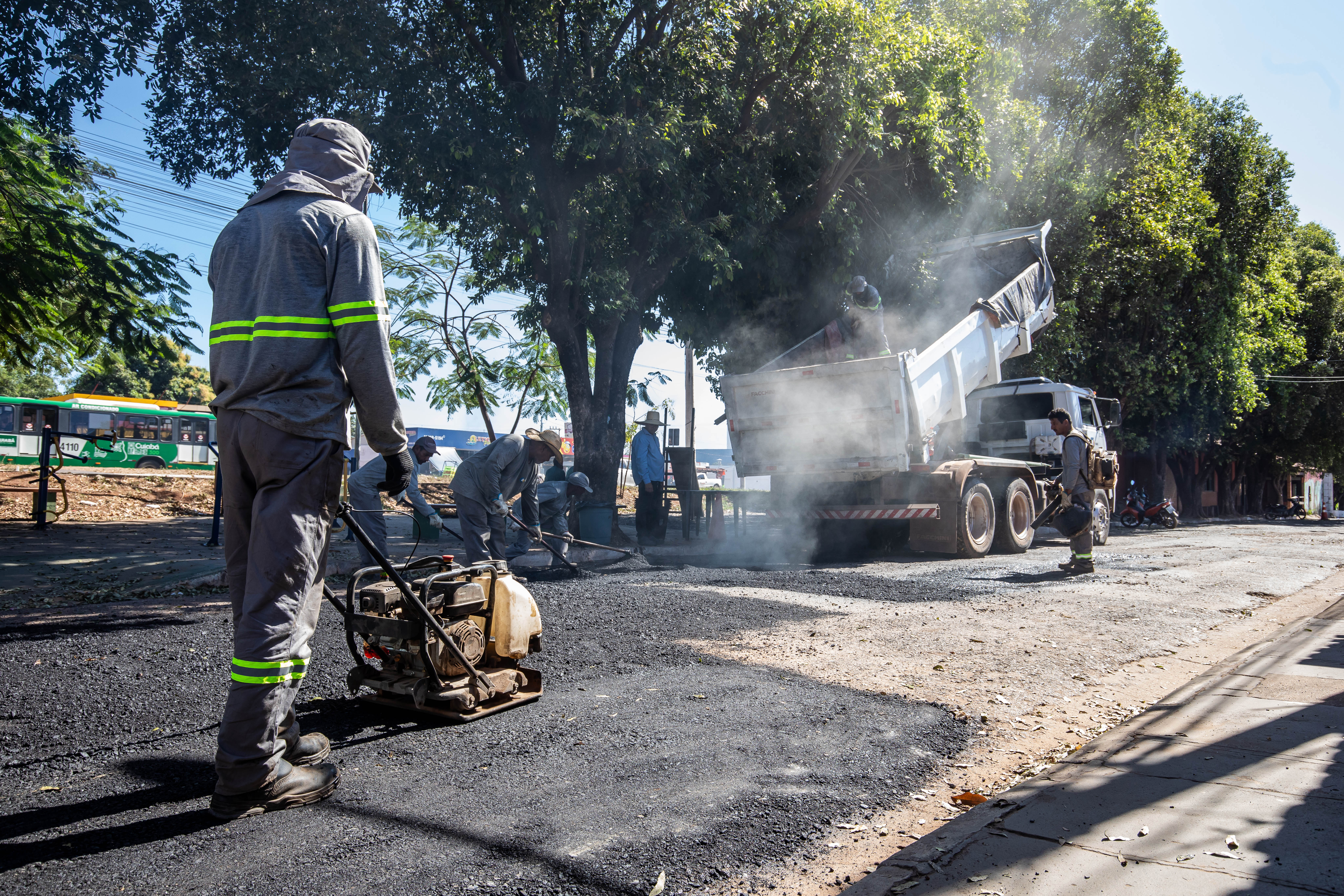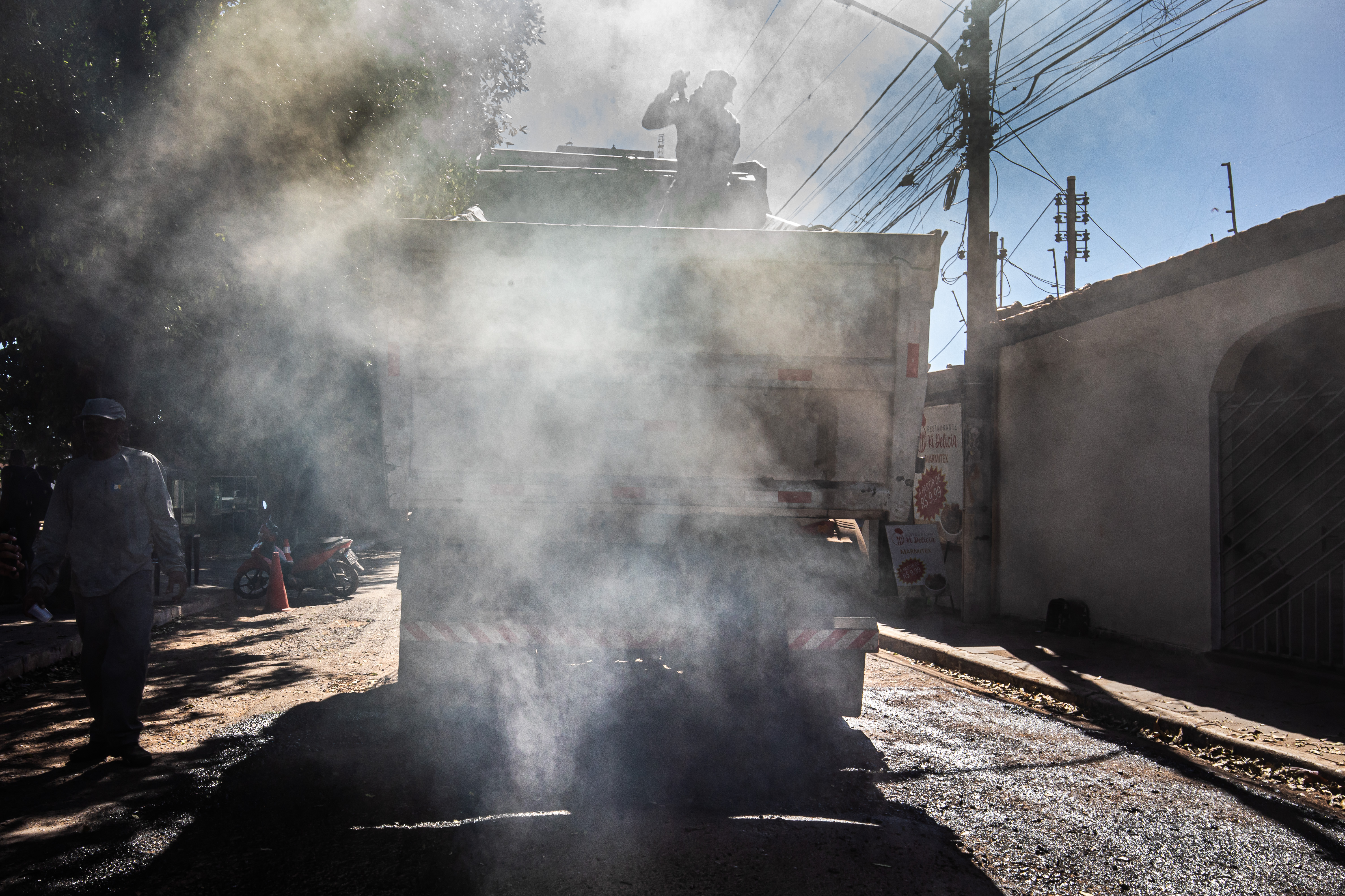O serviço tem início com o preparo das vias, que inclui a limpeza da área com motobomba. Em alguns casos, é necessário remover a umidade do solo com o apoio de caminhão-pipa. Na sequência, é aplicado o concreto betuminoso usinado a quente (CBUq), material utilizado por sua alta resistência e durabilidade. O procedimento é finalizado com o rastelamento e a compactação da massa asfáltica, utilizando rolo compactador para nivelamento e acabamento.