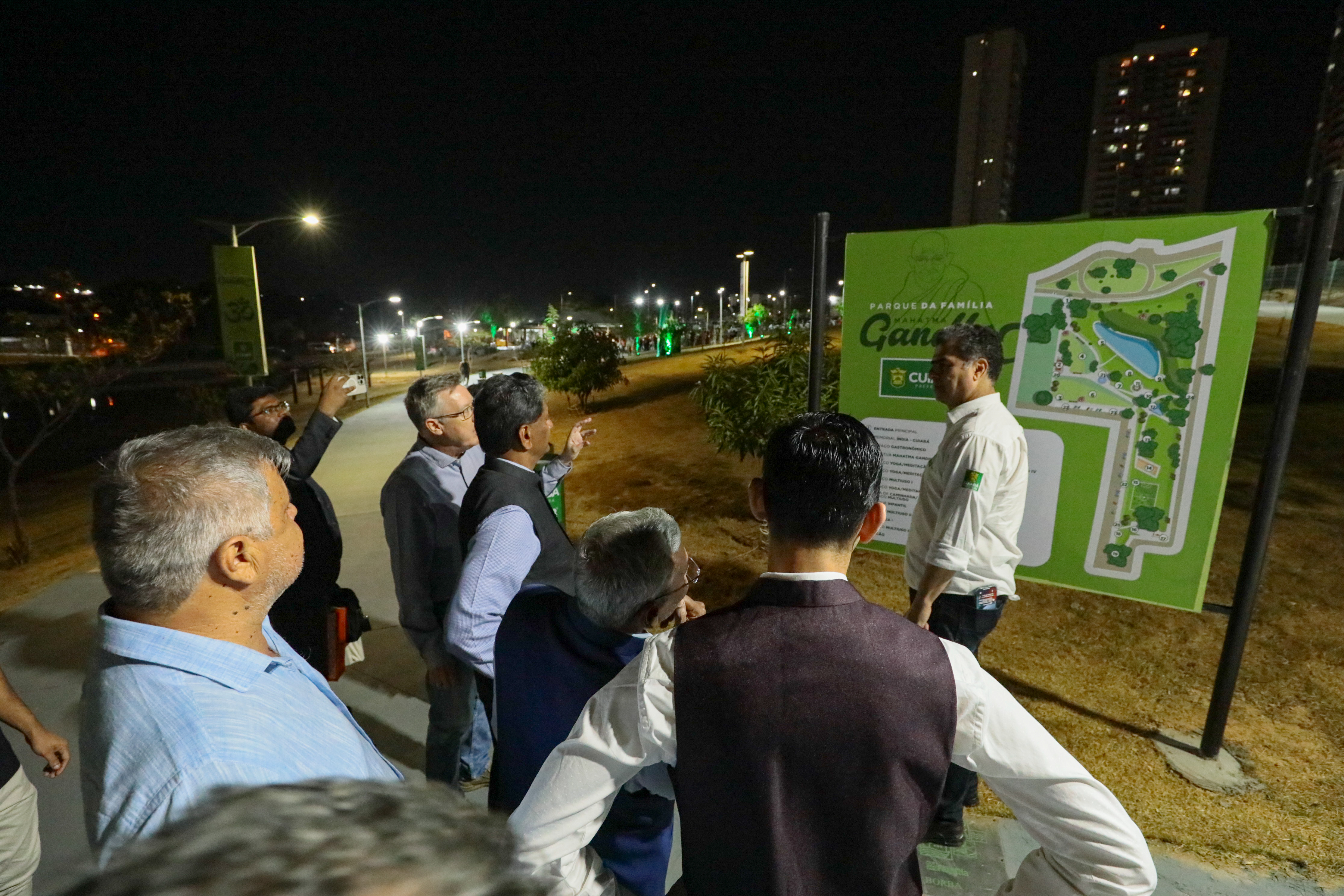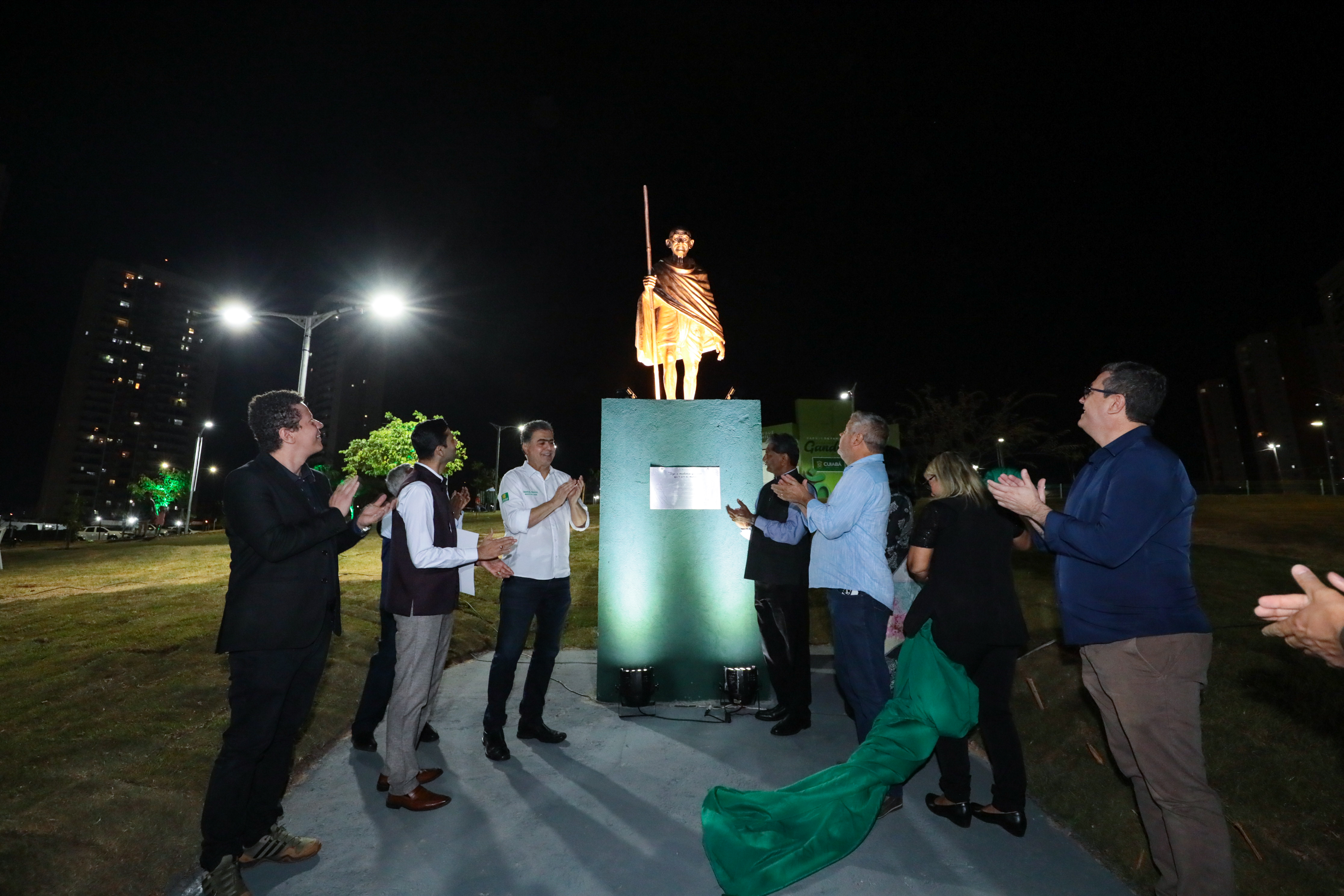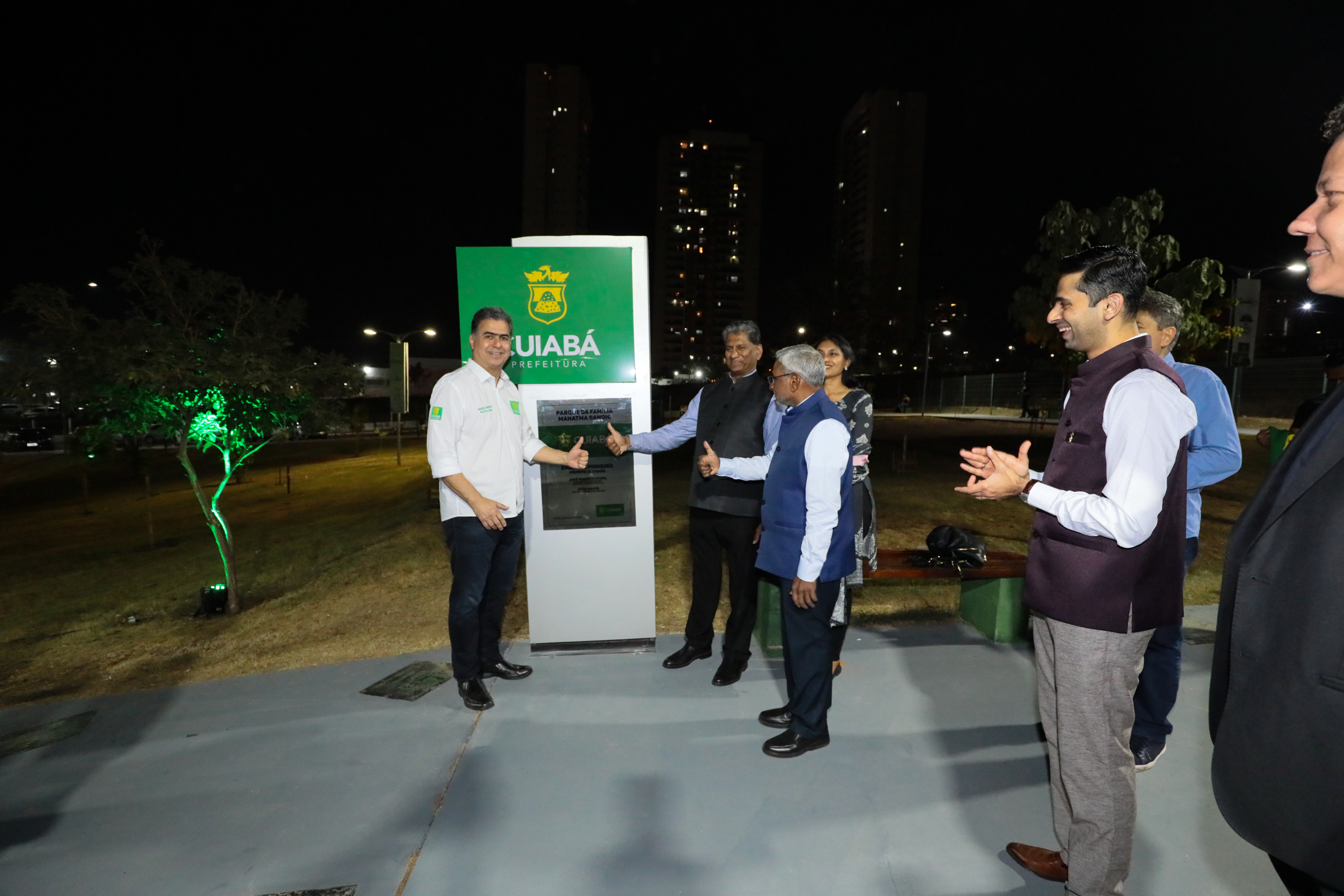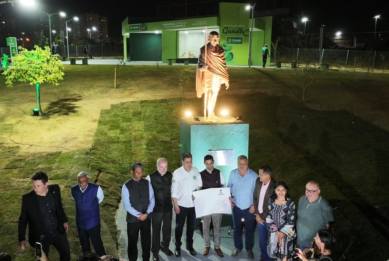 O prefeito de Cuiabá, Emanuel Pinheiro, inaugurou o memorial e a estátua em homenagem a Mahatma Gandhi no Parque da Família, na noite desta quinta-feira (26). A solenidade contou com a presença do vice-ministro de Relações Econômicas da Índia, Dammu Ravi, do embaixador da Índia, Suresh Reddy, acompanhado de sua esposa Sneha Reddy, e do Dr. Umesh Mukhi, representante do país asiático na capital mato-grossense.