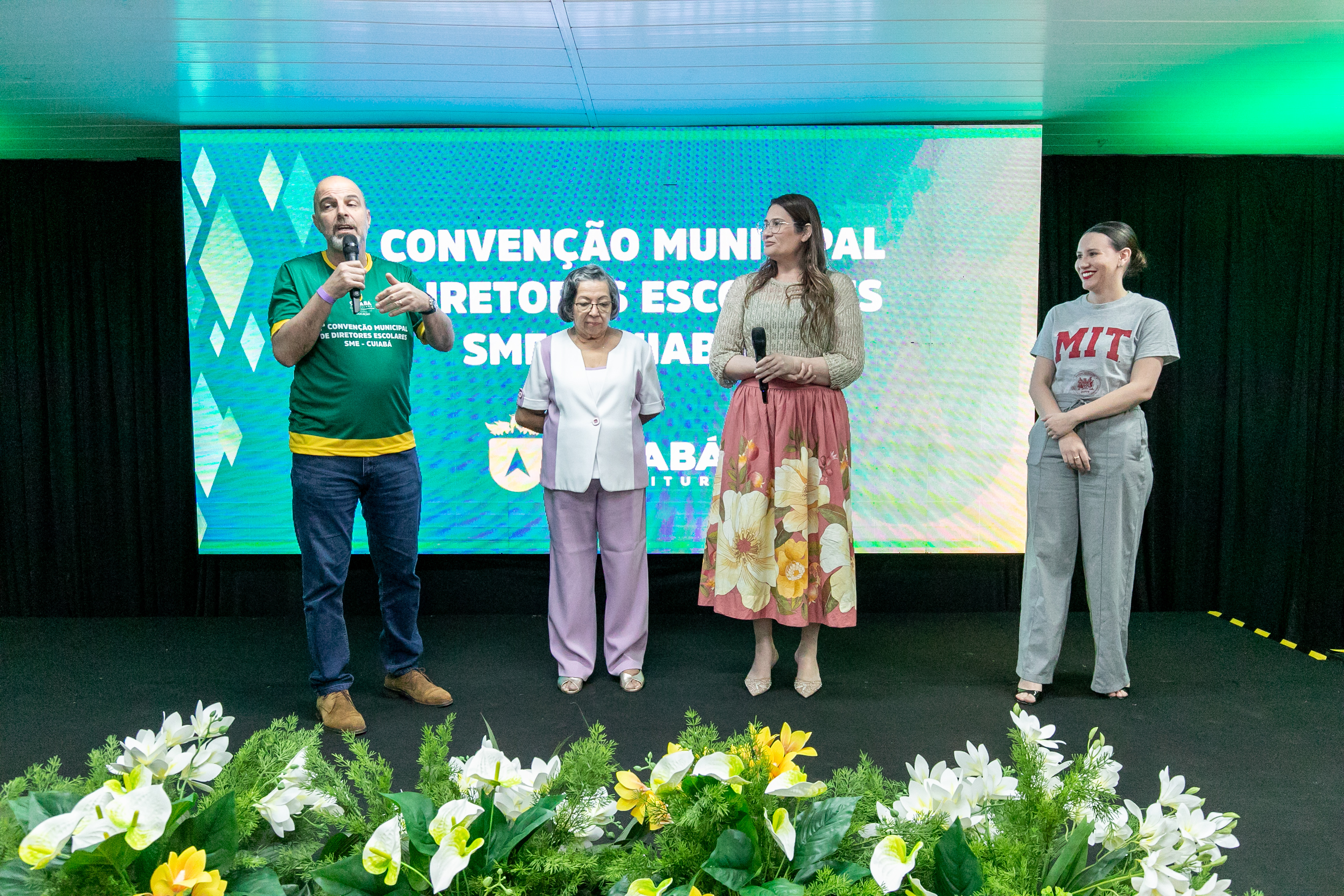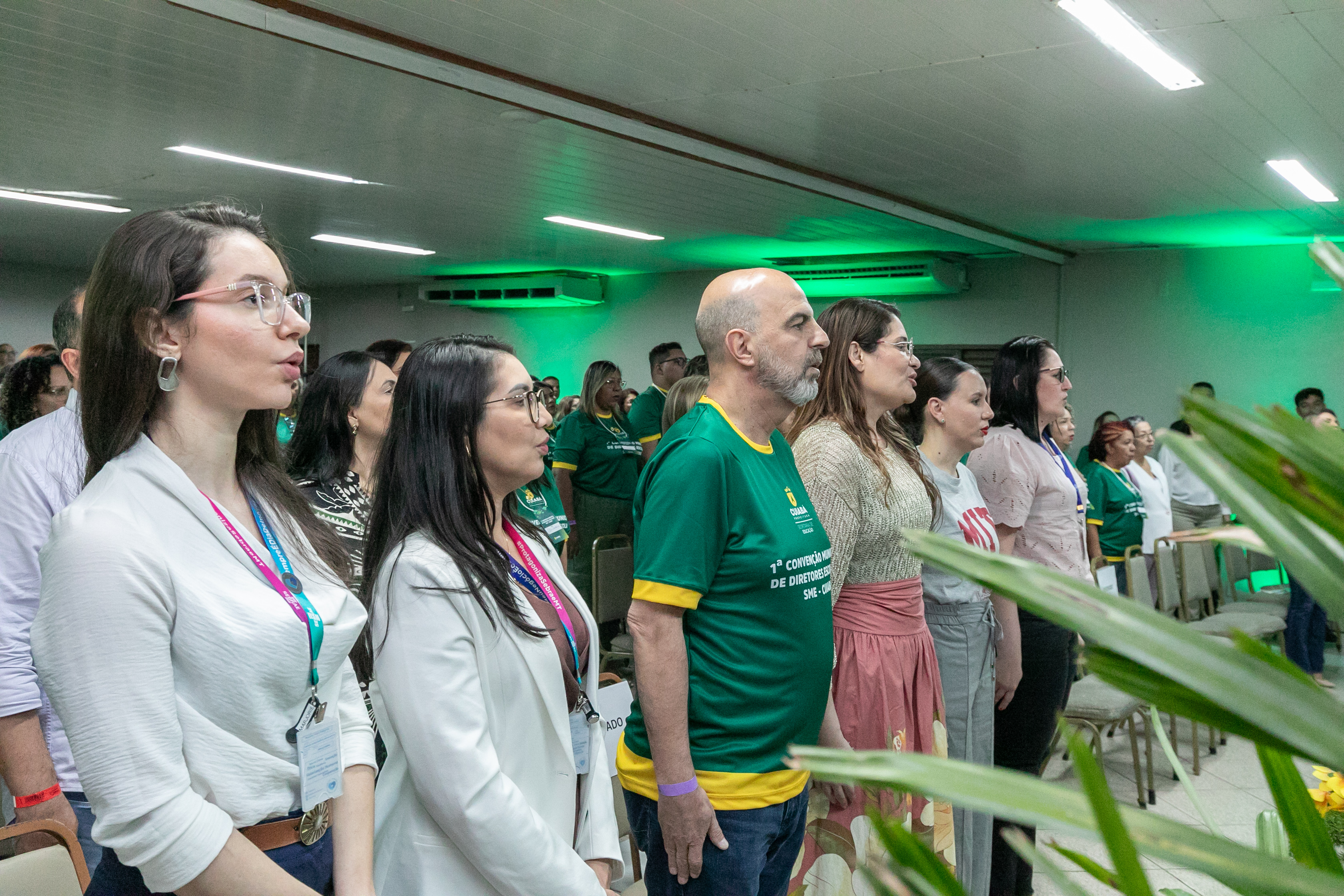 A foto ilustra o secretário Amauri Monge, vestido com camisa verde e detalhe amarelo que exibe a logotipo da Prefeitura de Cuiabá e letras que compõem a palavra "1ª Convenção Municipal de Diretores Escolares - SME Cuiabá". Ao lado, estão três mulheres. Todos estão em posição de marcha para ouvir o hino nacional.