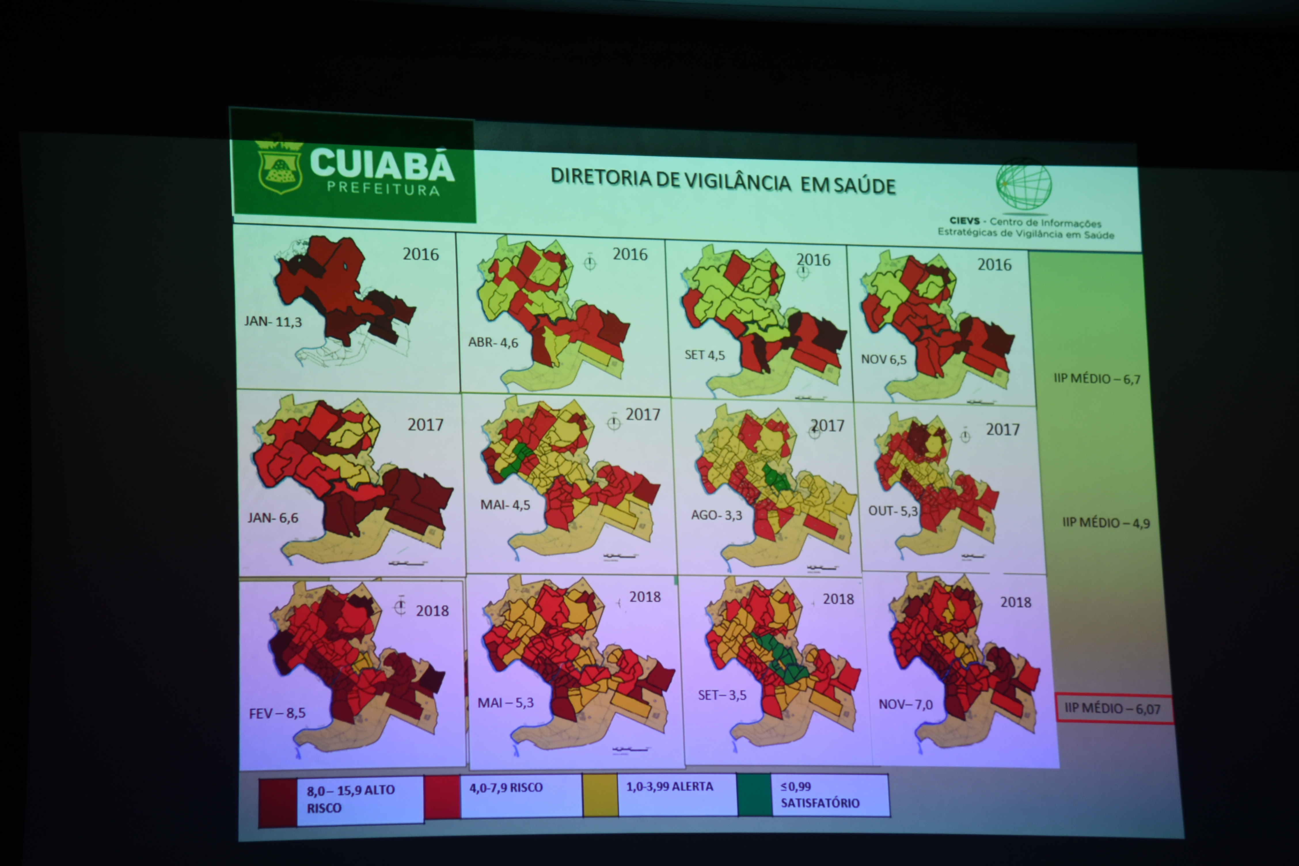 “Embora o IIP venha apresentando reduções nos últimos anos, os números ainda são considerados preocupantes, segundo categorização estabelecida pelo Ministério da Saúde. Na última pesquisa, divulgada em janeiro deste ano, onde foram inspecionados 11,1 mil imóveis, 15,4% dos estratos (cada estrato corresponde a 12 bairros) estão em situação de alto risco (8,0 a 15,9), 61,6% em risco (4,0 a 7,9) e 23 % em alerta (1,0 a 3,99). Já o LIRAa do mesmo período, aponta que 38% dos estratos estavam em situação de altíssimo risco. Não houve estratos com situação satisfatória (0 a 0,99) em Cuiabá e a região Sul da Capital é a que detém os maiores índices”, frisou.