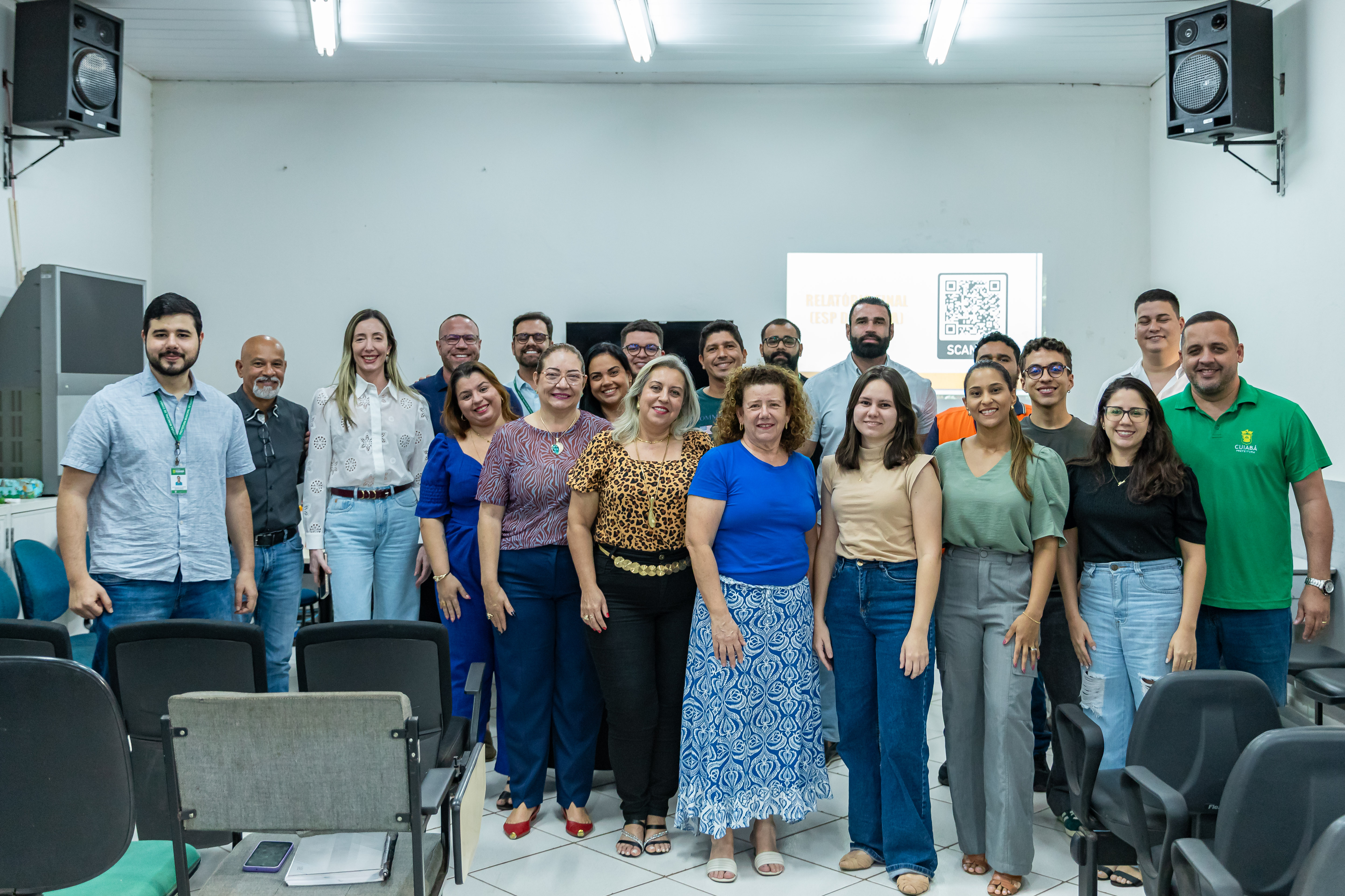 A imagem ilustra um grupo de servidores posando para foto durante a reunião de encerramento do Comitê de Operações Emergenciais (COE). A cena apresenta diversas cores e ocorre em uma sala com paredes brancas.