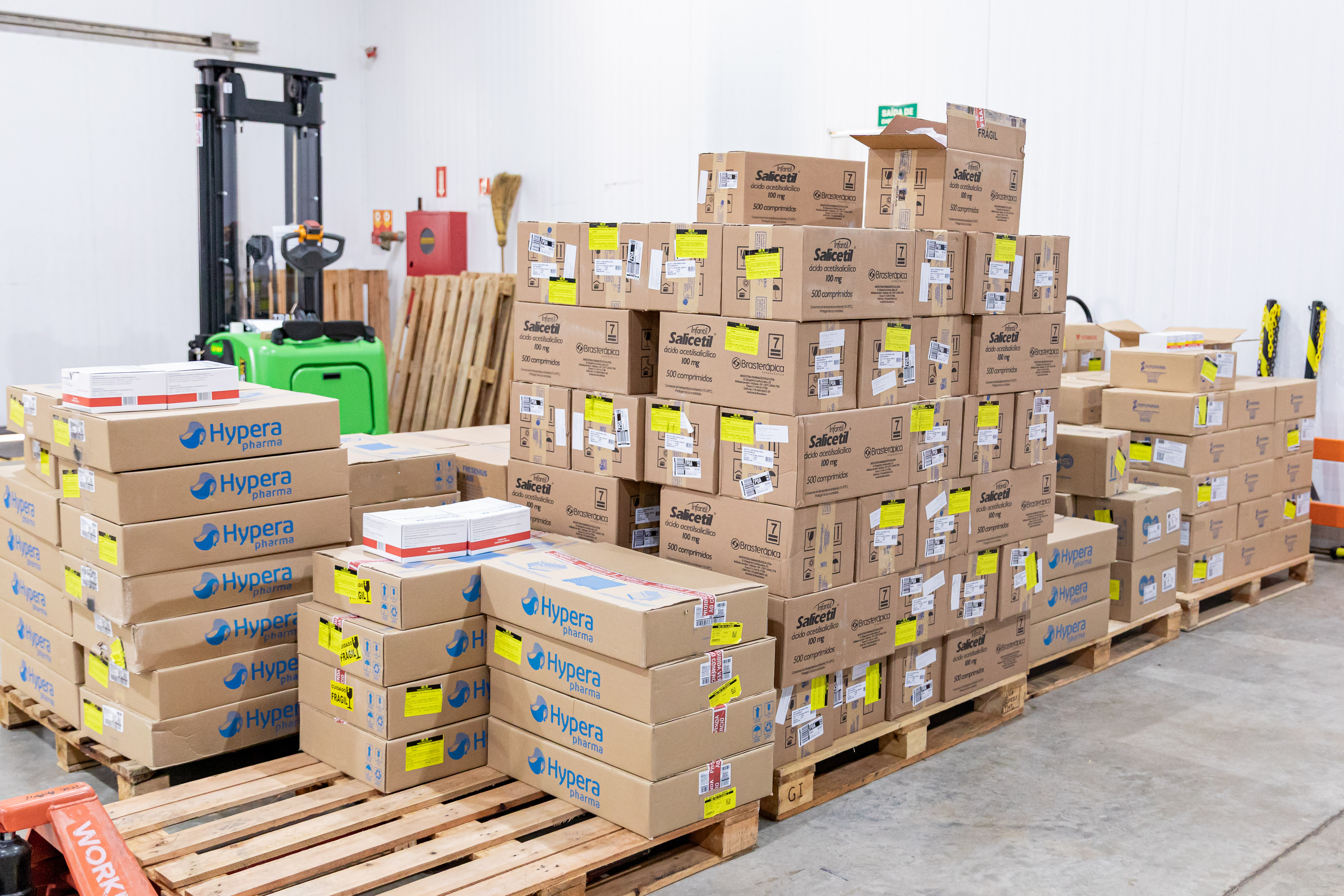 A imagem mostra alguns medicamentos posicionados sobre caixas de papelão.