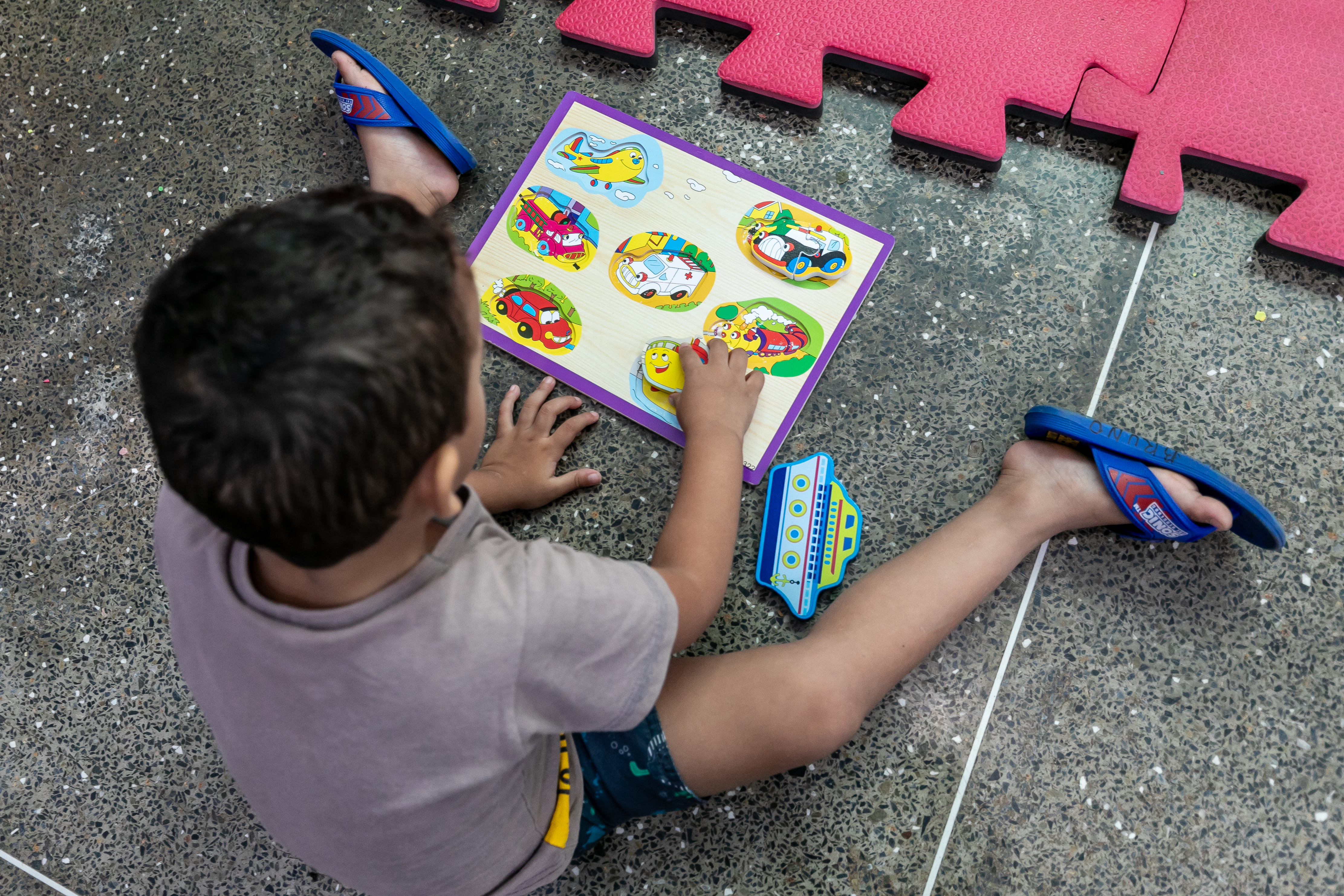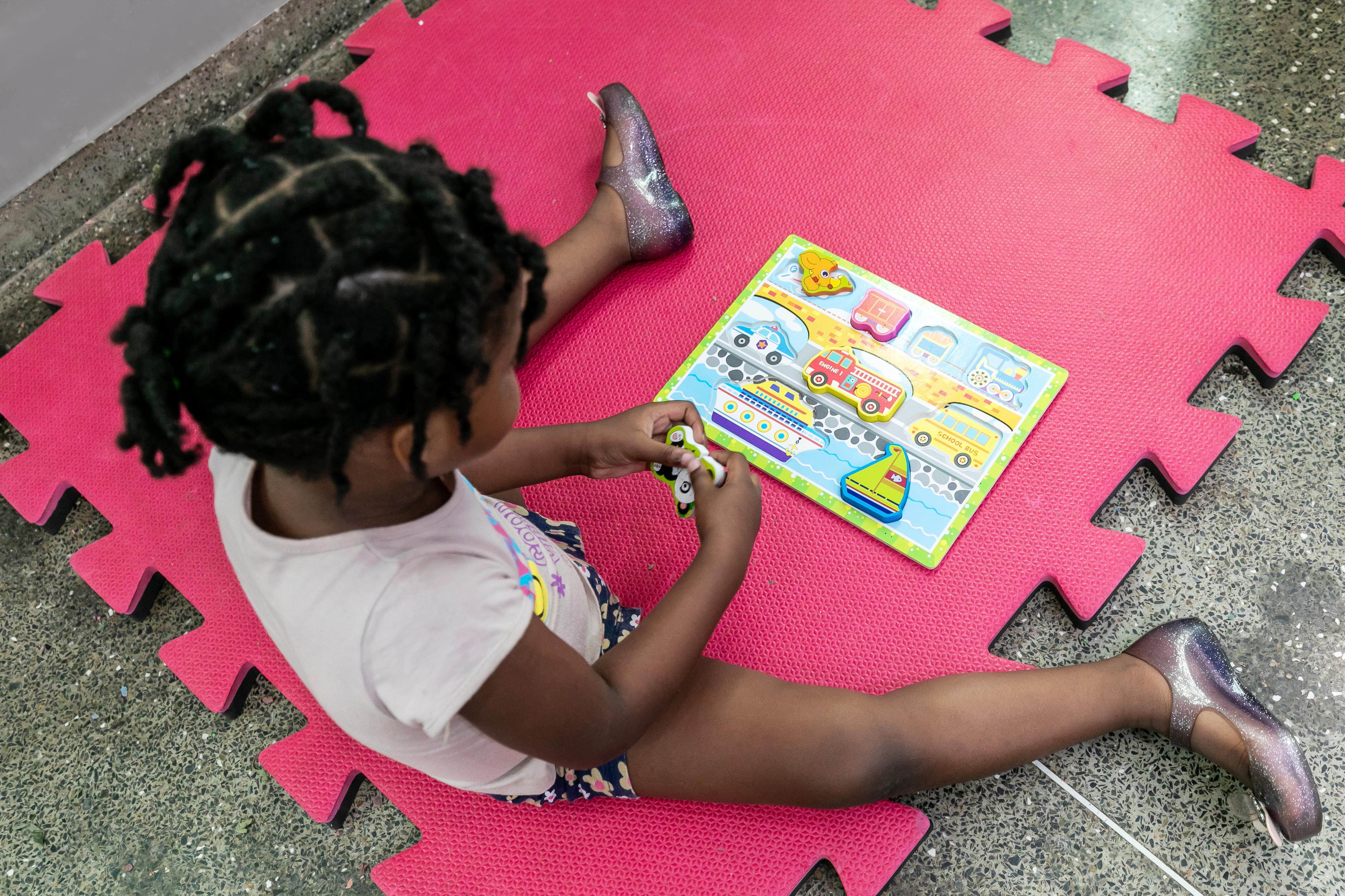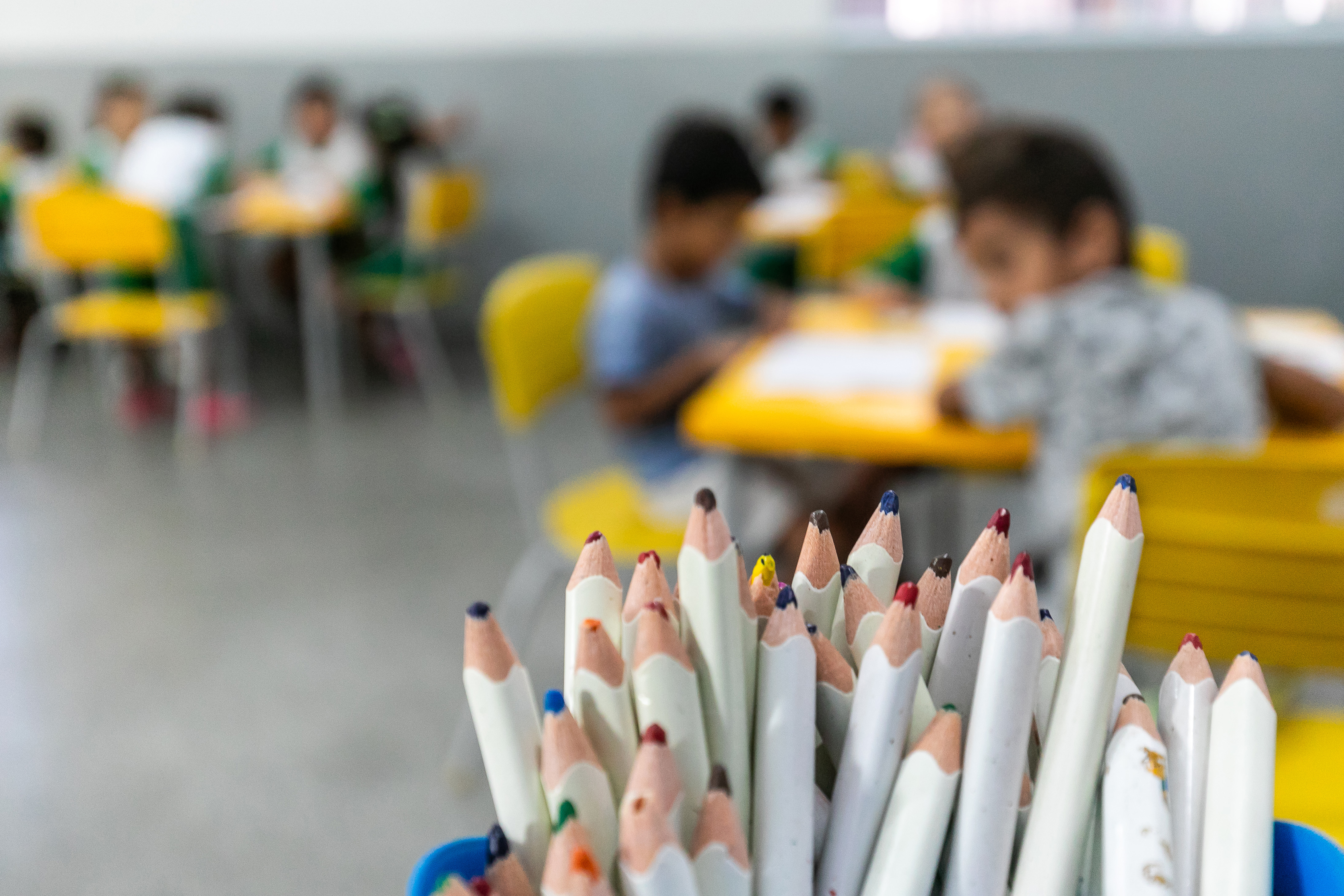 A imagem principal mostra várias crianças desenhando em uma mesinha de escola amarela. Todas estão uniformizadas e concentradas em seus afazeres. Na galeria há outras imagens ilustrativas com lápis de cor e outros alunos desenhando.