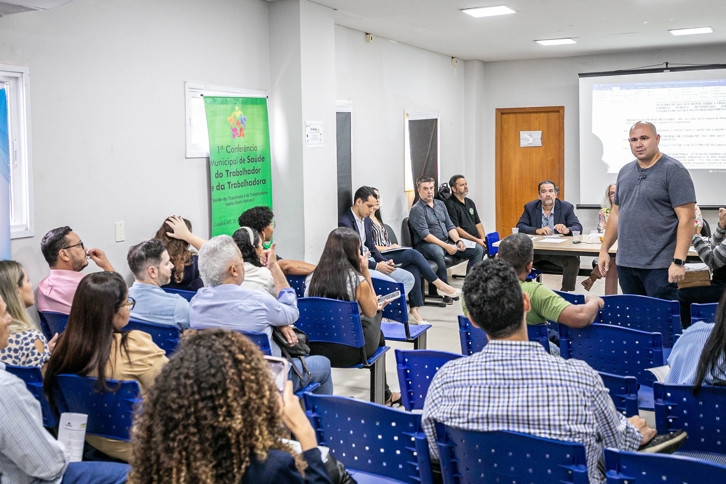 A imagem mostra o prefeito durante uma apresentação/reunião no auditório da Secretaria Municipal de Saúde de Cuiabá. Todos estão sentados enquanto o prefeito realiza seu discurso para os membros do Conselho Municipal de Saúde de Cuiabá. A sala é branca e as cadeiras do auditório são azuis.