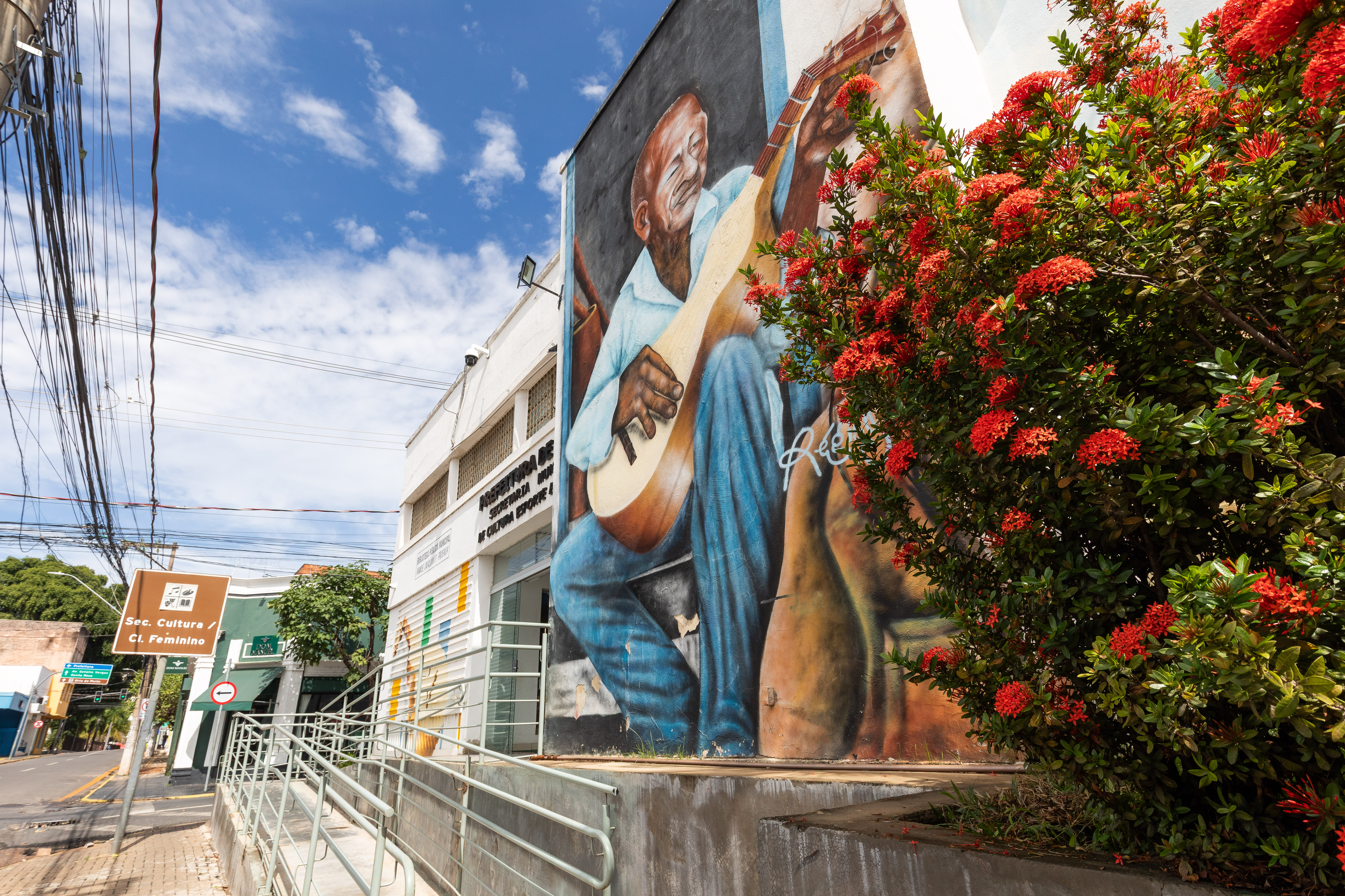 A imagem mostra a fachada da Secretaria Municipal de Cultura de Cuiabá. Na lateral há uma pintura de homem com a viola de cocho e também uma planta natural com flores vermelhas.