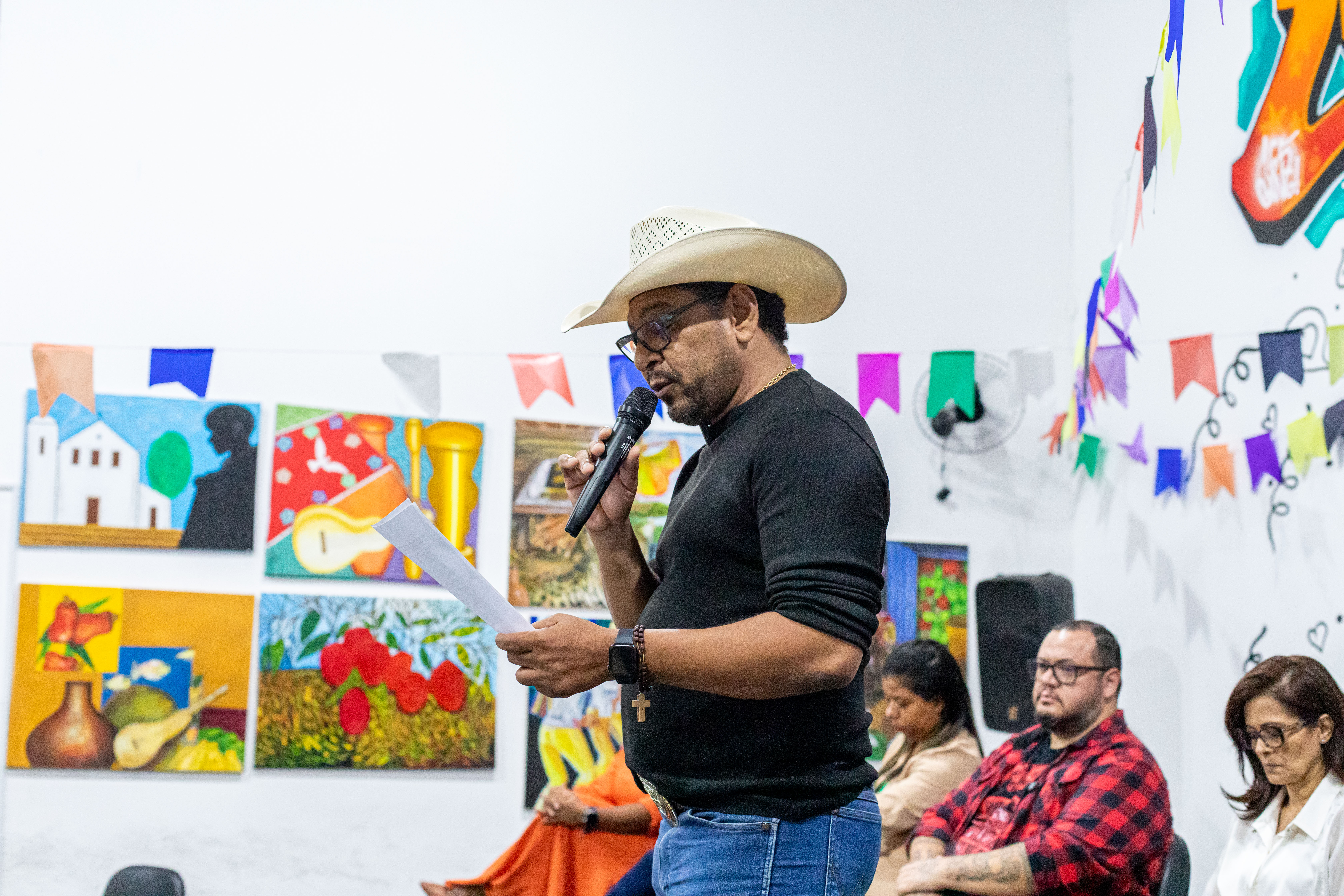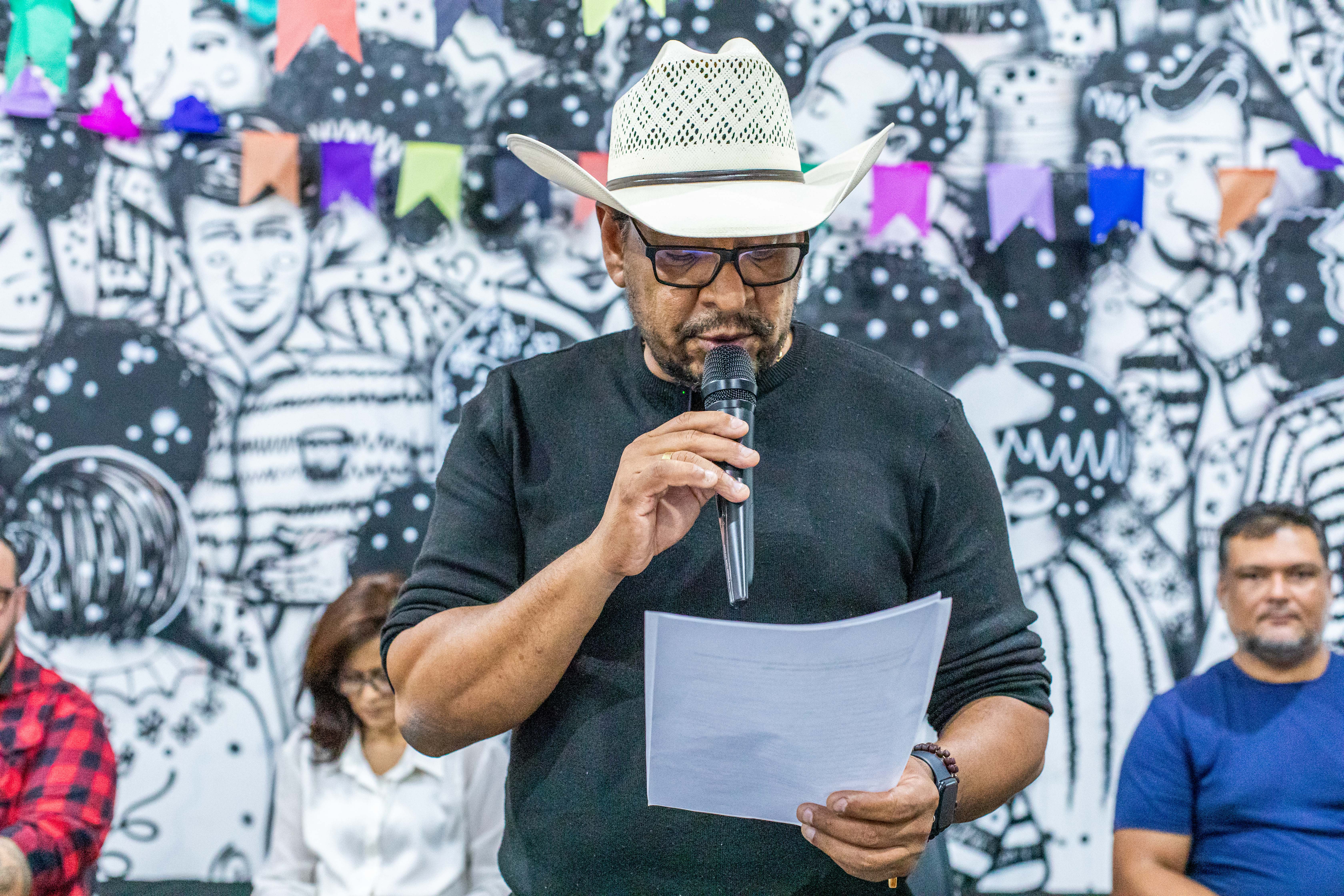 A foto mostra o secretário municipal de Cultura, Johnny Everson discursando durante o evento na Secretaria Municipal de Cultura.