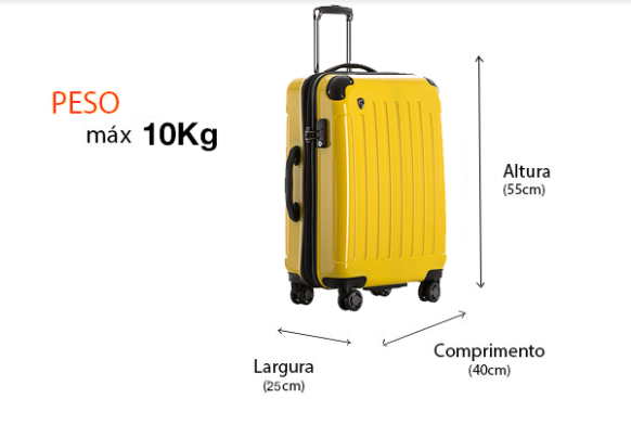 Caso as medidas permitidas ultrapassem o peso máximo de 10 kg e desrespeitar as seguintes dimensões máximas: 55 cm x 35 cm x 25 cm, o passageiro terá que despachar a bagagem e pagar o excedente.