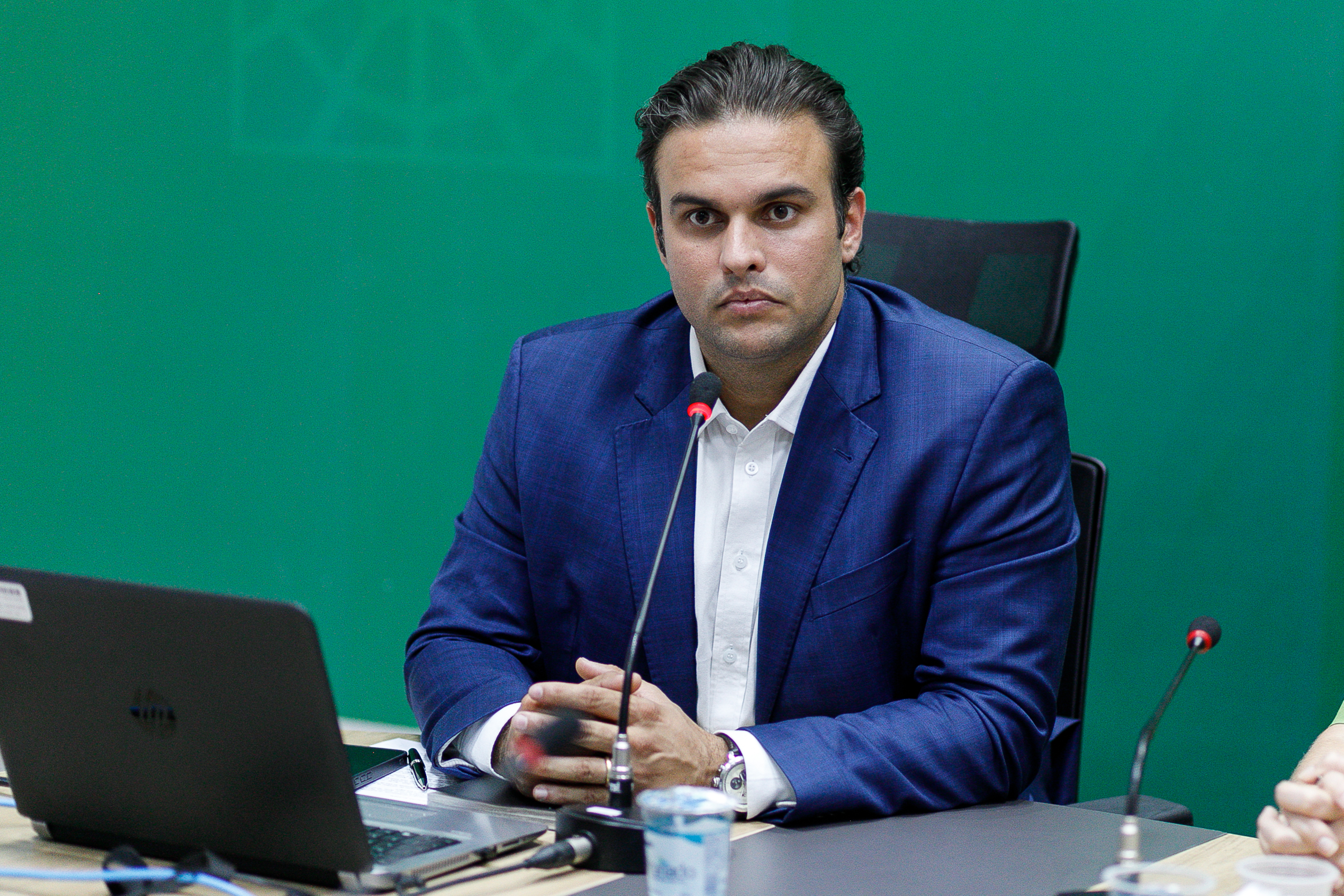 A imagem mostra o secretário Murilo, sentado em uma mesa de reunião com microfone individual. Ele usa termo azul, camisa branca e tem os cabelos penteados para trás.