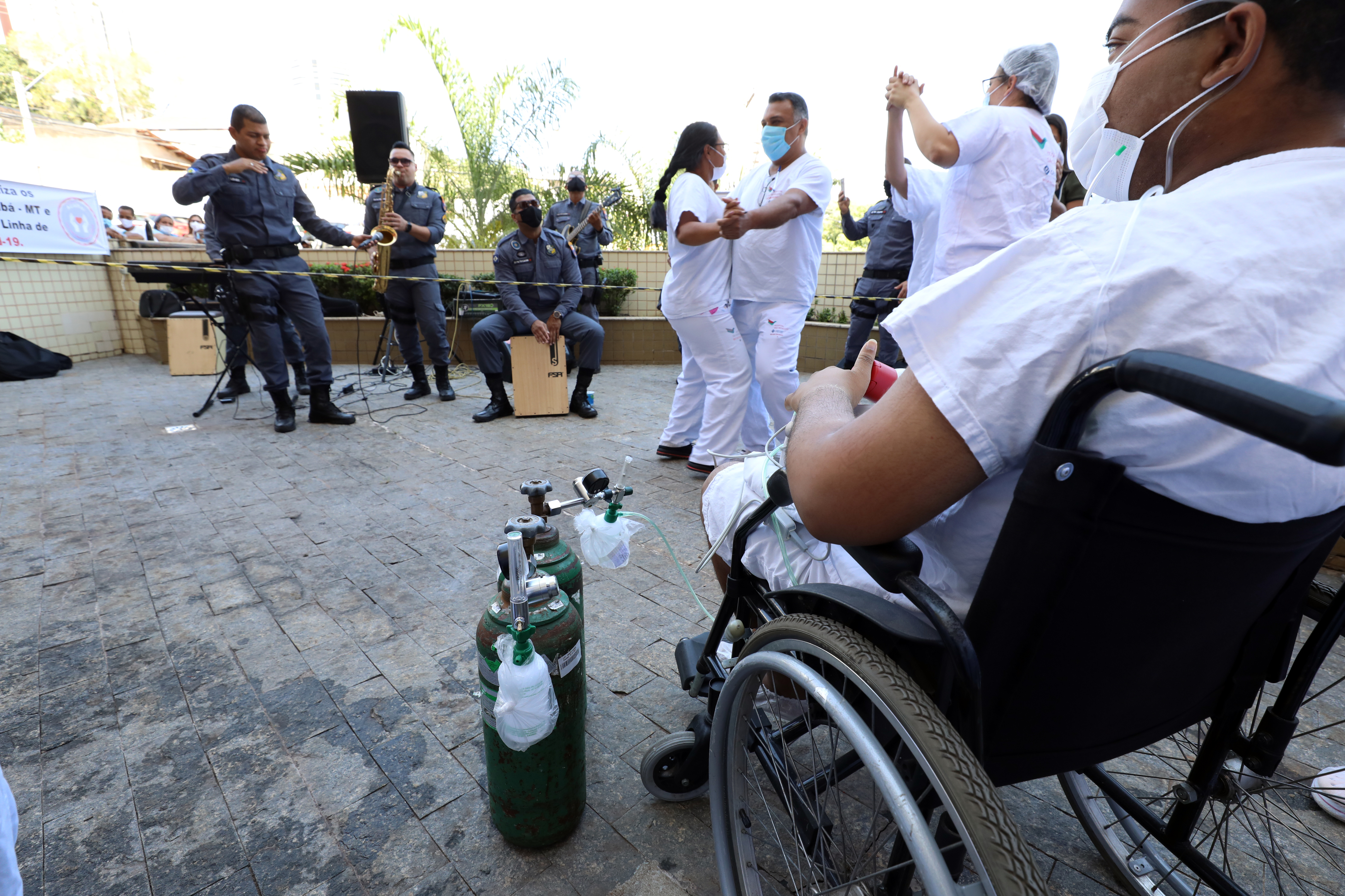 O enfermeiro Benedito de Arruda, que trabalha no Hospital São Benedito desde 2015, conta que a apresentação do Corpo Musical da PM foi uma ótima iniciativa. “Foi muito interessante fugir um pouco da realidade dessa pandemia, que não é fácil. É um momento de alegria pra equipe de enfermagem”, disse. Ele conta que é pai de coração de dois sobrinhos que ajuda a criar e que, por conta do trabalho, acaba não tendo muito tempo para relaxar com a família. “Nós ficamos mais tempo fora de casa do que com a família. E isso é um alívio mental pra gente”, conta.