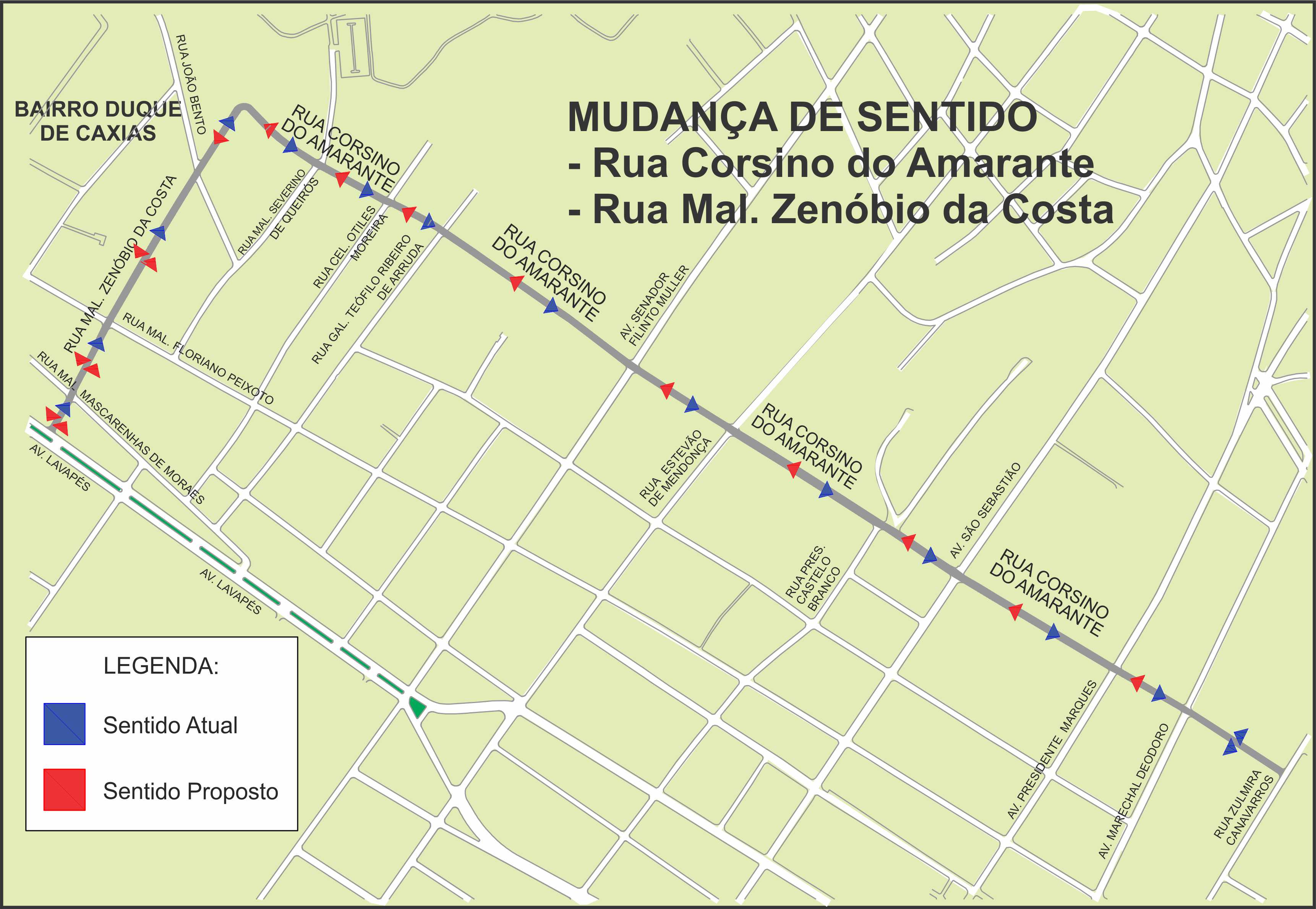 Para melhorar o acesso a vias importantes, como a Estevão de Mendonça, Presidente Marques e a Miguel Sutil, a Prefeitura de Cuiabá vai promover a partir de segunda-feira (26) alterações no sentido das ruas Marechal Zenóbio da Costa e Corsino do Amarante, no Bairro Duque de Caxias II (e parte dos bairros Quilombo e Centro).