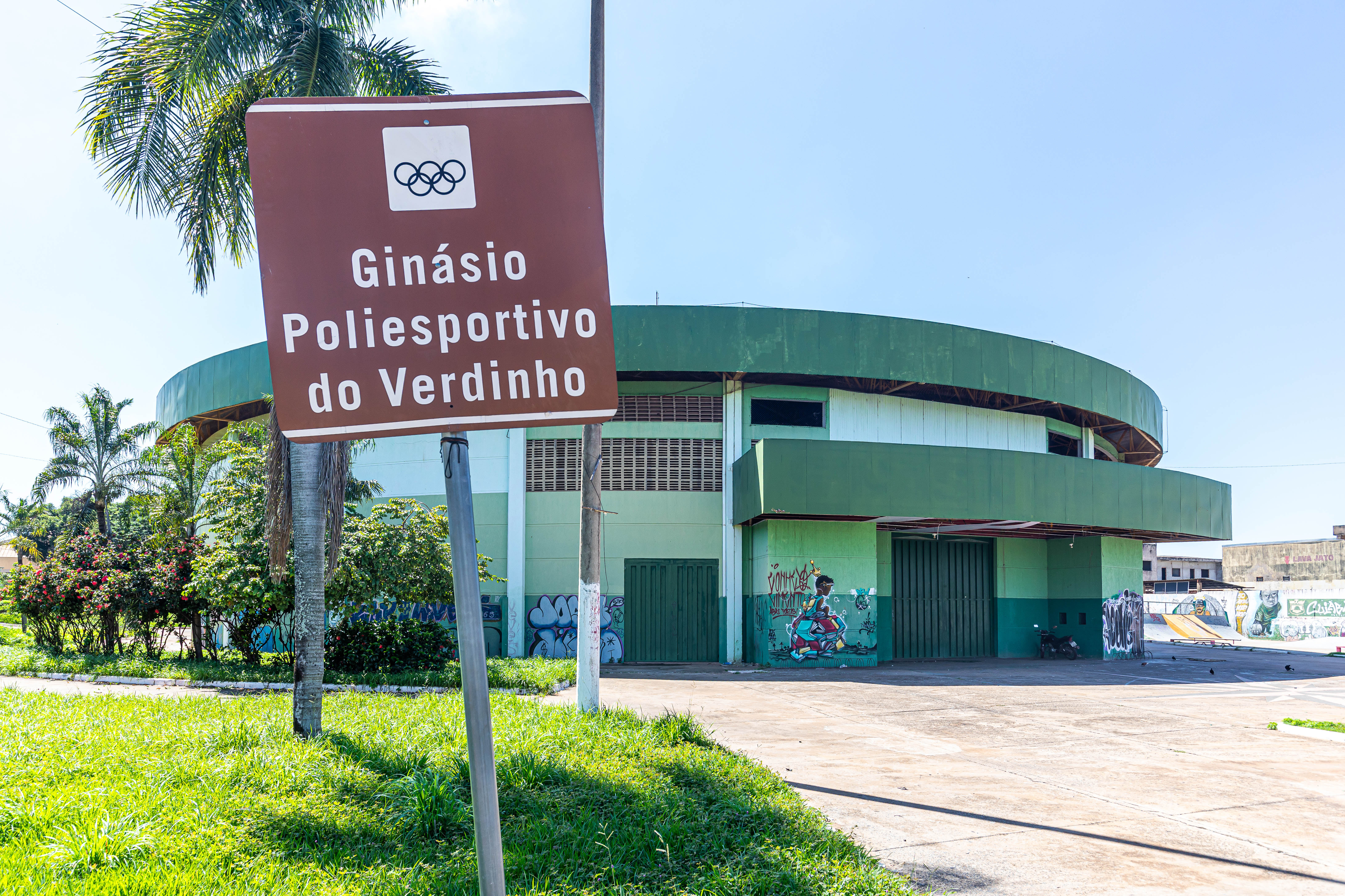 A imagem mostra a fachada do Ginásio Poliesportivo do Verdinho, no CPA I.