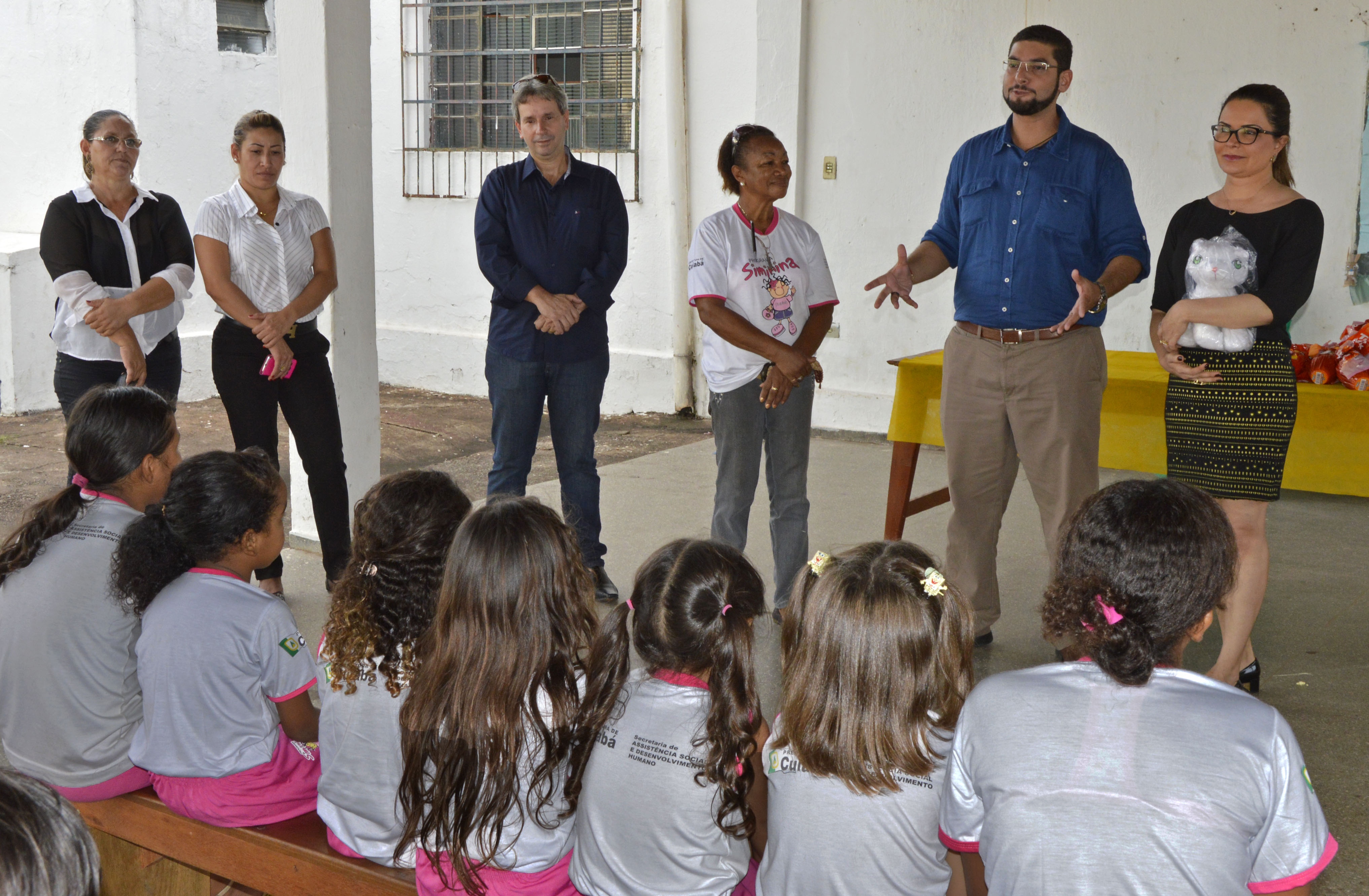 “Meu pai trabalha em uma empresa que faz urso e eu disse para ele que a tia Virgínia vinha hoje e que eu queria dar um presente para ela e ele me deu esse urso. É para agradecer por tudo que eu aprendi aqui no Siminina”, afirma a menina que é atendida pelo programa no bairro Bela Vista.