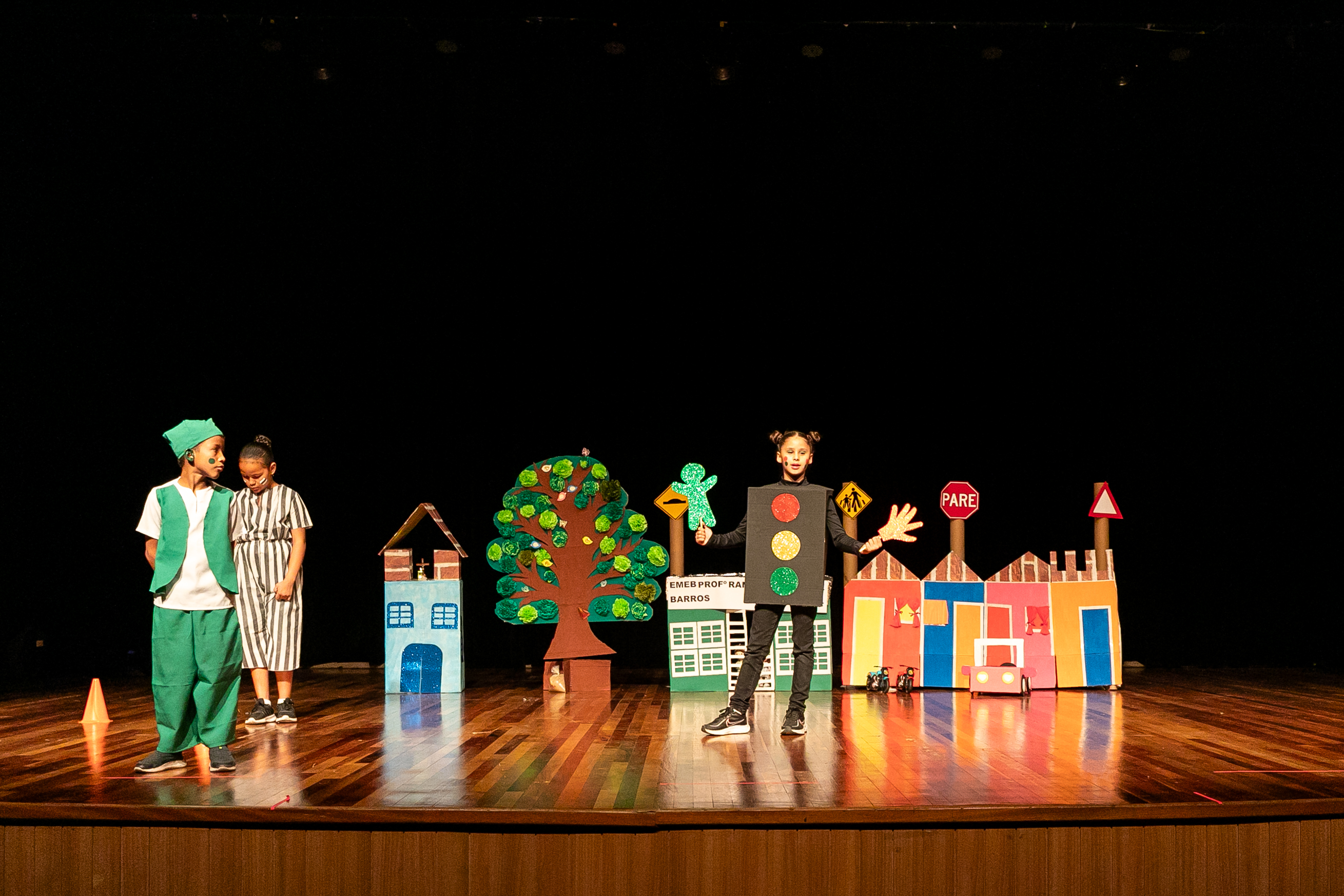 Estudantes matriculados na escola pública de Cuiabá, Ranulpho Paes de Barros, com idades entre 7 e 8 anos, foram protagonistas, na manhã desta terça-feira (30), da peça de teatro “Trânsito Mágico da Cidade Encantada”, apresentada no Cine Teatro. Trata-se da segunda etapa estadual da 20ª edição do Festival Temático de Teatro para o Trânsito (Fetran).